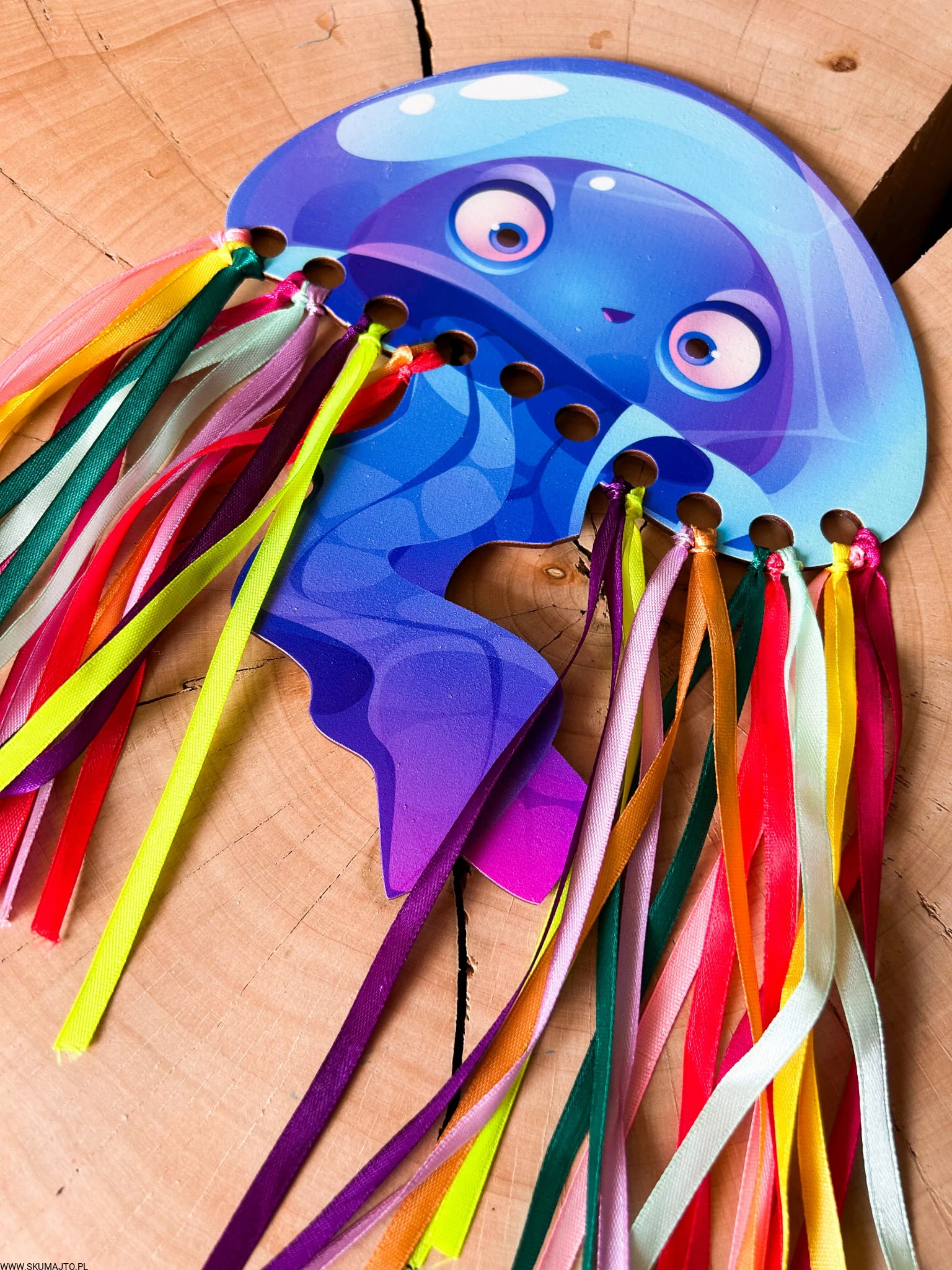 - Dziecko przeplata i wiąże kolorowe wstążki, tworząc piękną meduzę o długości 30 cm. Zestaw zawiera kolorowe wstążki i bawełniany woreczek do przechowywania.