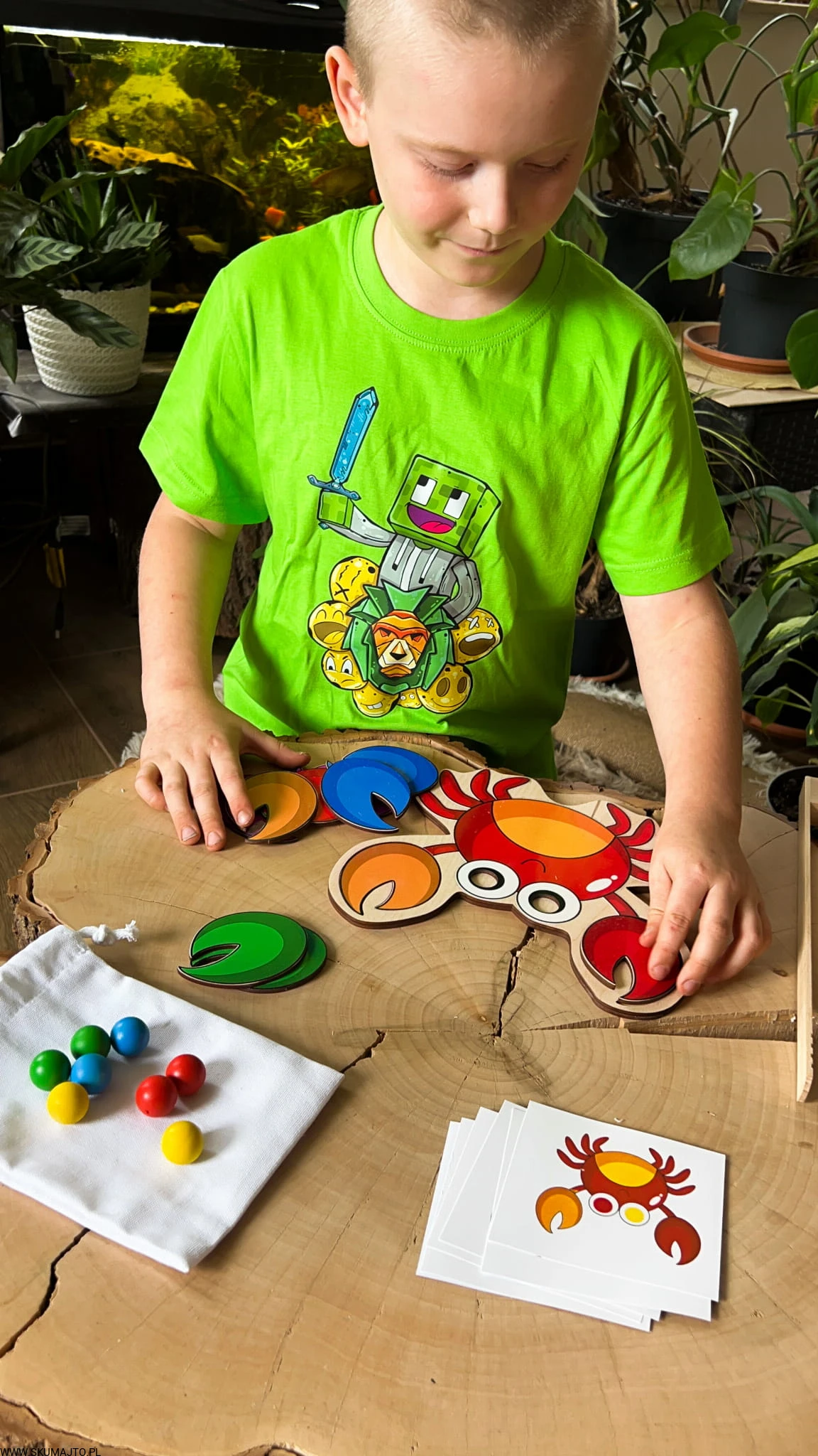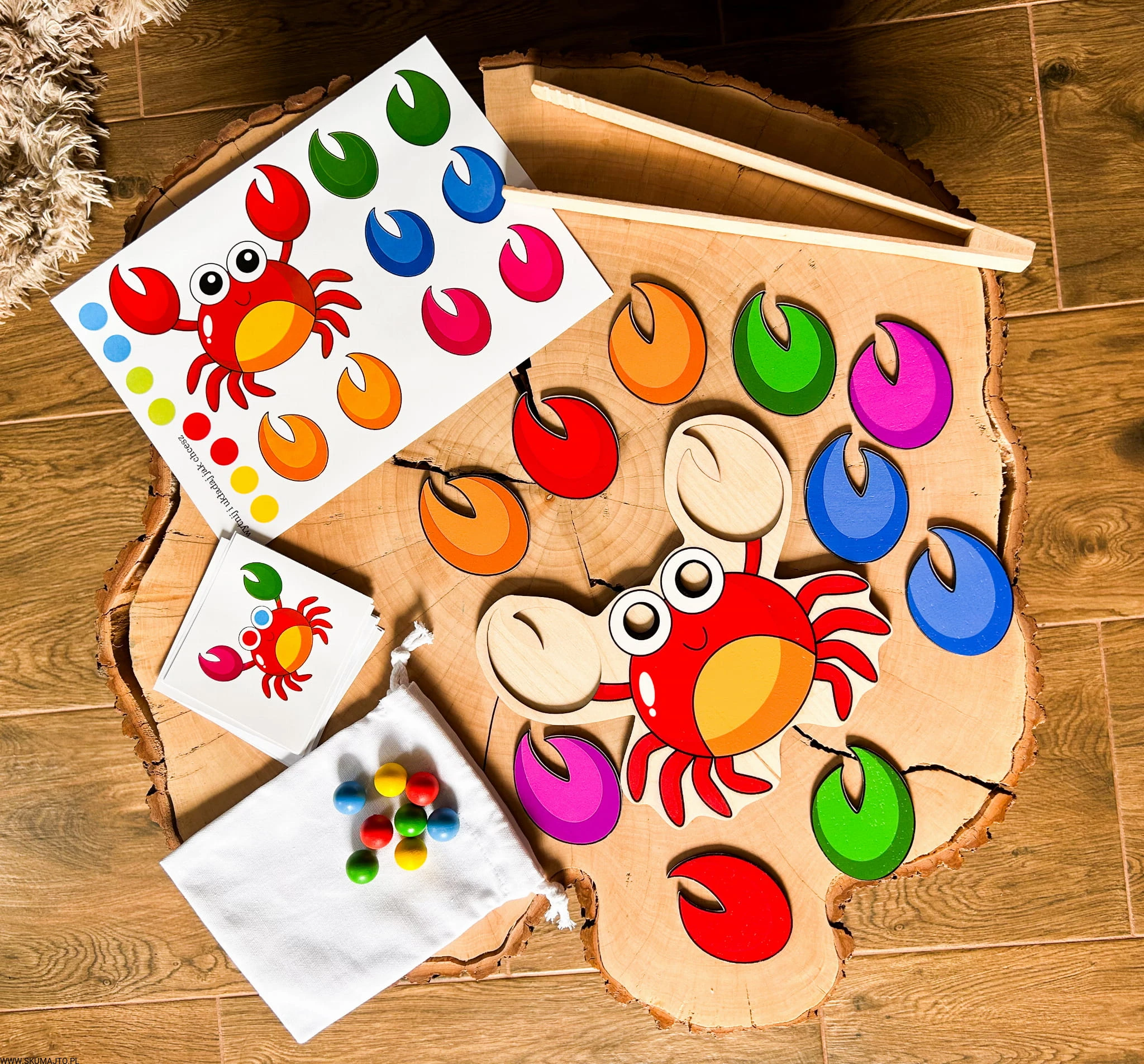 - Dziecko układa szczypce i oczy kraba według wzorów z kart do odwzorowywania. Zestaw zawiera podstawkę, kolorowe elementy do układania i bawełniany woreczek.