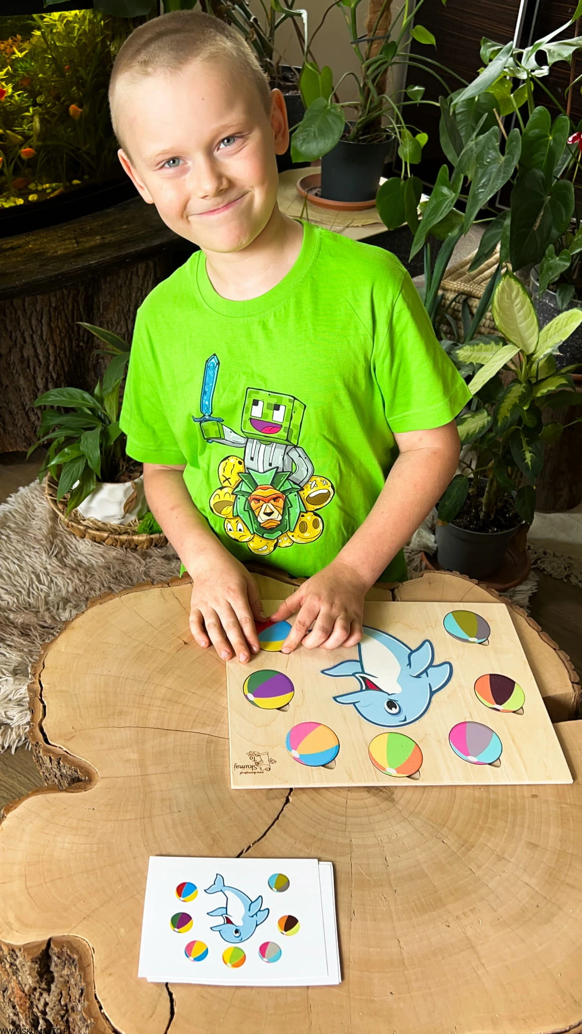 - Dziecko układa kolorowe piłki wokół delfina zgodnie z kartami do odwzorowywania. Zestaw zawiera podstawkę (35x25 cm), 7 piłek i bawełniany woreczek.