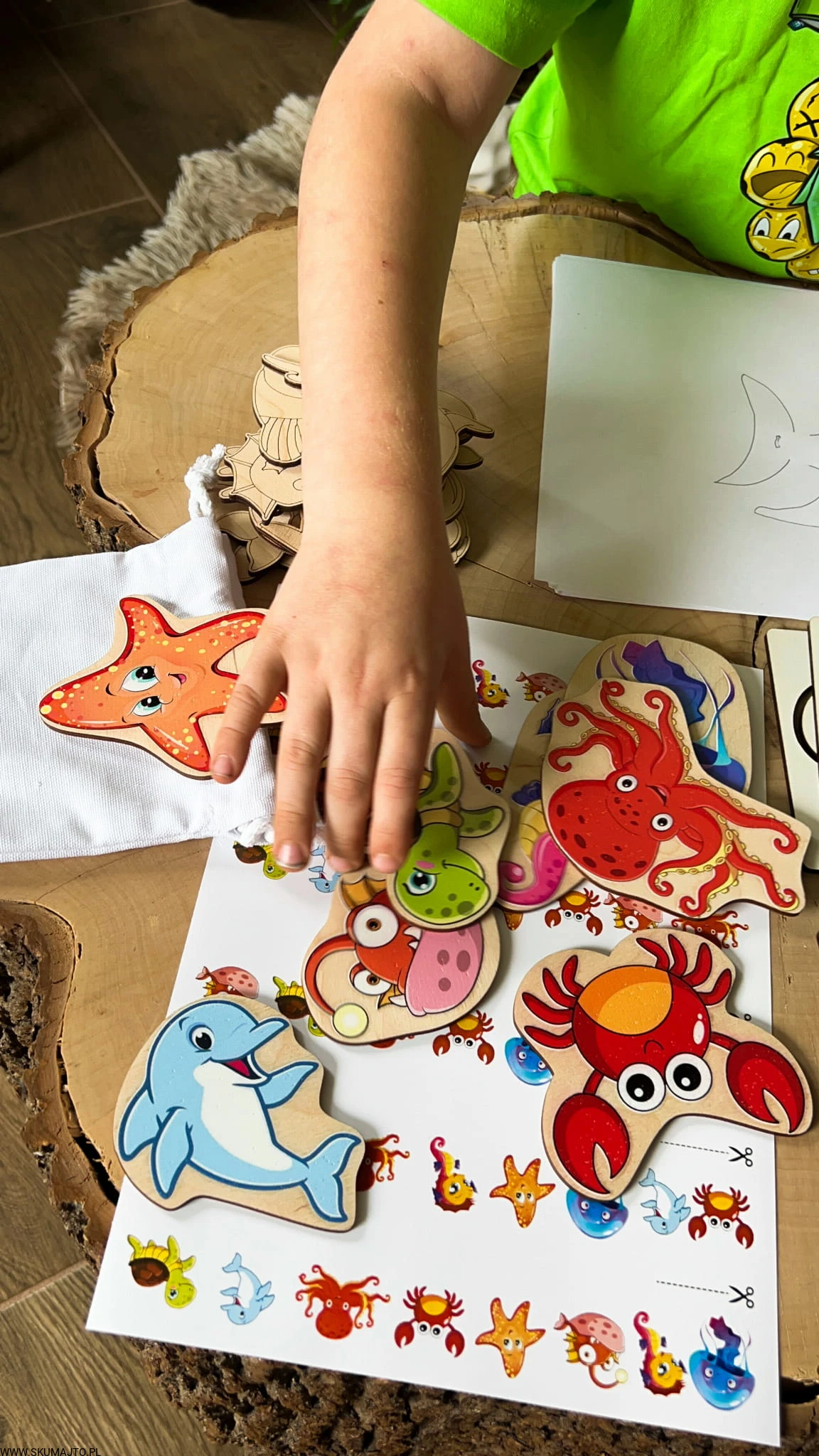 - Zestaw 8 kolorowych zwierząt morskich, każda o długości około 7 cm. Dziecko odwzorowuje zwierzęta według kart do odwzorowywania. W zestawie bawełniany woreczek do przechowywania.
