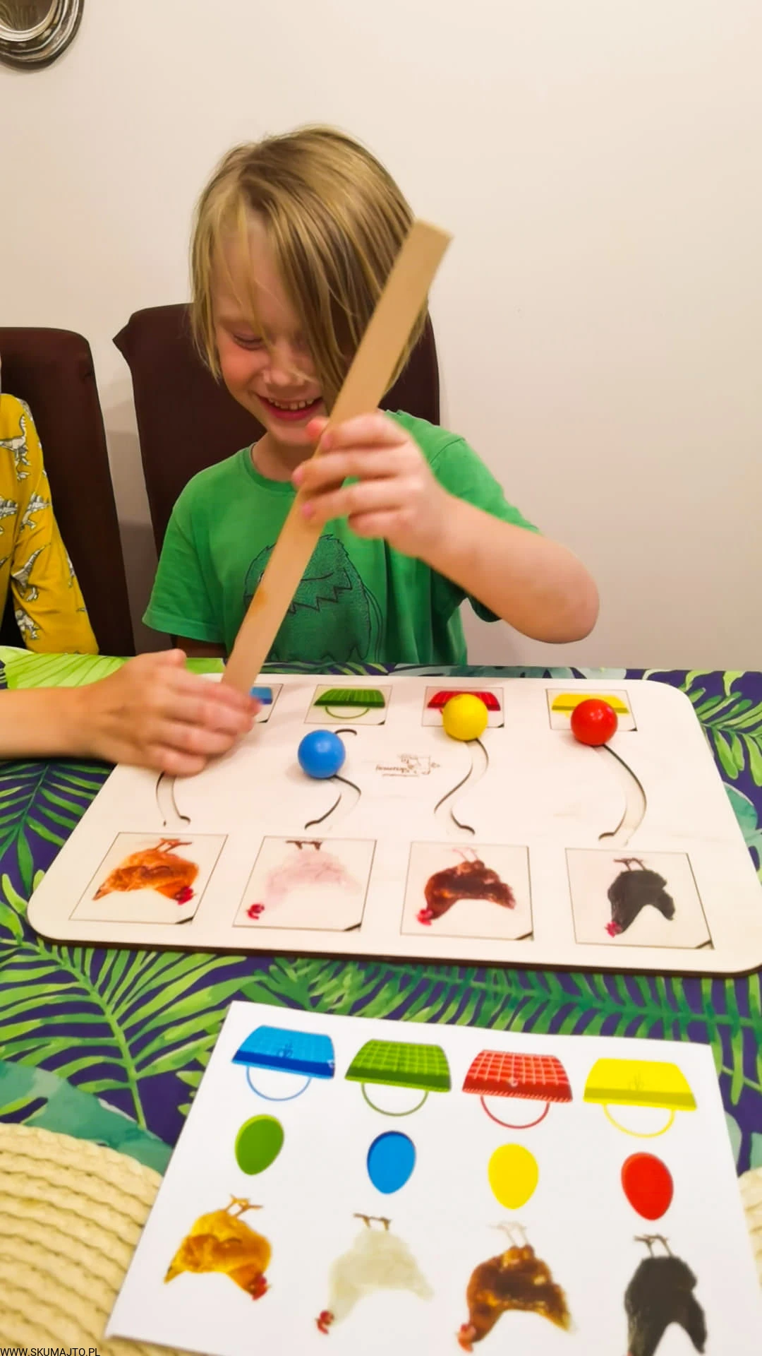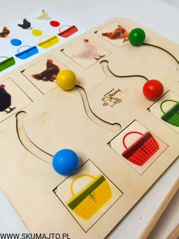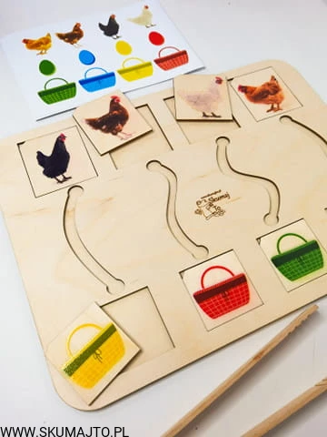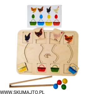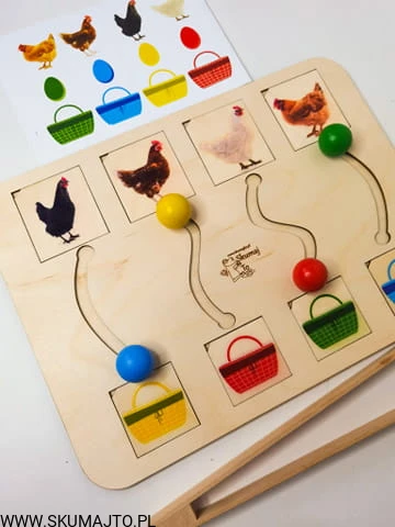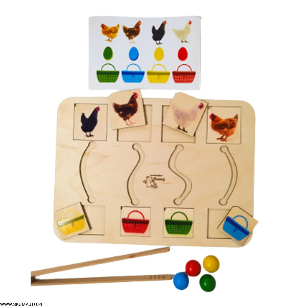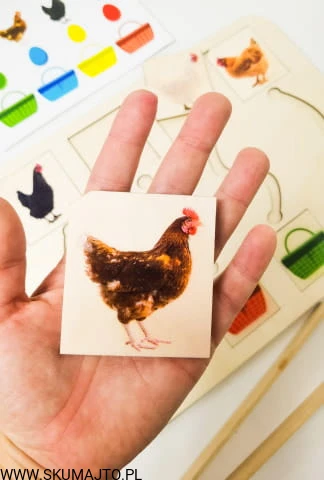 - Układanie Kurek: Zadaniem dziecka jest ułożenie kurek w koszyczkach według wzoru na dołączonych kartach.