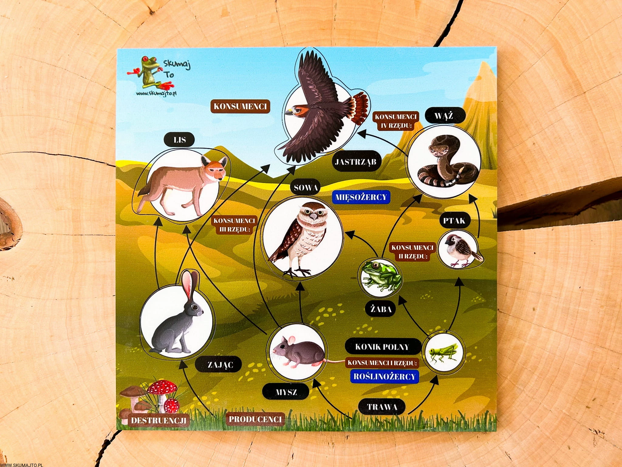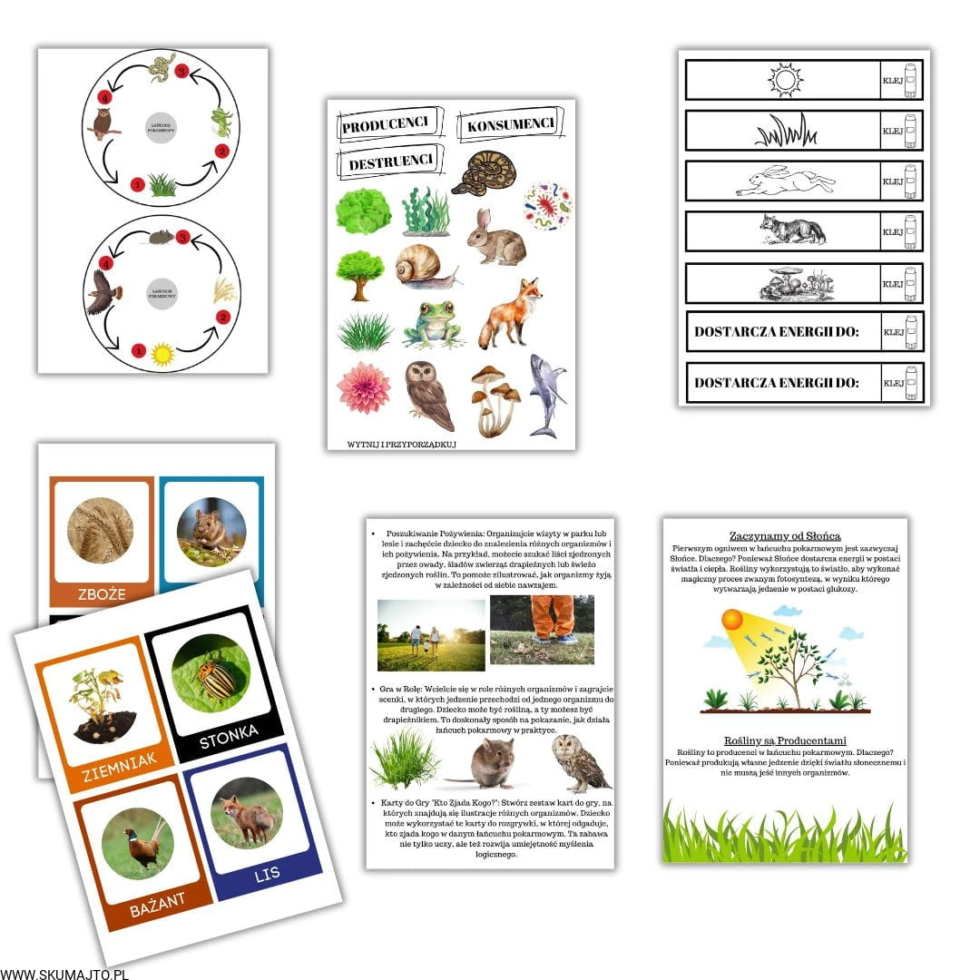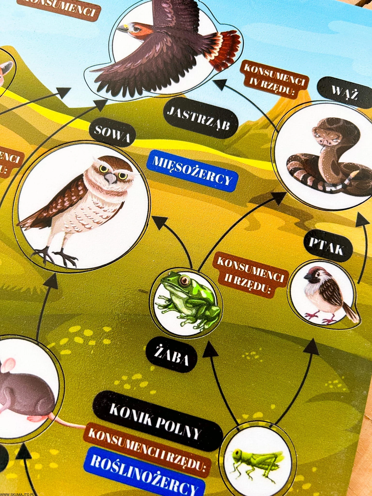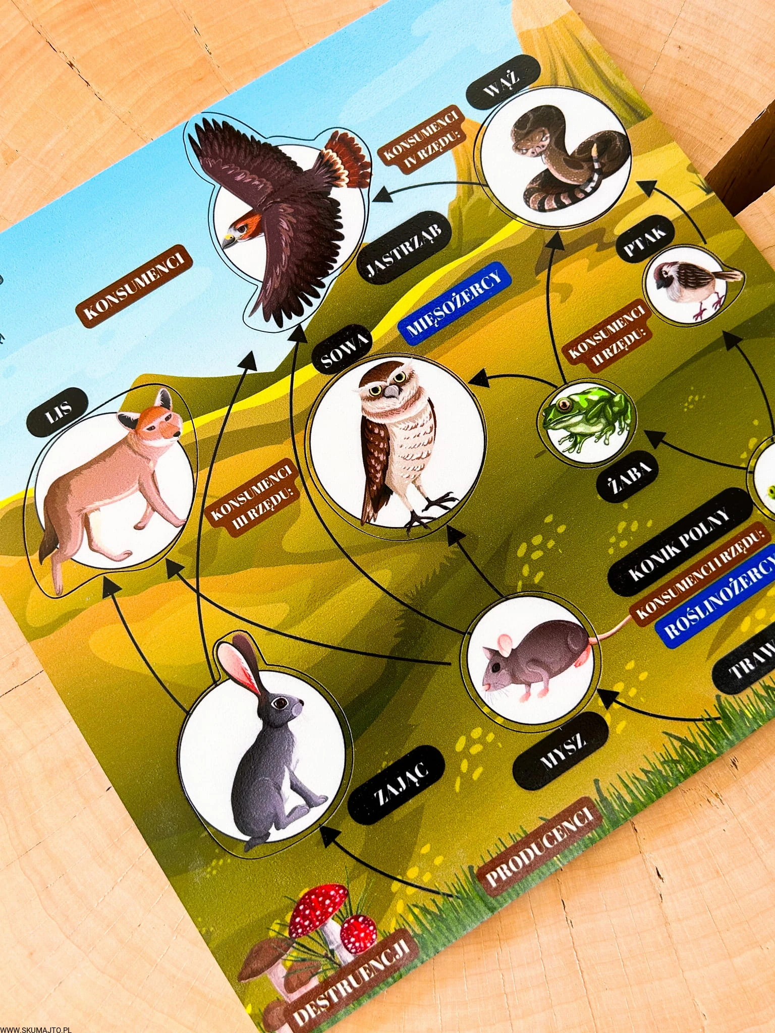 Warto zaznaczyć, że nasza Układanka "Łańcuchy Pokarmowe" oferuje znacznie więcej niż tylko zabawę - w zestawie znajdziesz także karty w wersji PDF, które umożliwiają dalszą eksplorację tematu. Znajdziesz tam informacje na temat przepływu energii w przyrodzie, własny zestaw łańcuchów pokarmowych do skompletowania, karty do gry oraz zadania do wykonania zarówno w domu, jak i podczas wycieczek na świeżym powietrzu.