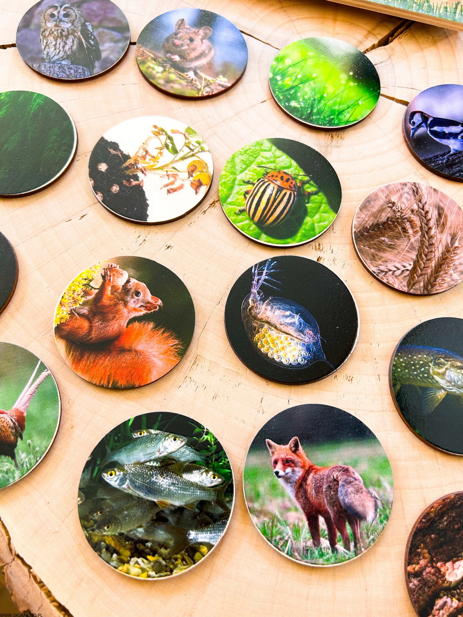 Drewniana podstawa układanki wyposażona w łańcuchy pokarmowe i odpowiednie podpisy to wizualna mapa przyrody, która pomoże Twojemu dziecku zrozumieć, jak organizmy żywe są ze sobą powiązane. Dodatkowo, w zestawie znajduje się 25 drewnianych krążków z nadrukami przedstawiającymi różne elementy łańcucha pokarmowego. Dziecko może układać je i tworzyć własne łańcuchy pokarmowe.