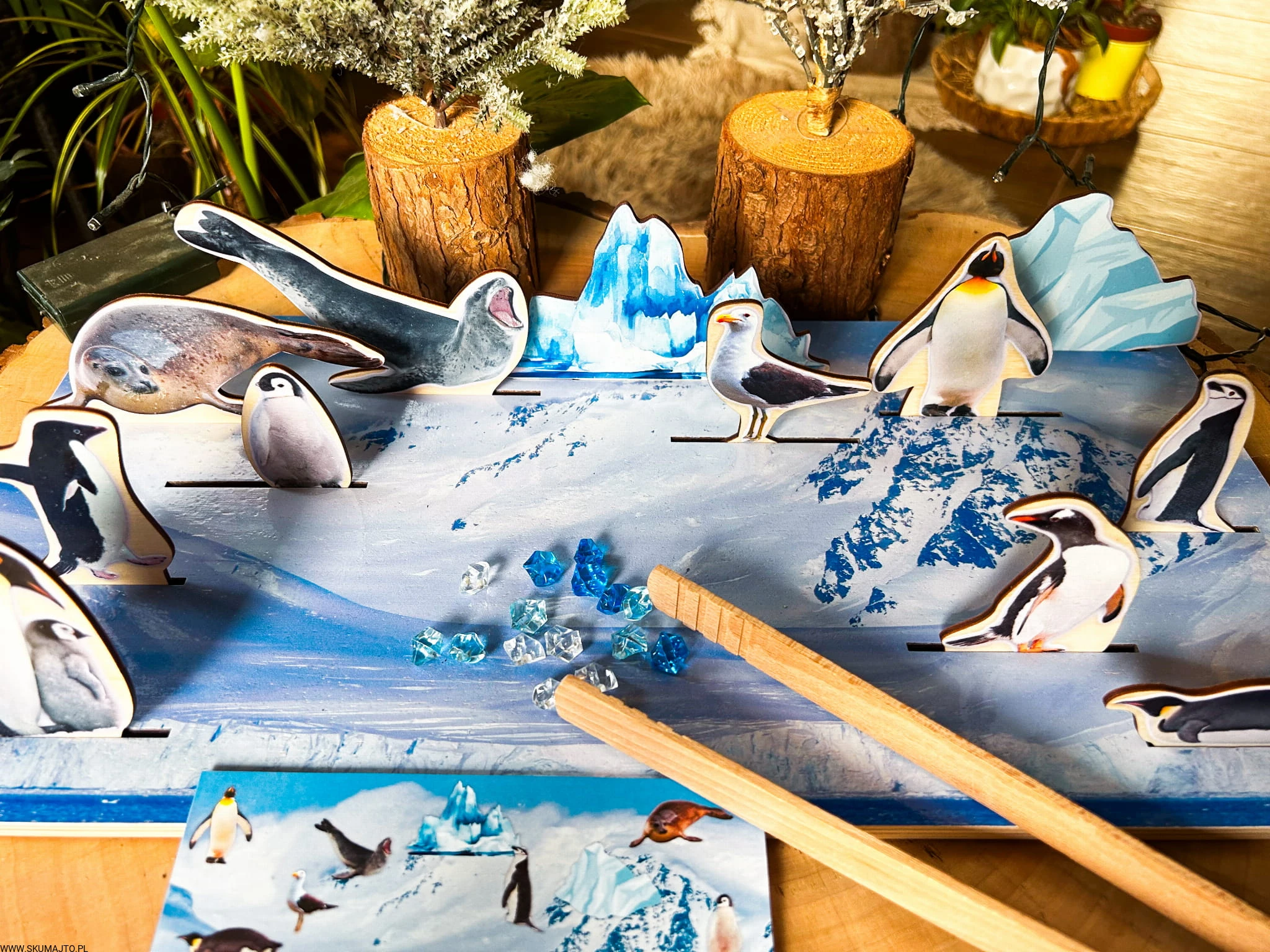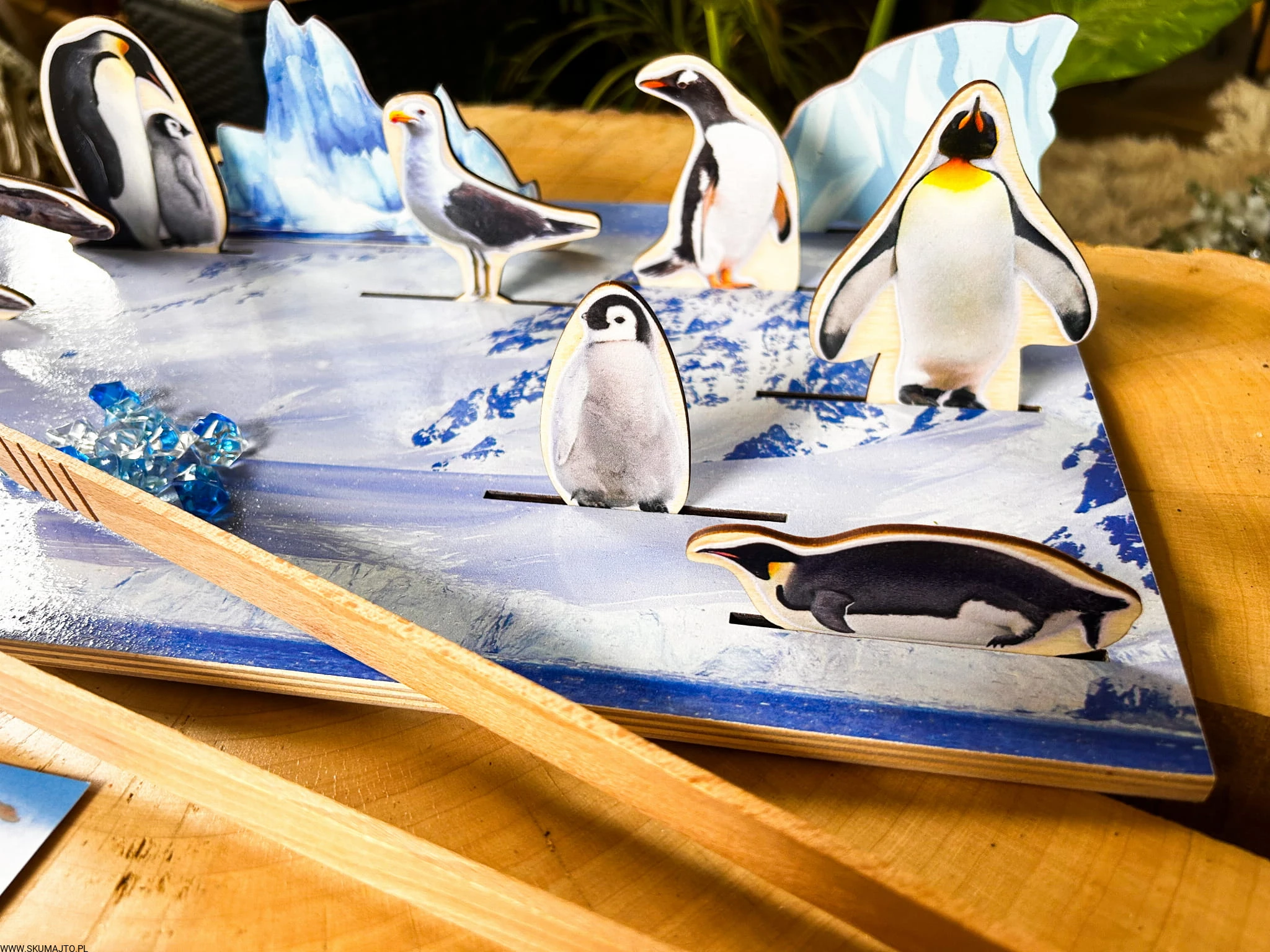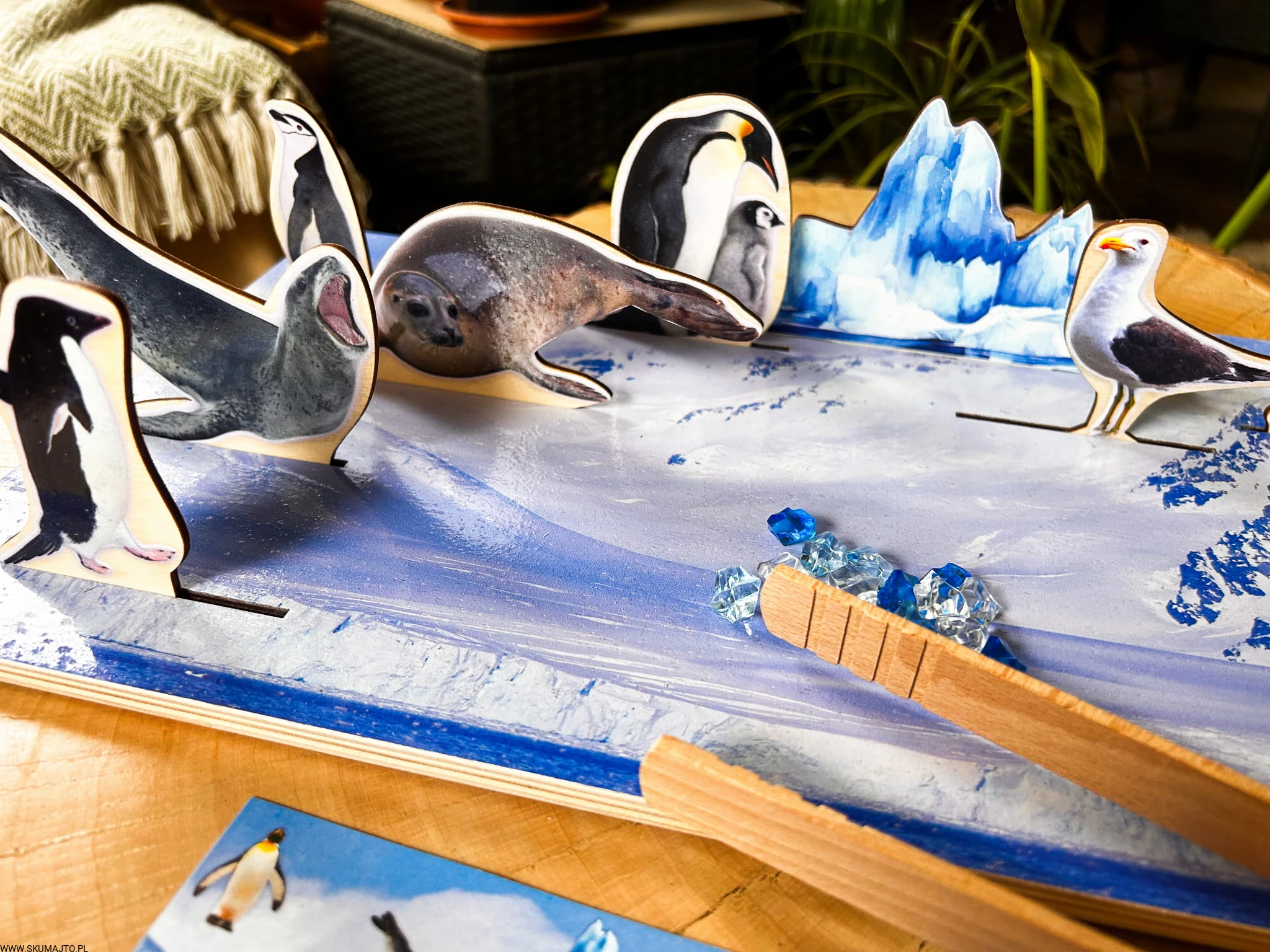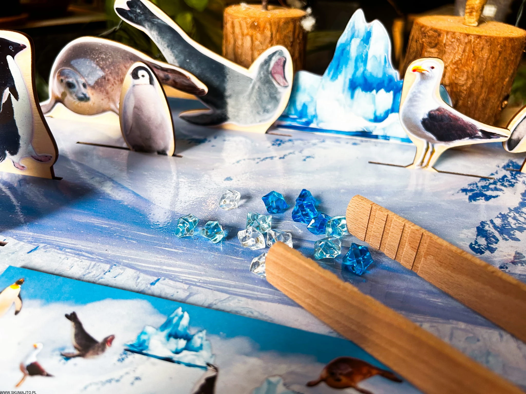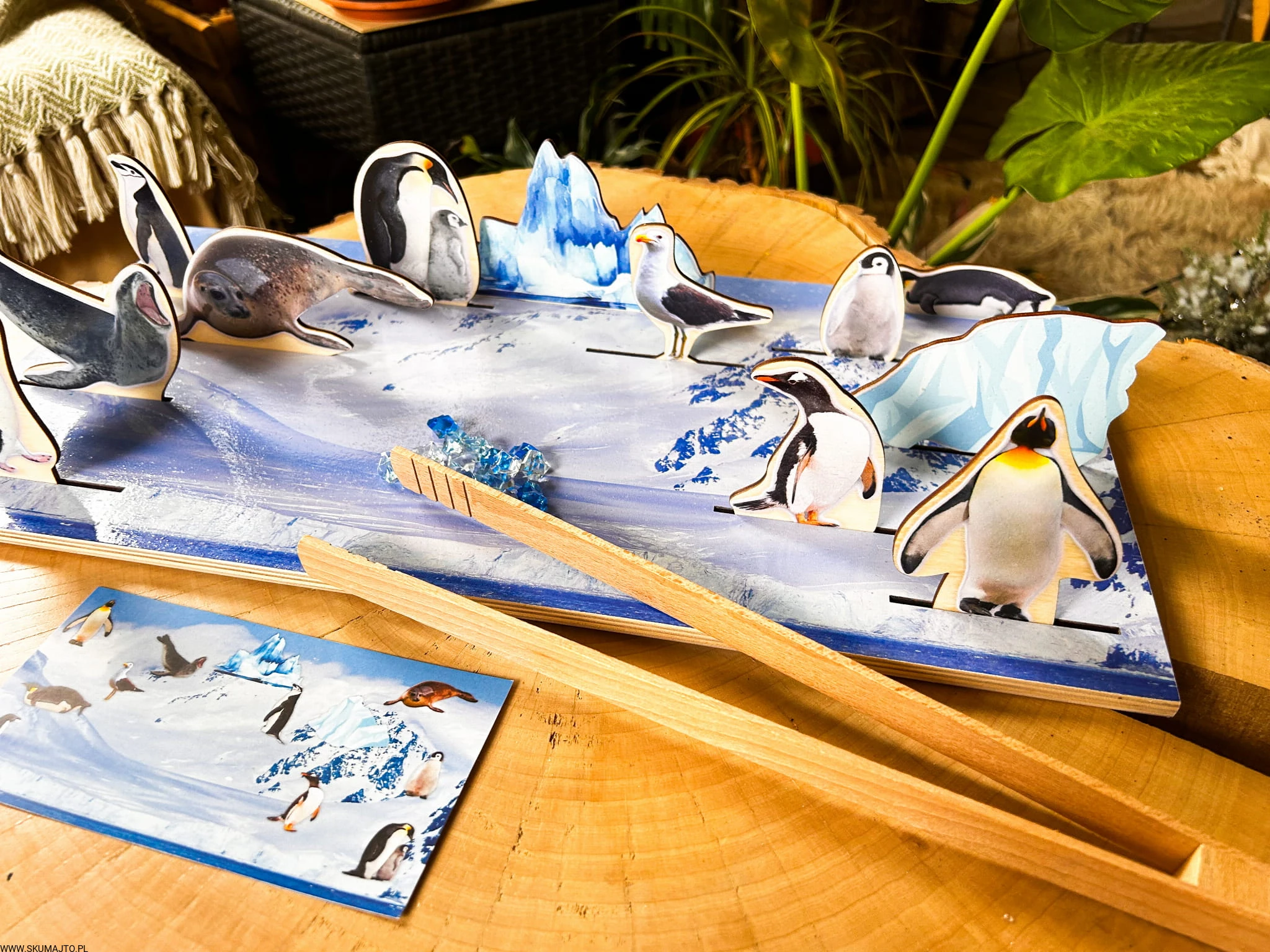 Makieta przedstawia barwną, realistyczną scenerię Antarktydy o wymiarach 48x28 cm. Zadaniem dziecka jest umieszczanie 12 ruchomych elementów – pingwinów, fok, ptaków i brył lodu – w odpowiednich miejscach na planszy, korzystając z dołączonych kart jako wskazówek. A to nie wszystko! Zestaw zawiera również przezroczyste kryształki lodu, które dziecko układa na planszy za pomocą szczypiec, co rozwija małą motorykę i precyzję ruchów.