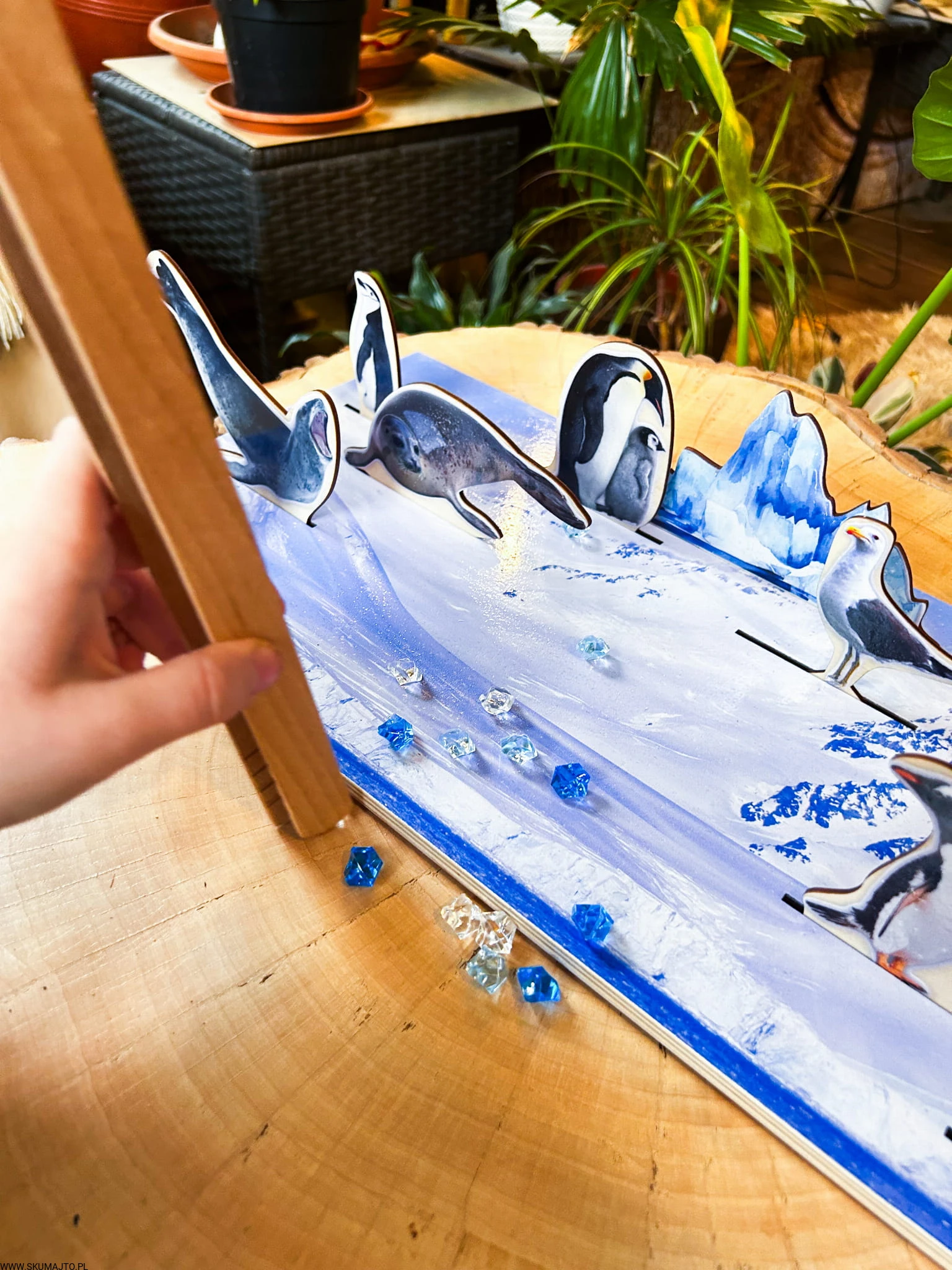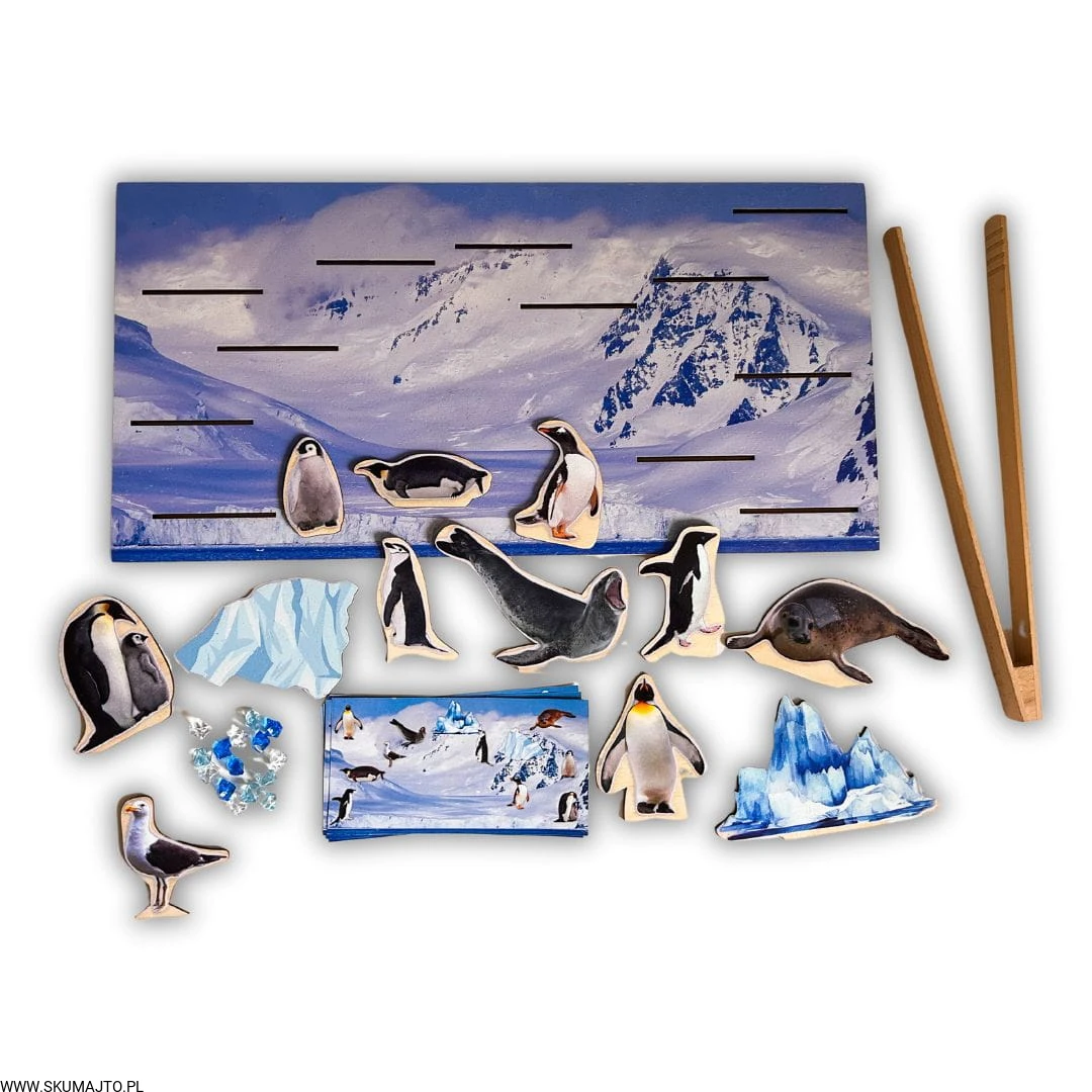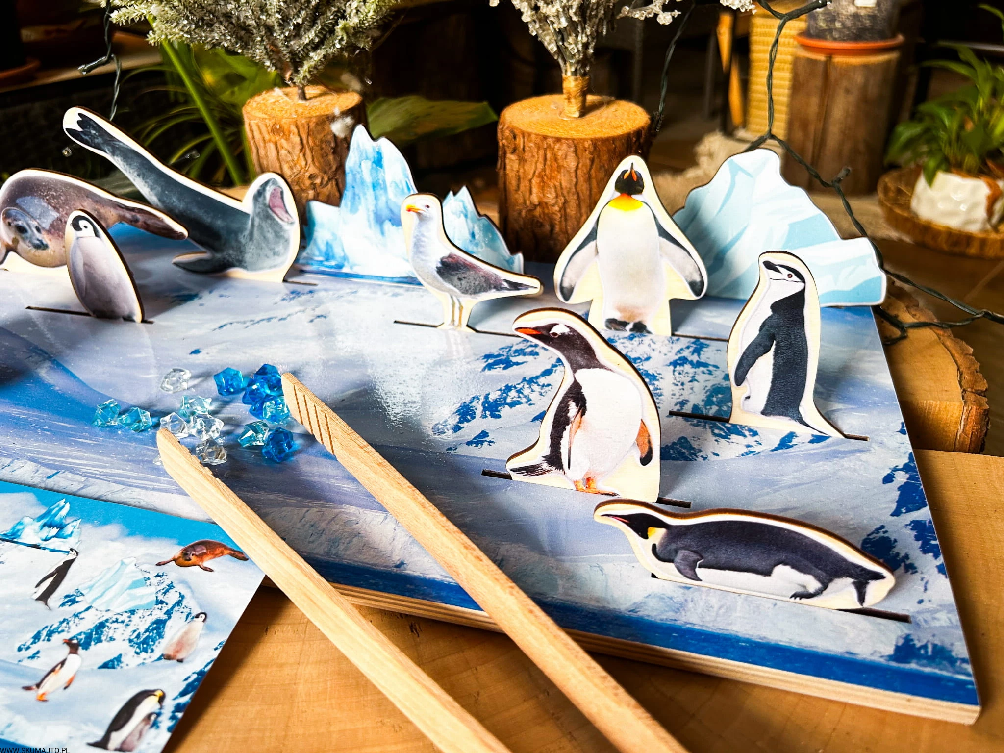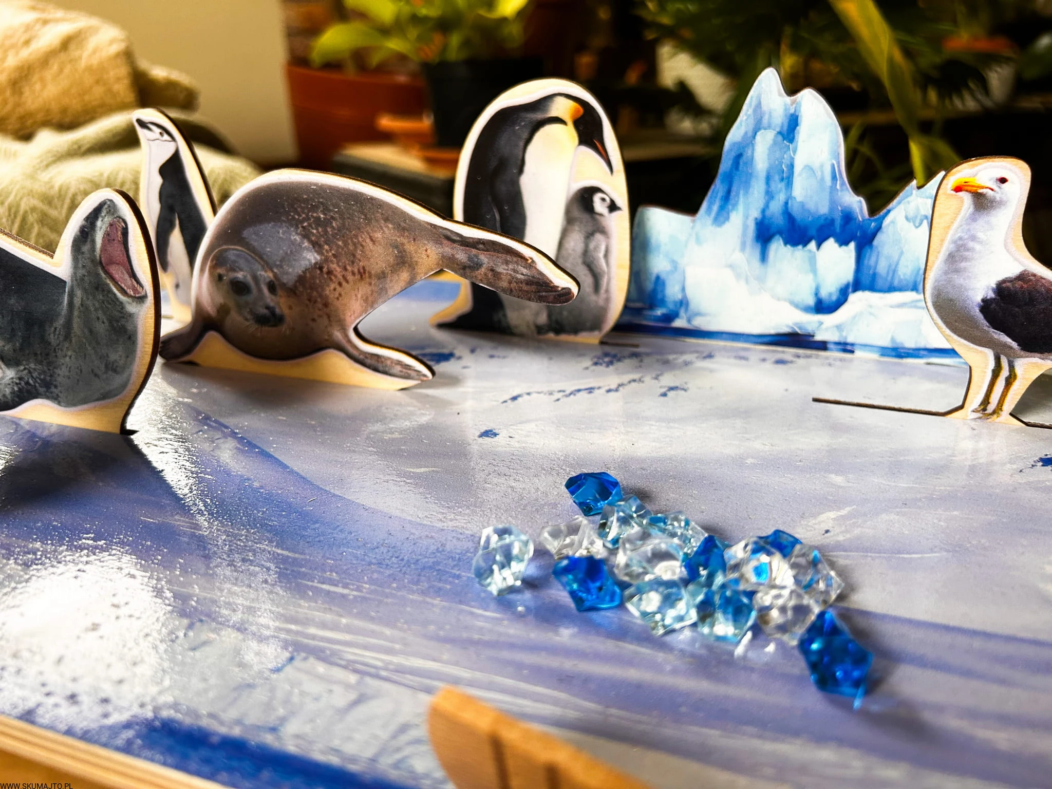 Makieta przedstawia barwną, realistyczną scenerię Antarktydy o wymiarach 48x28 cm. Zadaniem dziecka jest umieszczanie 12 ruchomych elementów – pingwinów, fok, ptaków i brył lodu – w odpowiednich miejscach na planszy, korzystając z dołączonych kart jako wskazówek. A to nie wszystko! Zestaw zawiera również przezroczyste kryształki lodu, które dziecko układa na planszy za pomocą szczypiec, co rozwija małą motorykę i precyzję ruchów.