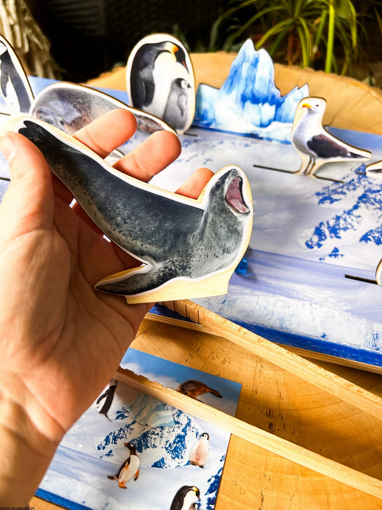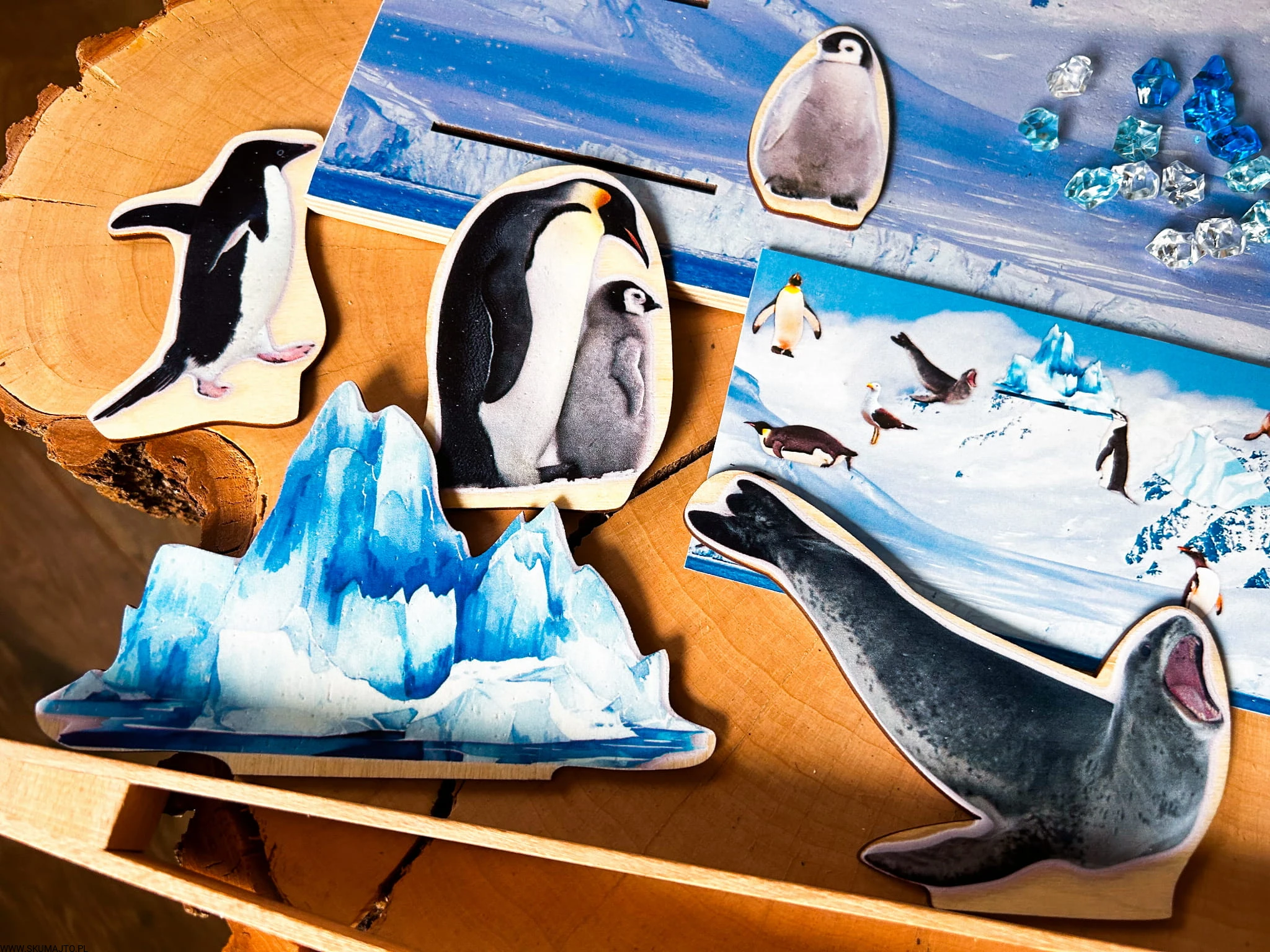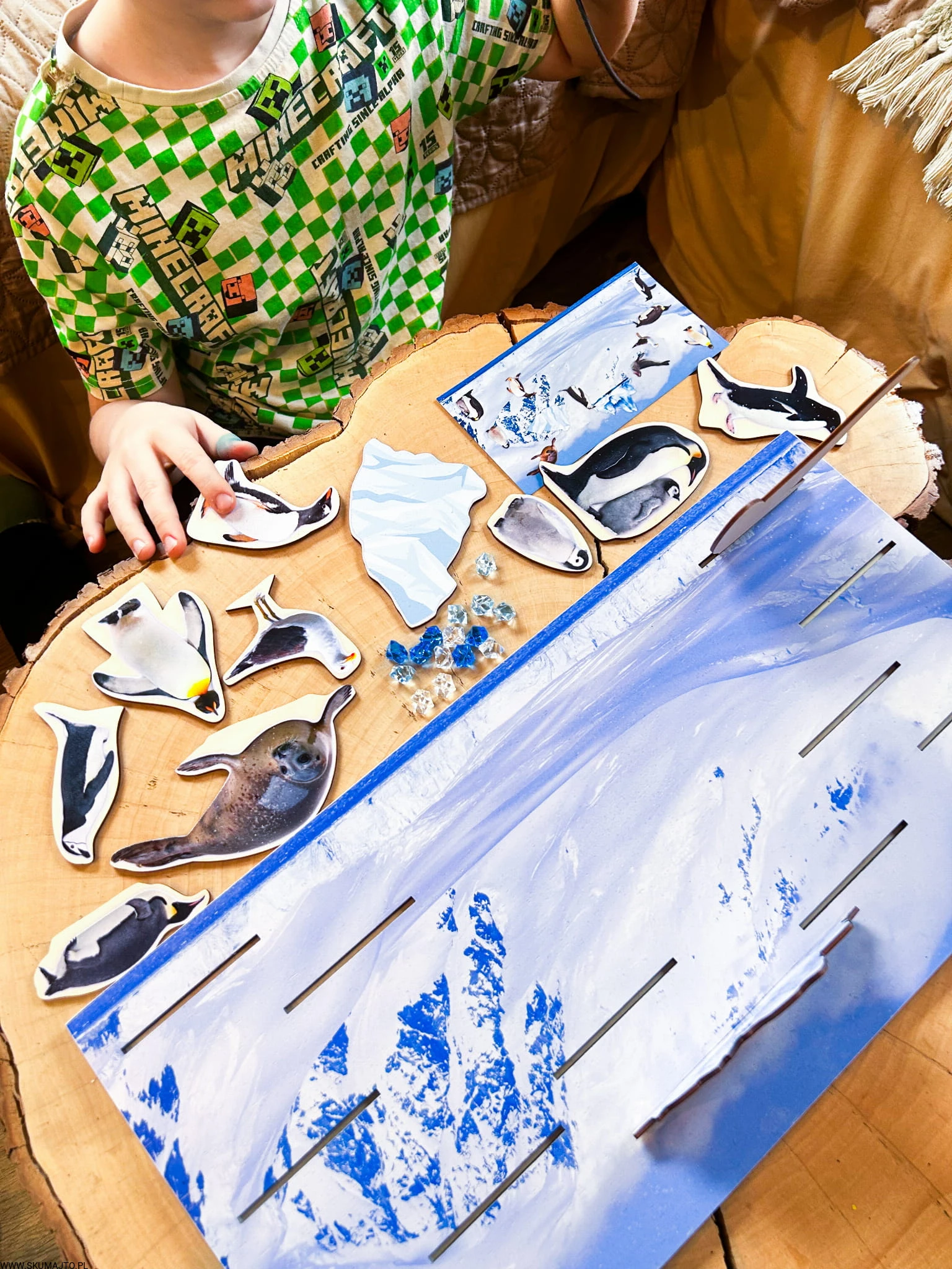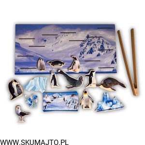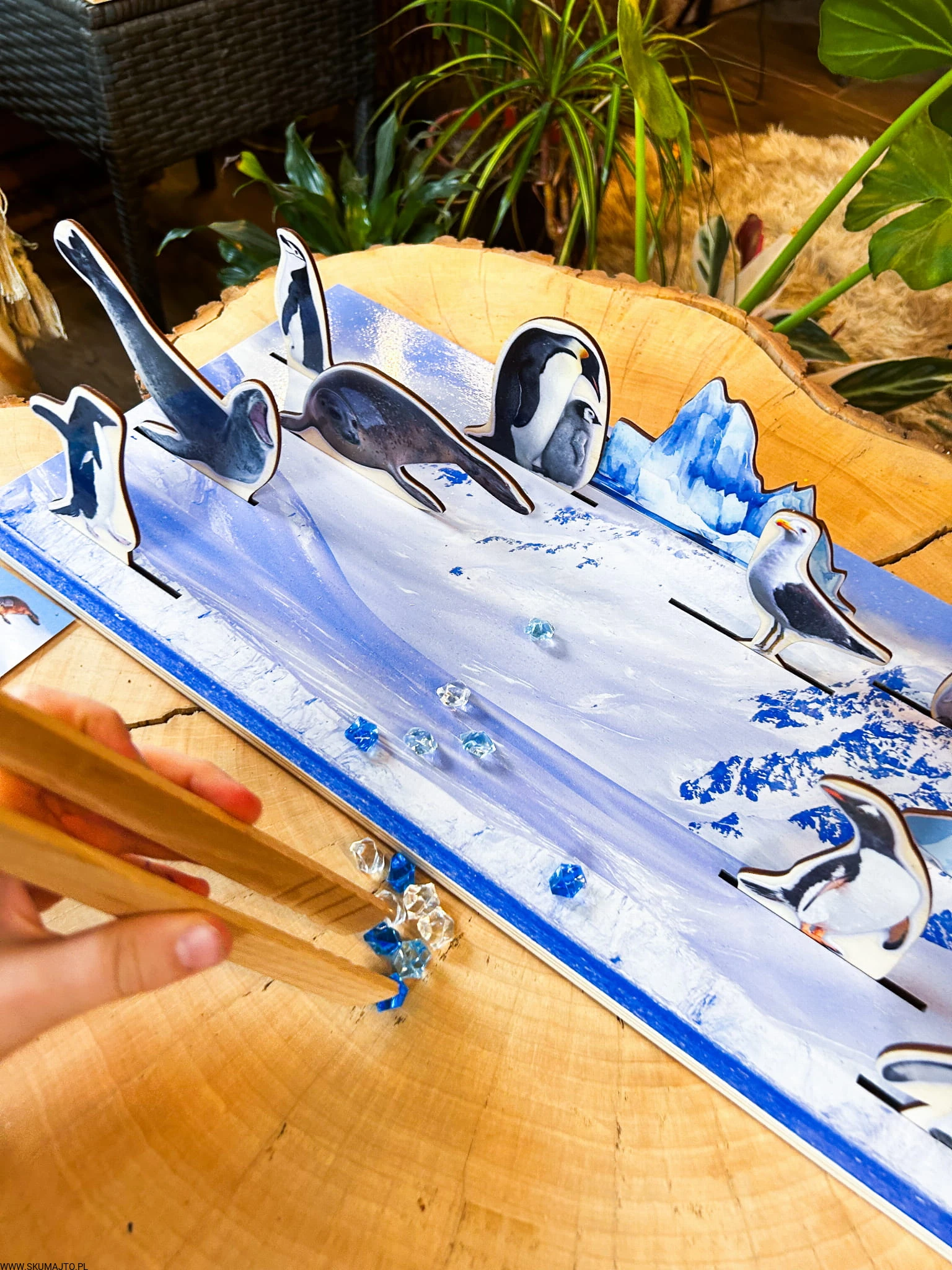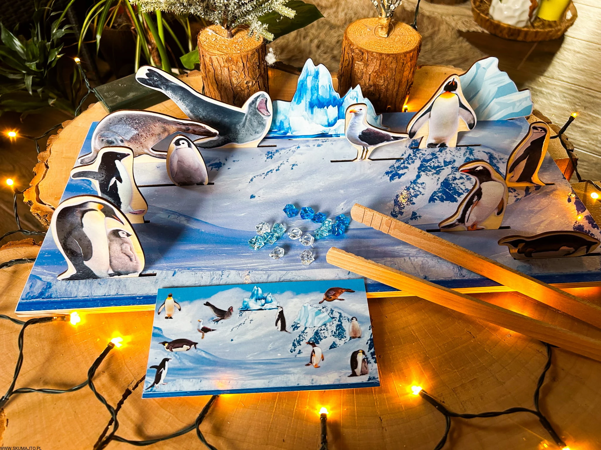 Makieta przedstawia barwną, realistyczną scenerię Antarktydy o wymiarach 48x28 cm. Zadaniem dziecka jest umieszczanie 12 ruchomych elementów – pingwinów, fok, ptaków i brył lodu – w odpowiednich miejscach na planszy, korzystając z dołączonych kart jako wskazówek. A to nie wszystko! Zestaw zawiera również przezroczyste kryształki lodu, które dziecko układa na planszy za pomocą szczypiec, co rozwija małą motorykę i precyzję ruchów.
