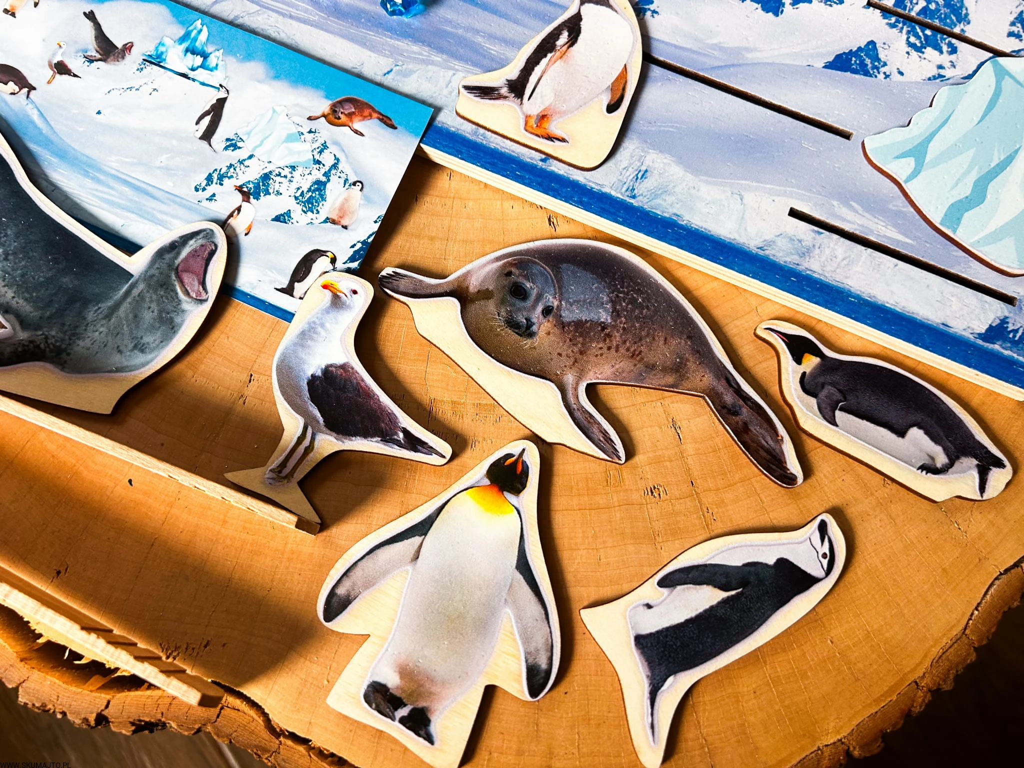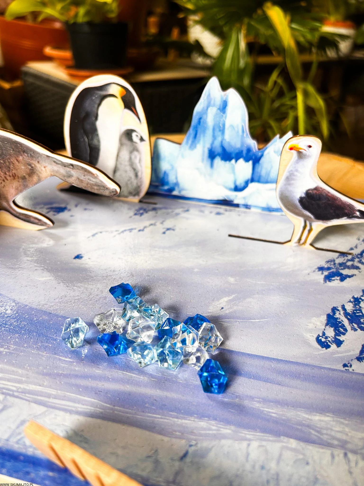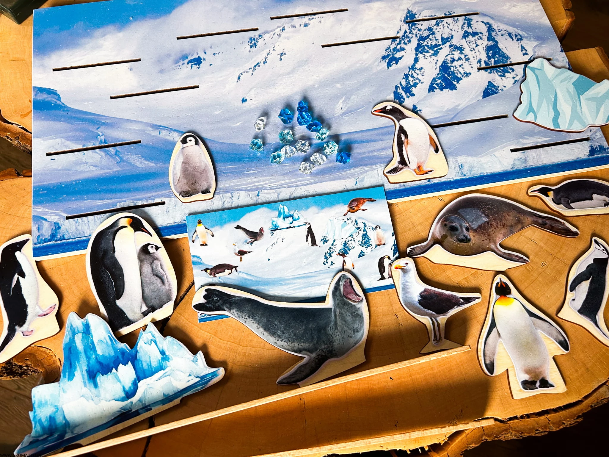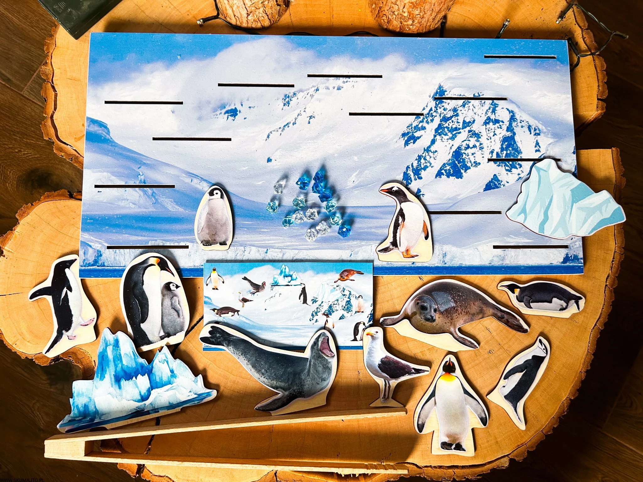 Makieta przedstawia barwną, realistyczną scenerię Antarktydy o wymiarach 48x28 cm. Zadaniem dziecka jest umieszczanie 12 ruchomych elementów – pingwinów, fok, ptaków i brył lodu – w odpowiednich miejscach na planszy, korzystając z dołączonych kart jako wskazówek. A to nie wszystko! Zestaw zawiera również przezroczyste kryształki lodu, które dziecko układa na planszy za pomocą szczypiec, co rozwija małą motorykę i precyzję ruchów.