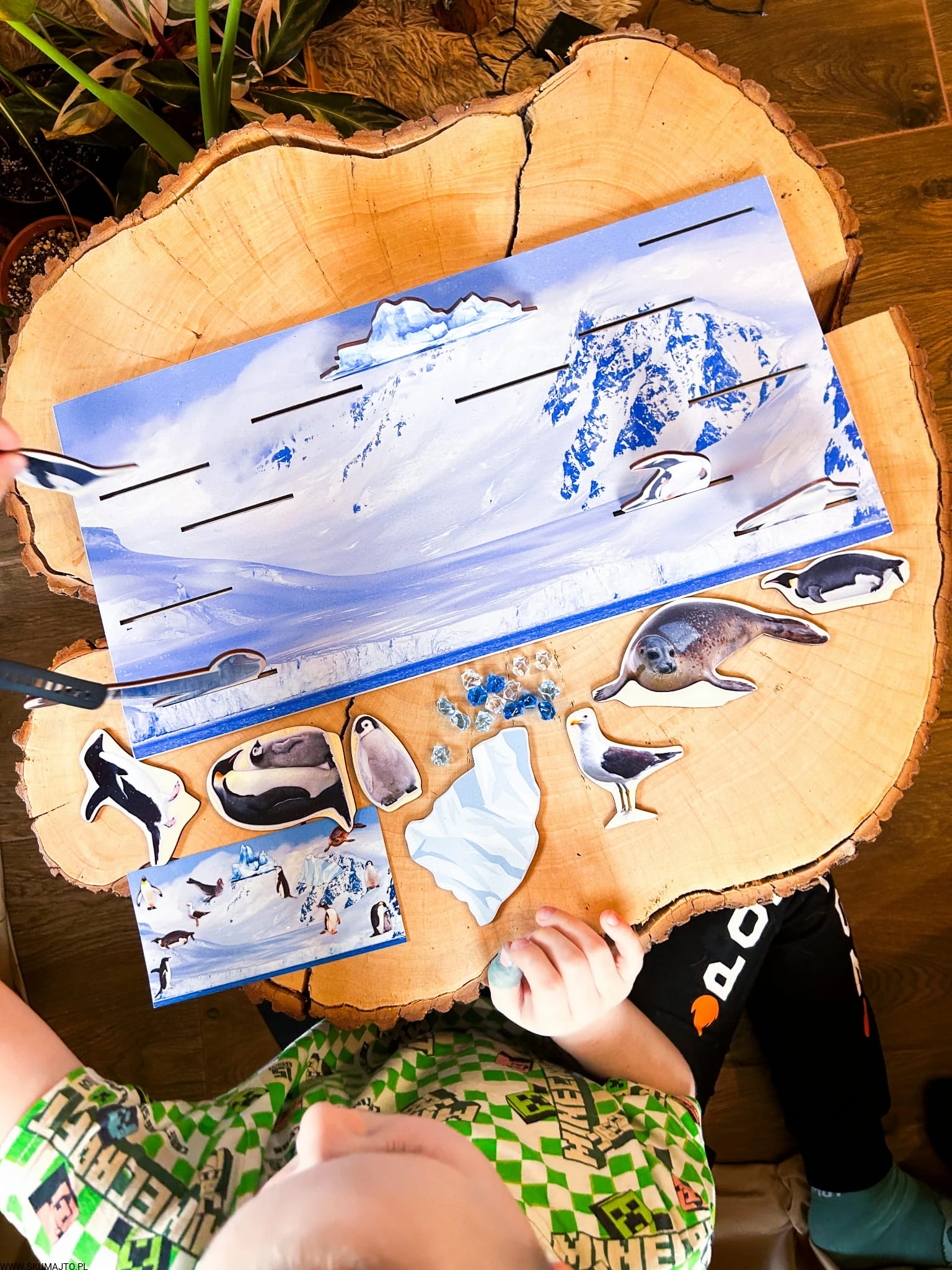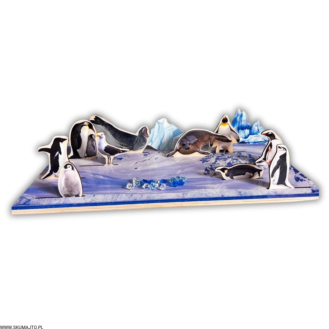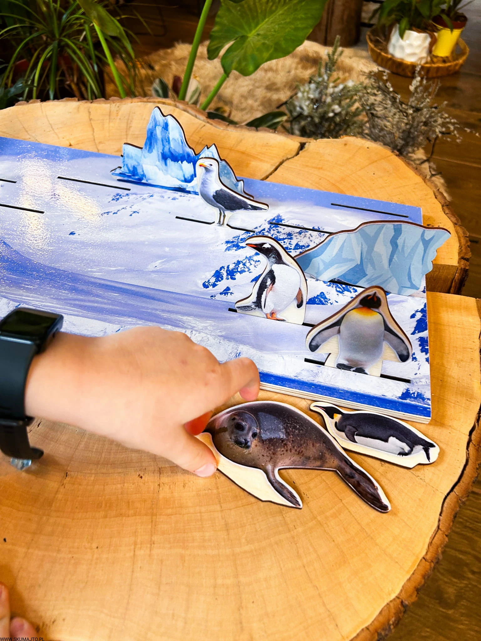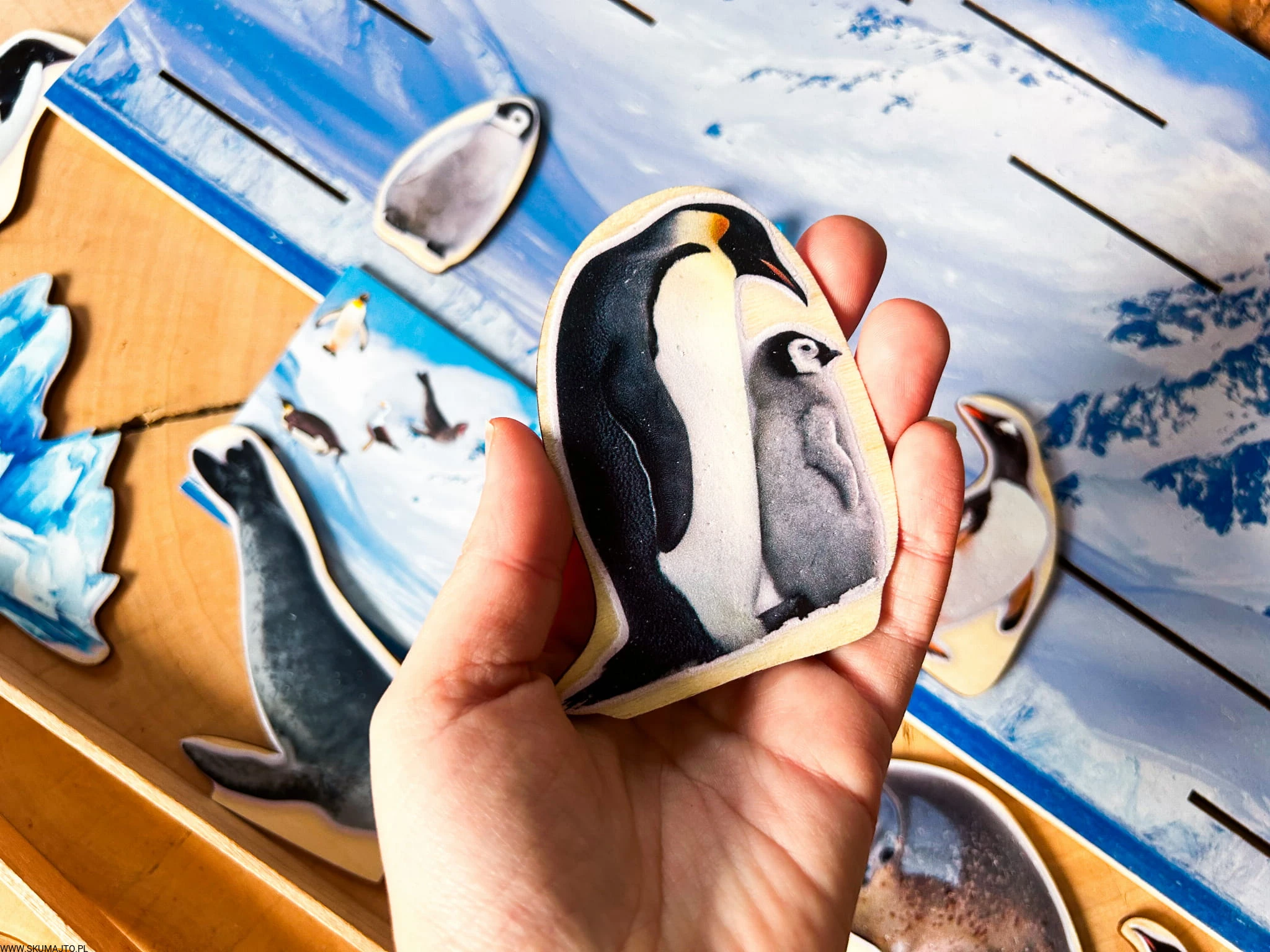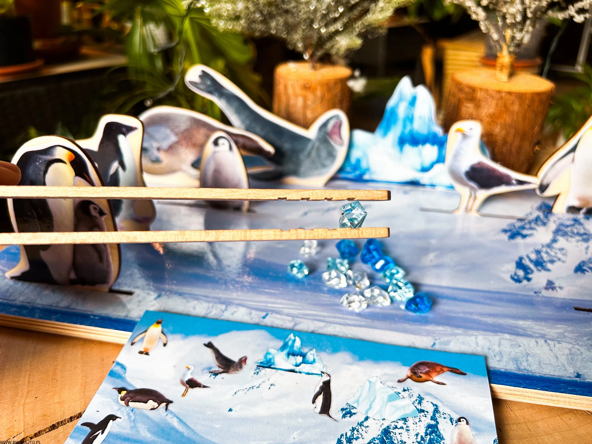 Makieta przedstawia barwną, realistyczną scenerię Antarktydy o wymiarach 48x28 cm. Zadaniem dziecka jest umieszczanie 12 ruchomych elementów – pingwinów, fok, ptaków i brył lodu – w odpowiednich miejscach na planszy, korzystając z dołączonych kart jako wskazówek. A to nie wszystko! Zestaw zawiera również przezroczyste kryształki lodu, które dziecko układa na planszy za pomocą szczypiec, co rozwija małą motorykę i precyzję ruchów.