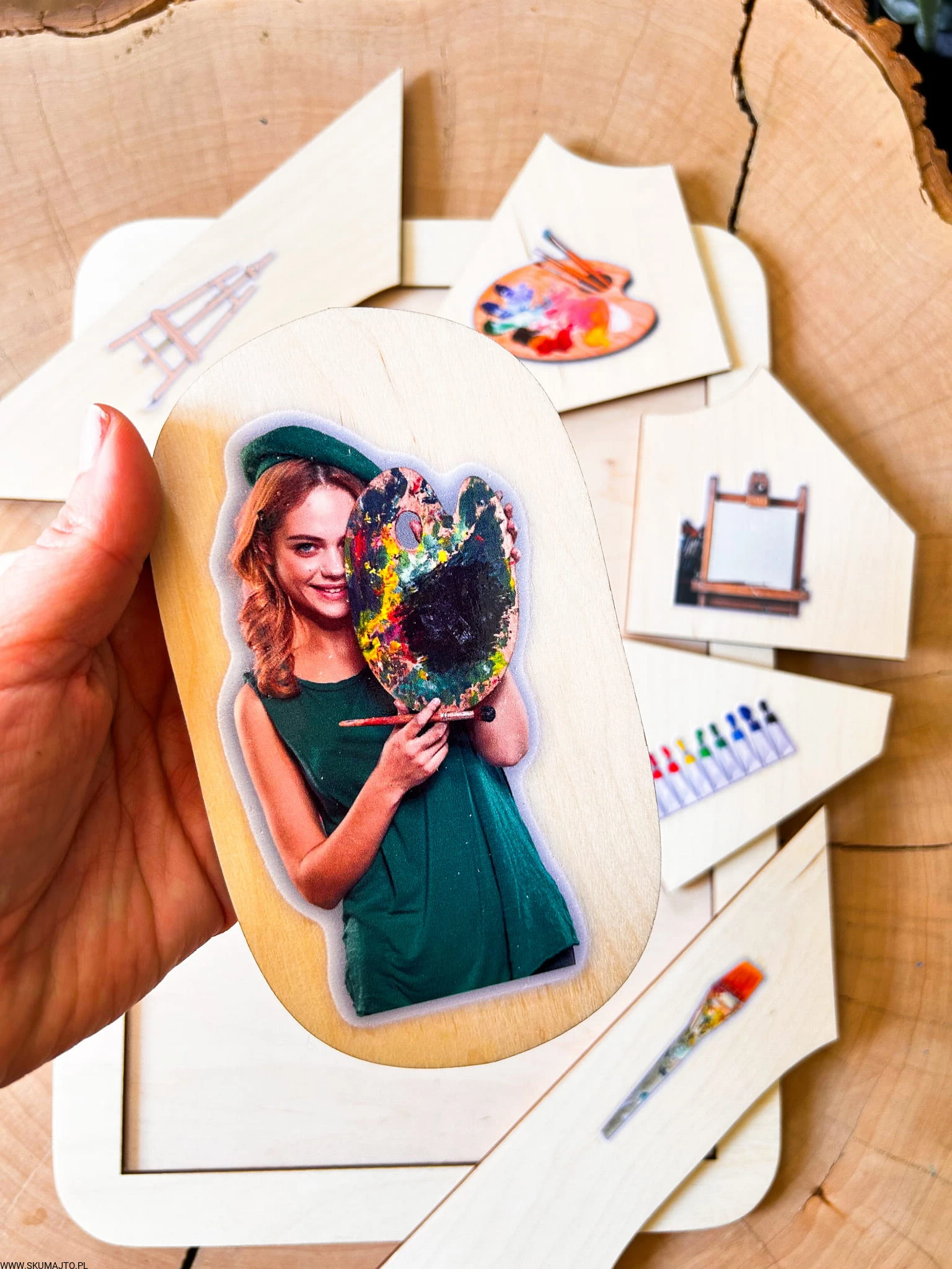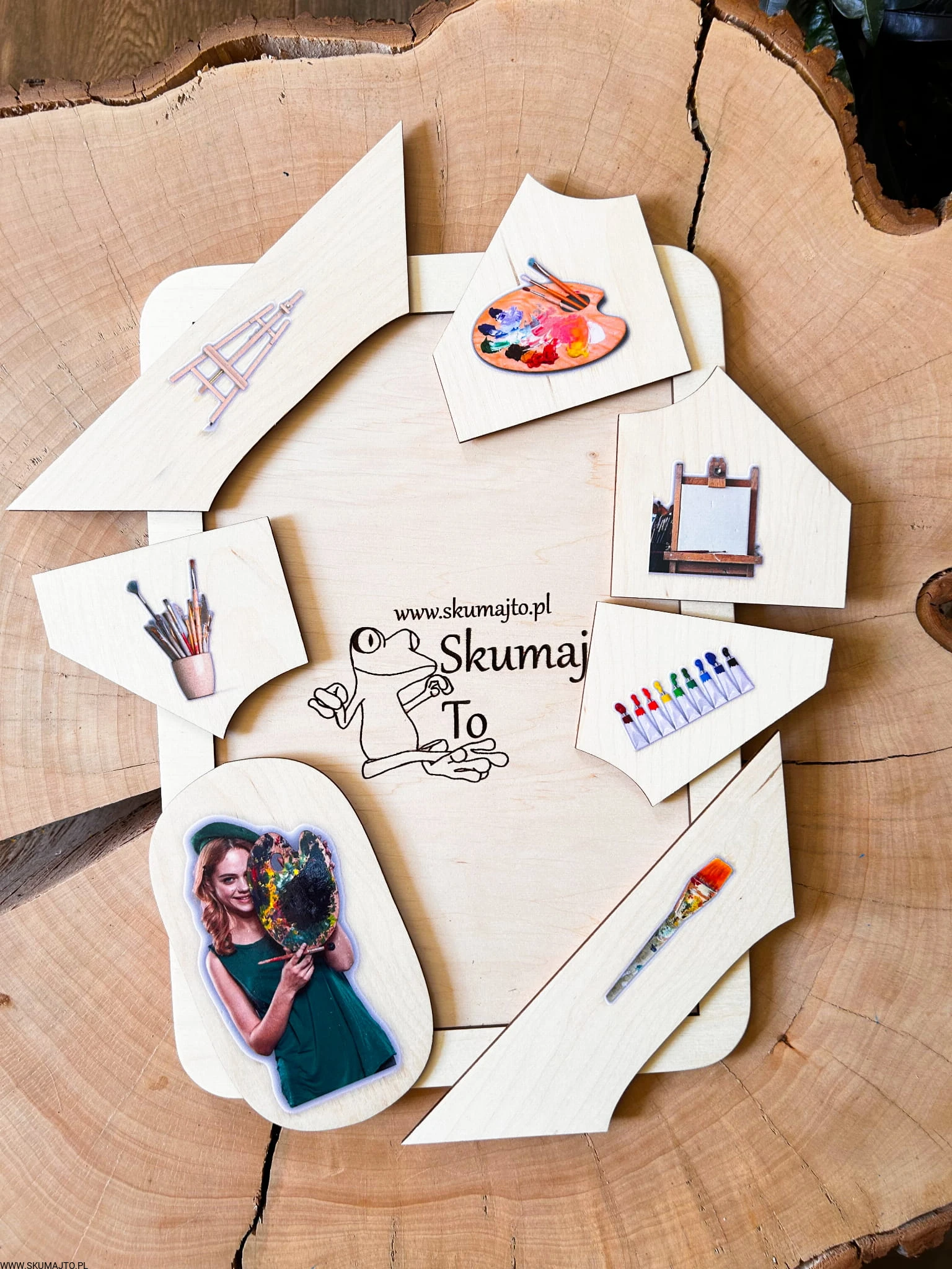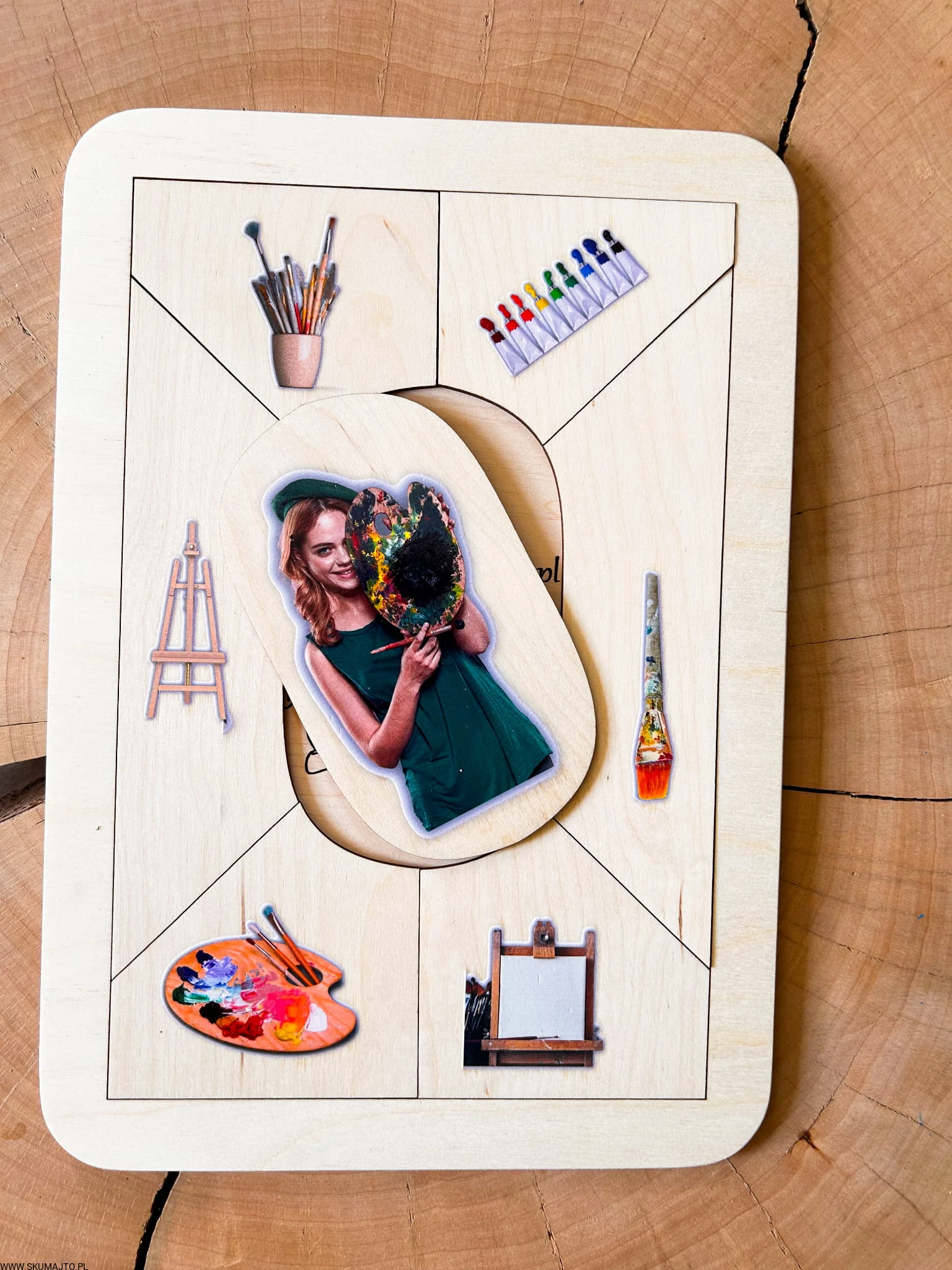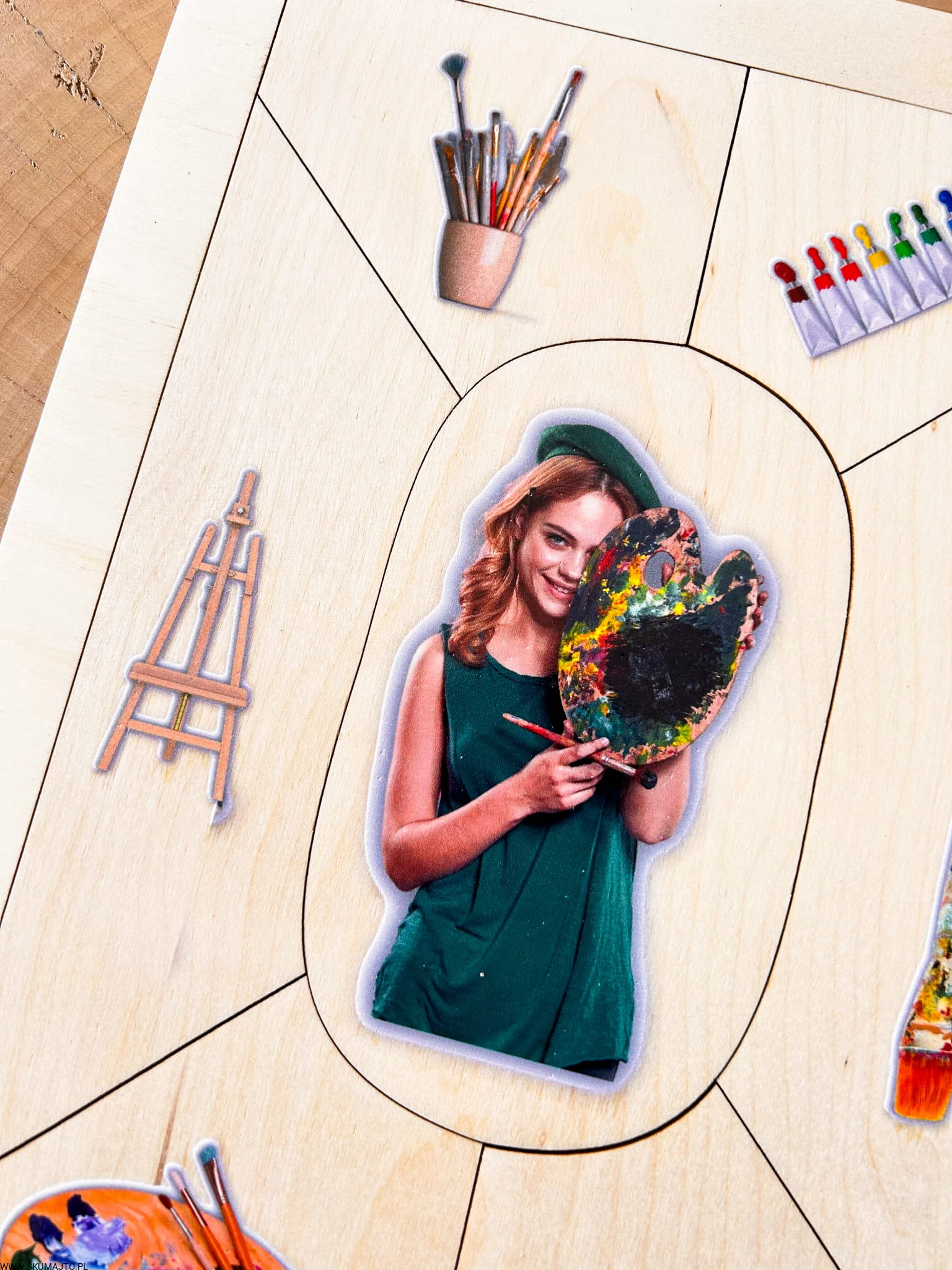 W centrum układanki znajduje się postać malarki – z paletą i pędzlem, uśmiechnięta, zanurzona w procesie tworzenia.