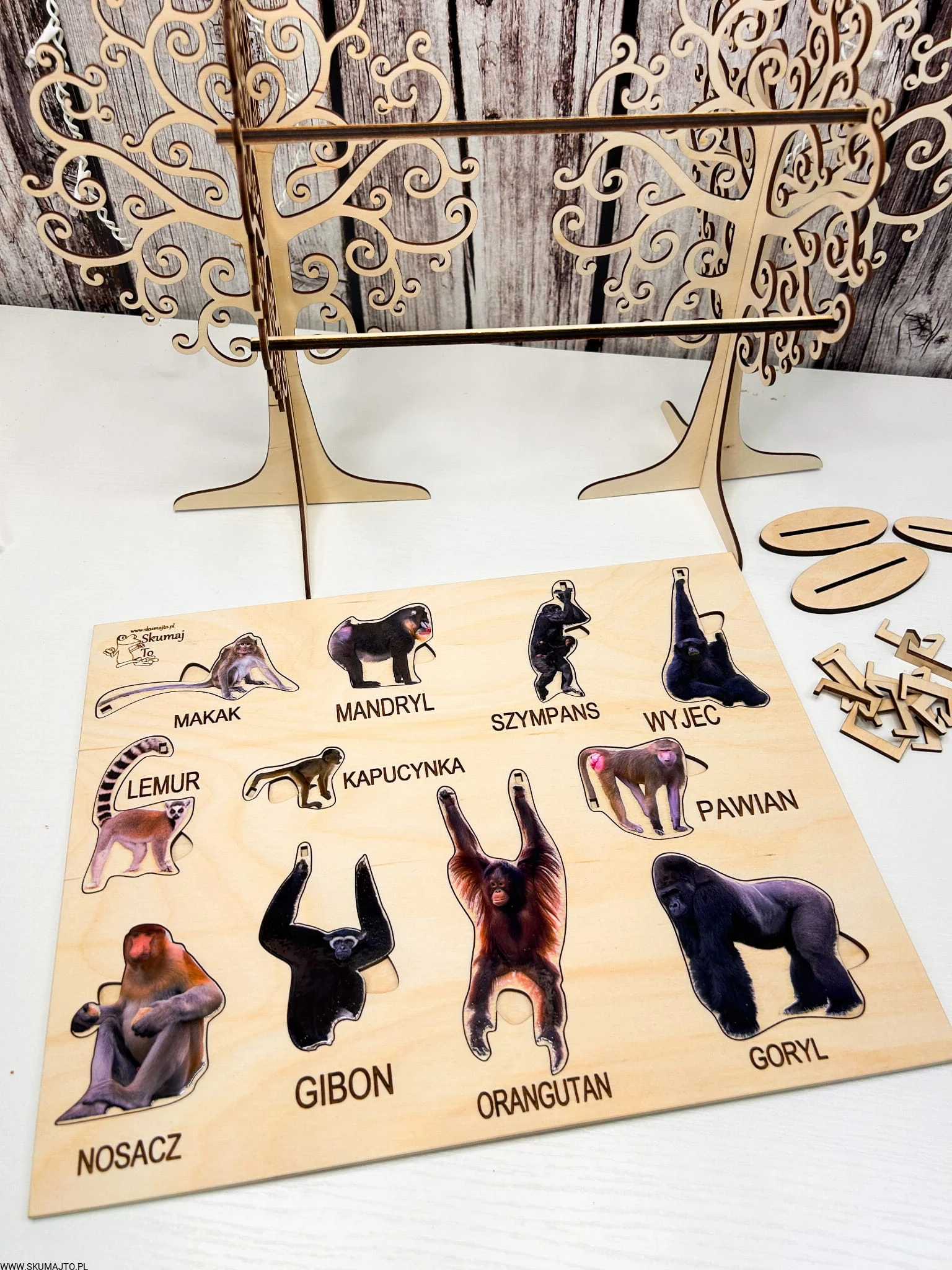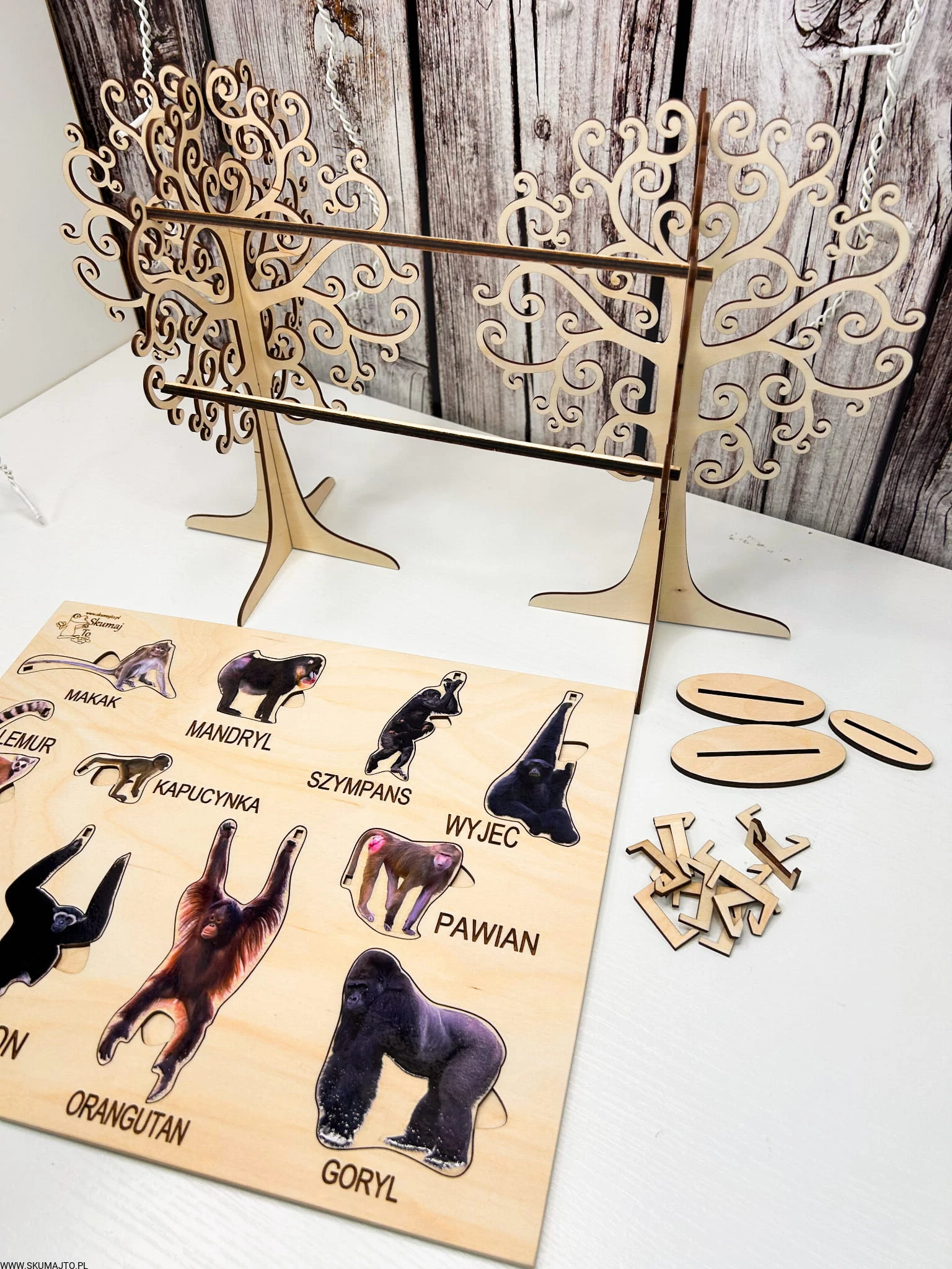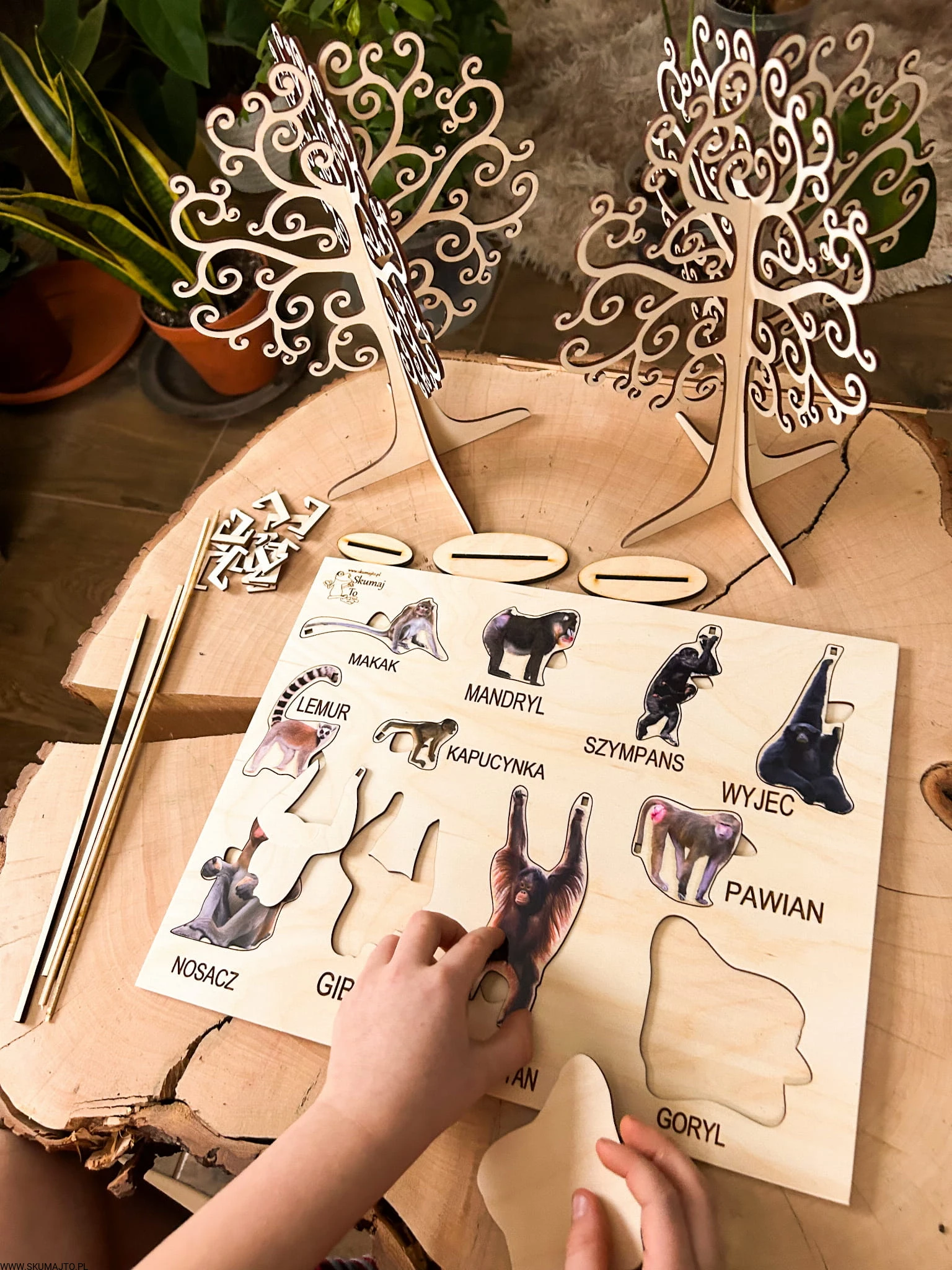 Interaktywne Drzewa i Liany: W zestawie znajdują się dwie solidne drewniane podstawy w formie drzew oraz dwa kołeczki "liany", które pozwalają dzieciom odgrywać scenki i rozwijać zdolności manualne.