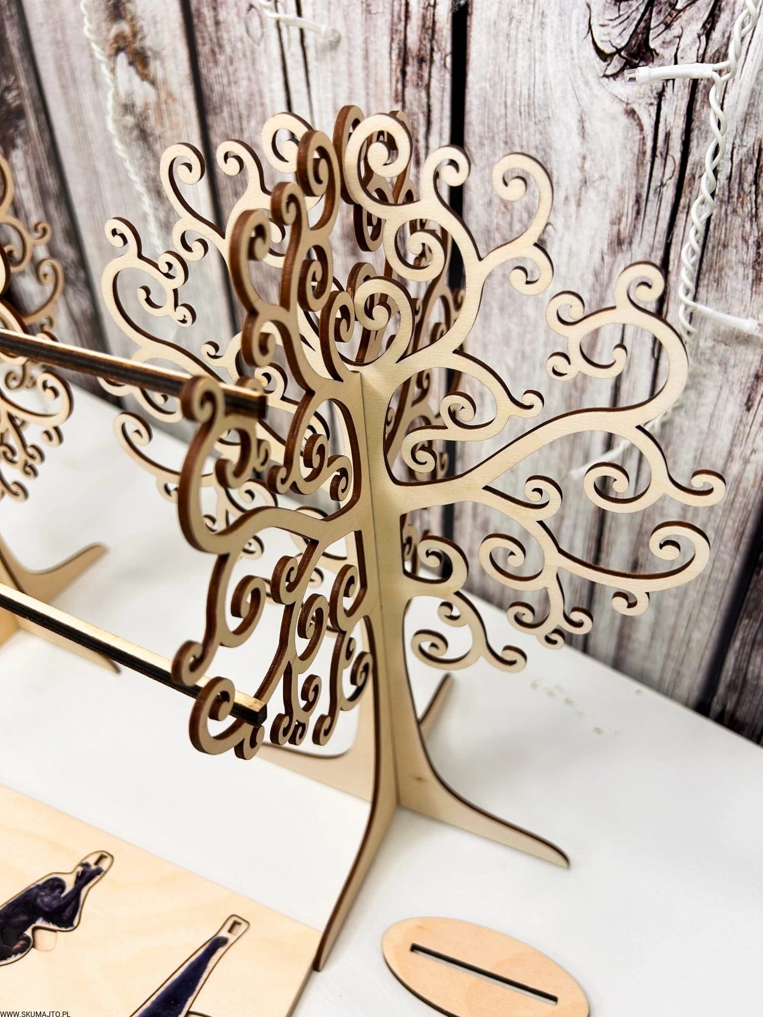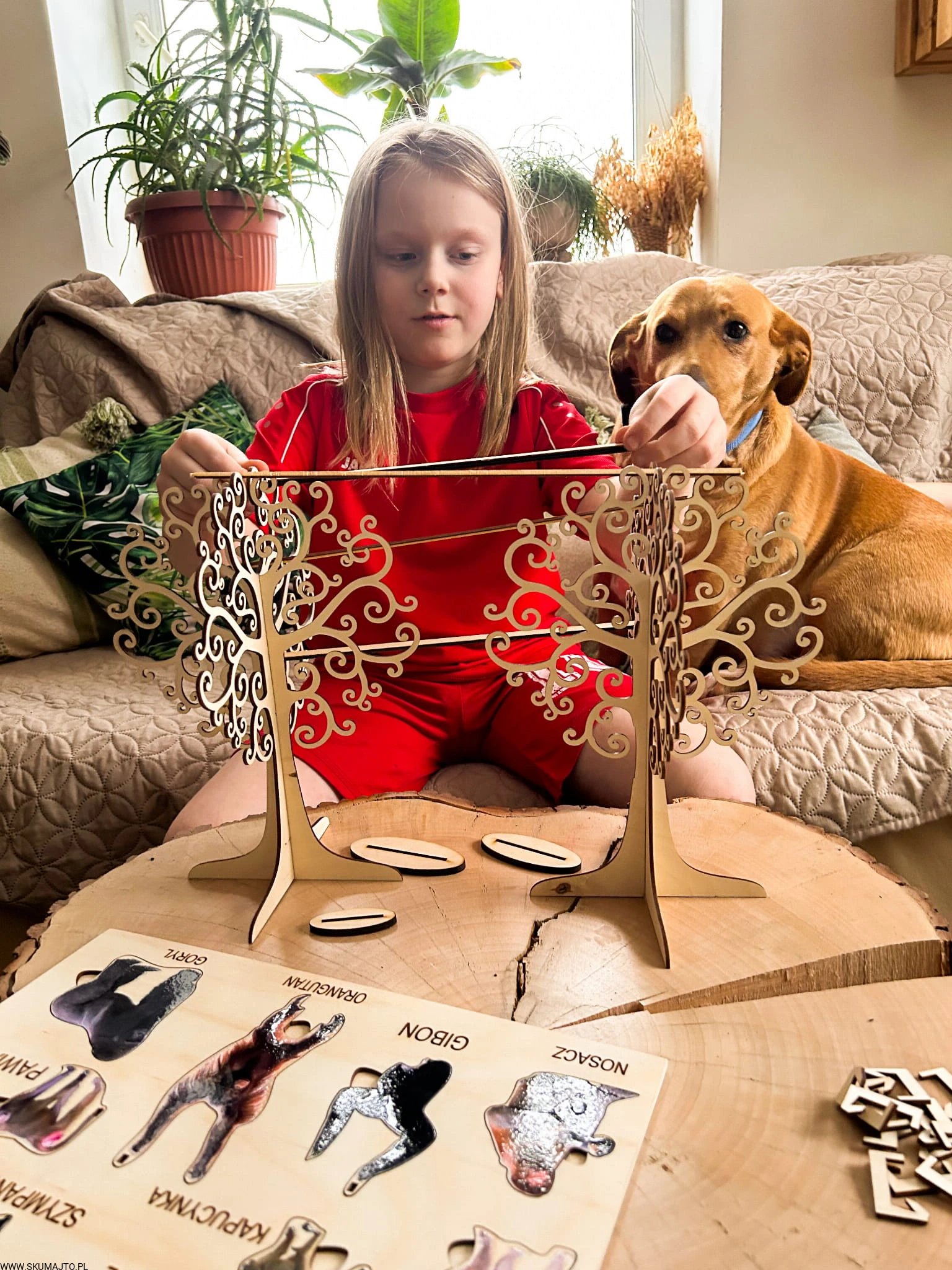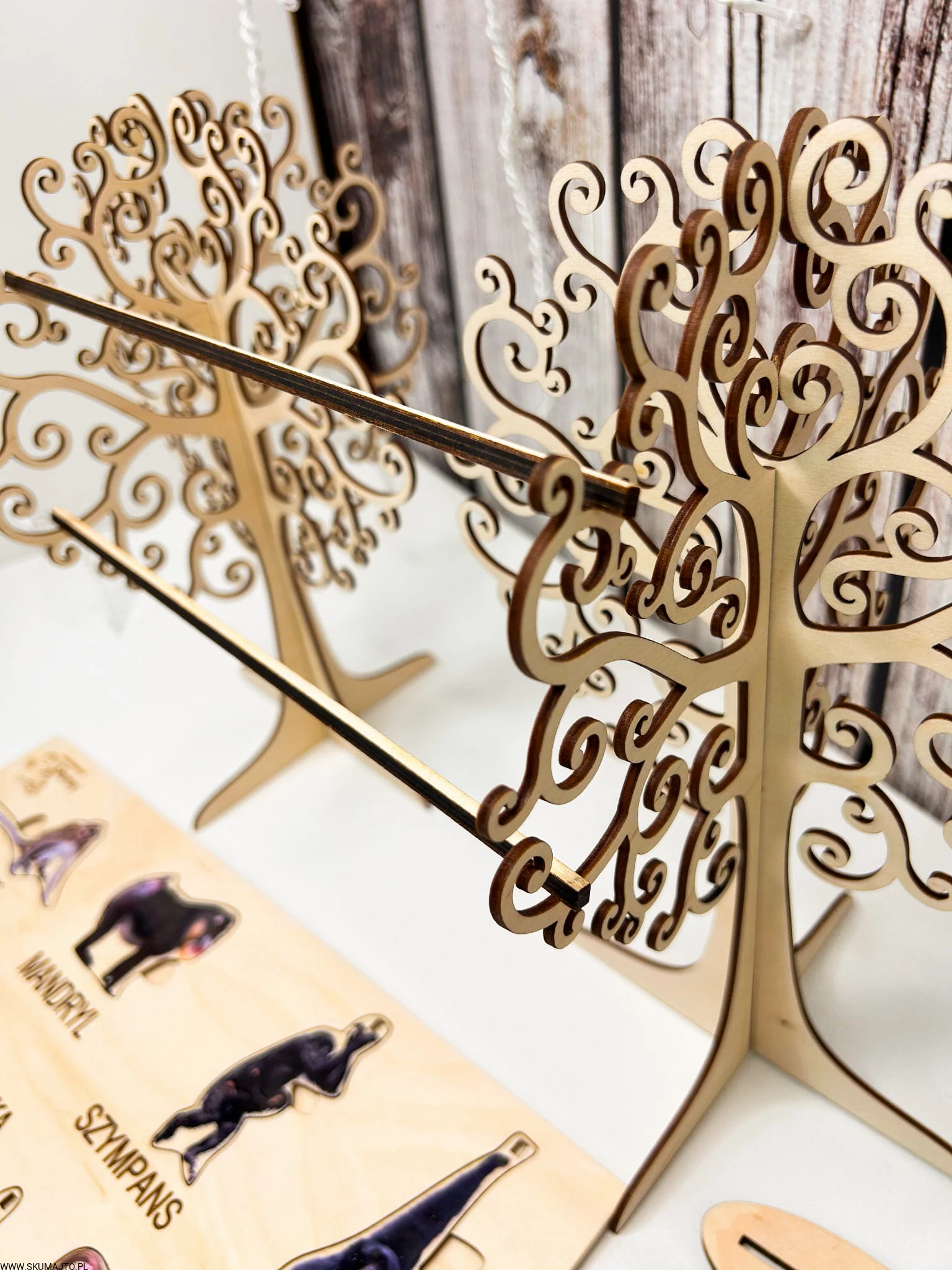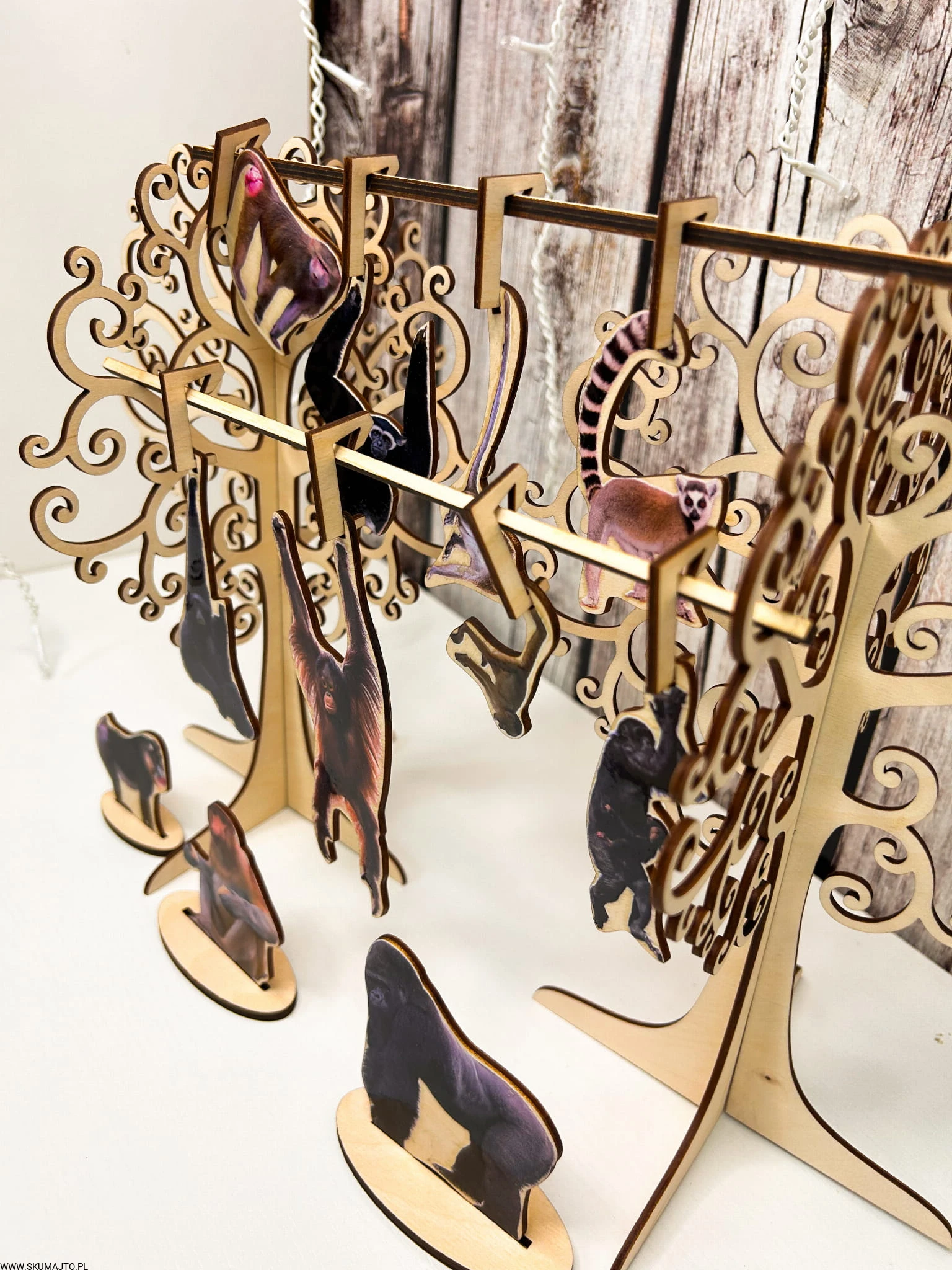 Interaktywne Drzewa i Liany: W zestawie znajdują się dwie solidne drewniane podstawy w formie drzew oraz dwa kołeczki "liany", które pozwalają dzieciom odgrywać scenki i rozwijać zdolności manualne.