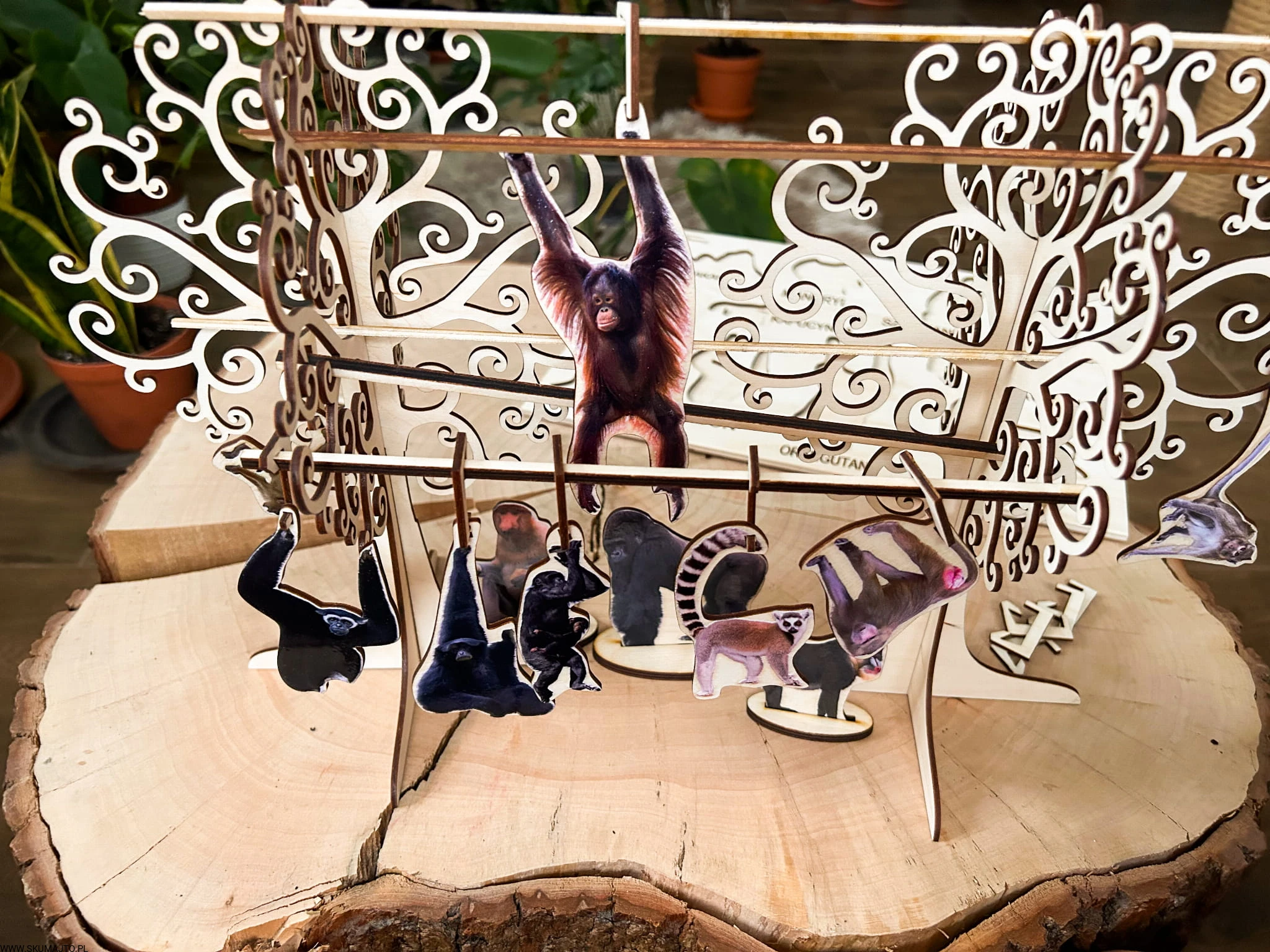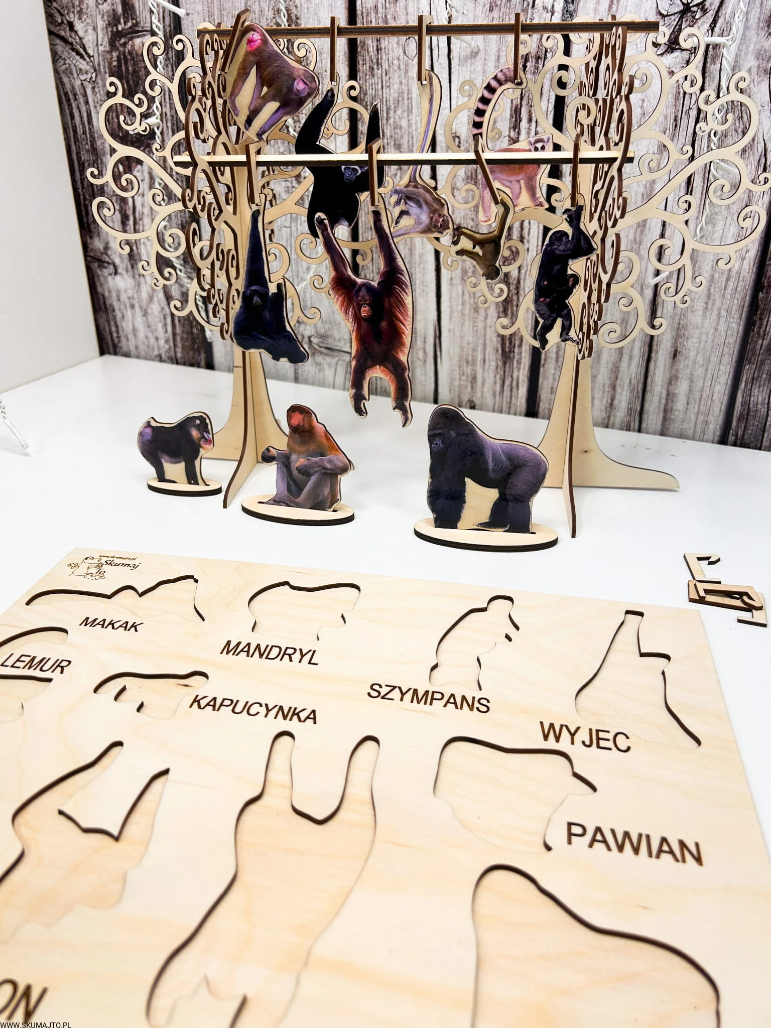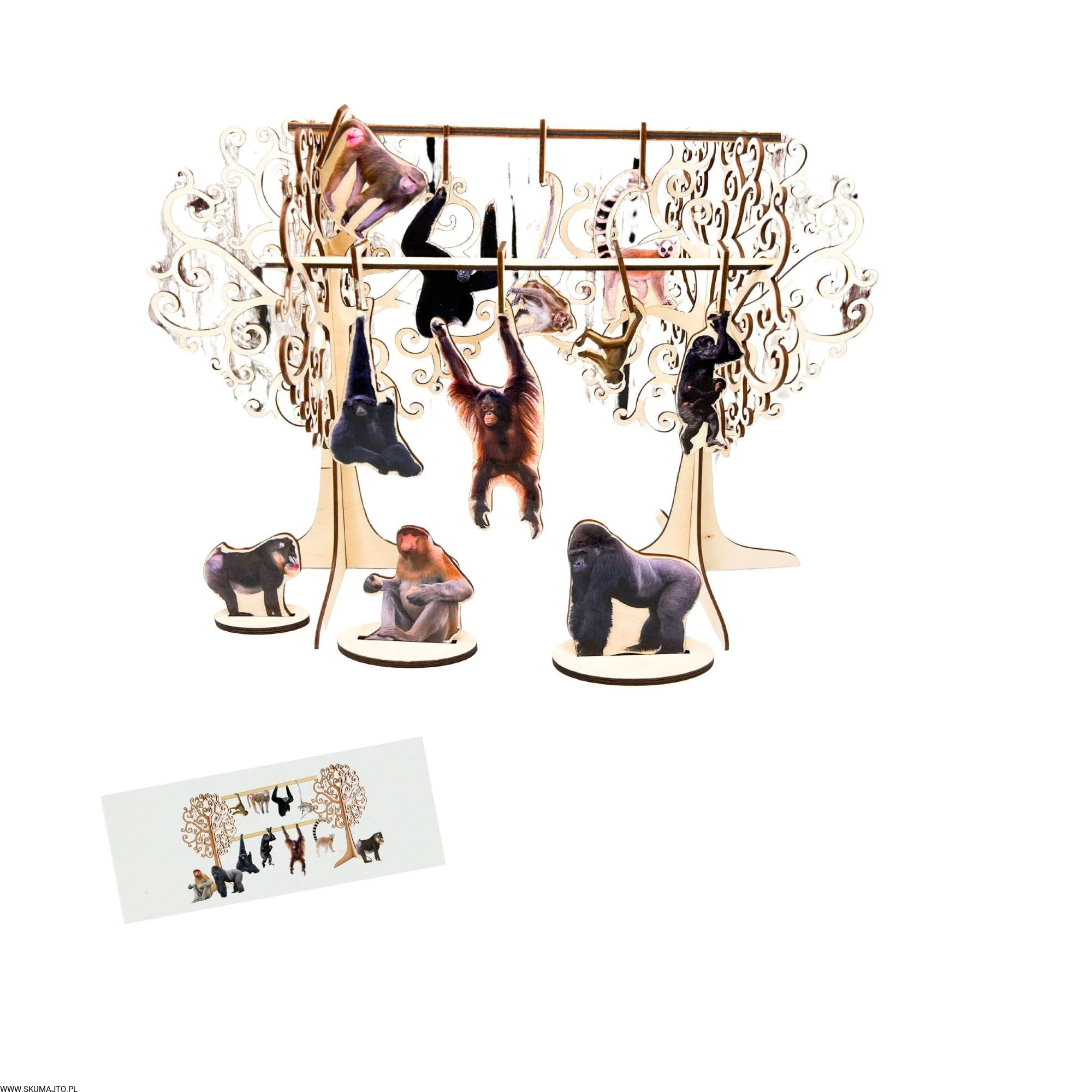 Rozwijanie Logicznego Myślenia: Dziecko ma za zadanie powiesić każdą małpkę w odpowiednim miejscu na drzewie zgodnie z dołączonymi kartami – to doskonałe ćwiczenie logicznego myślenia i koordynacji ręka-oko!