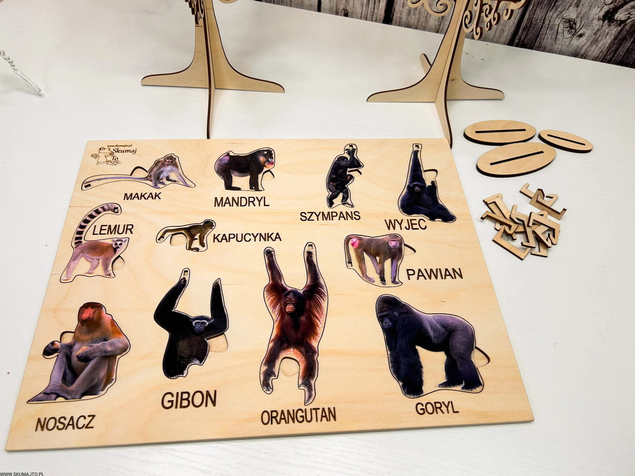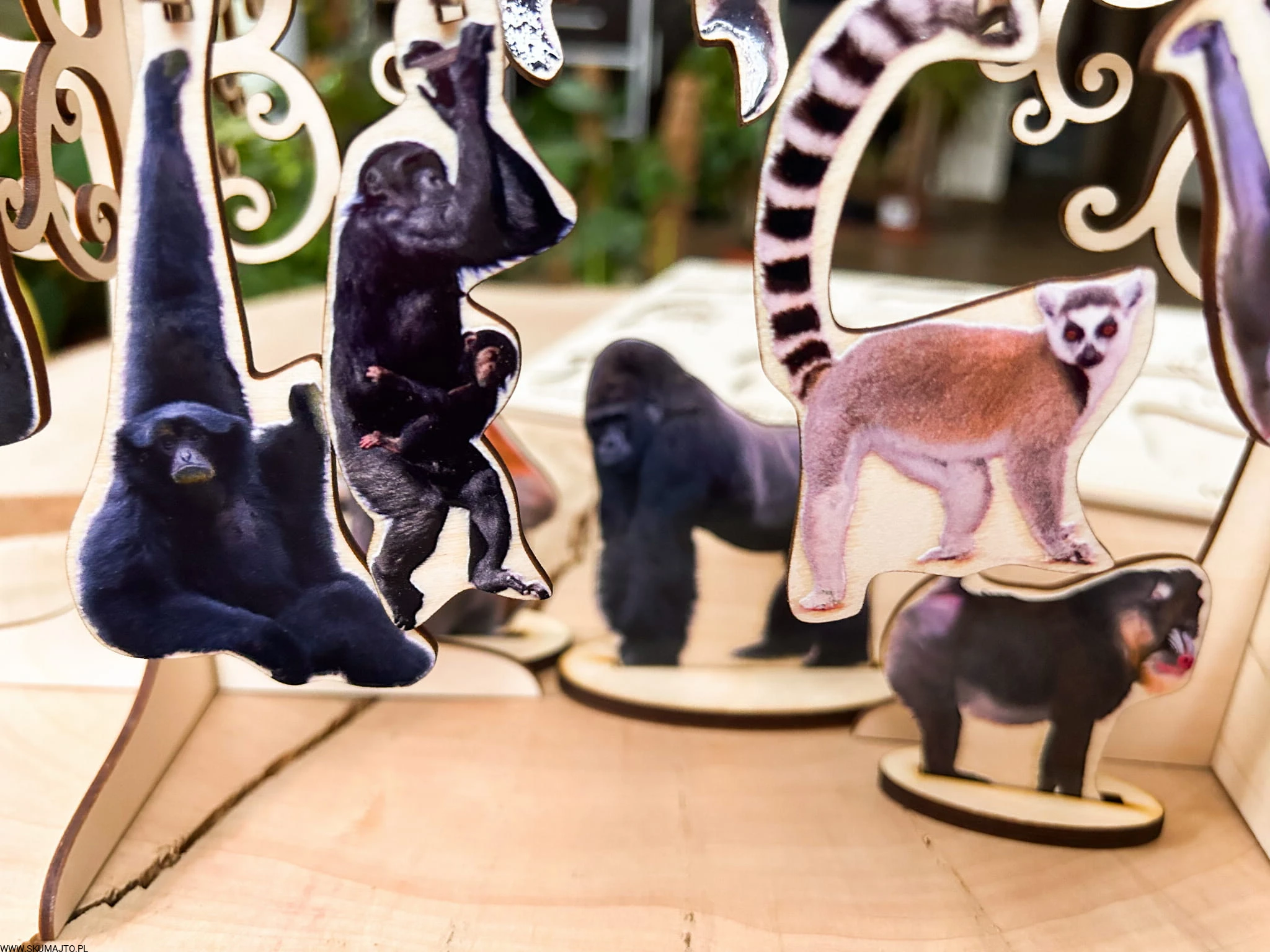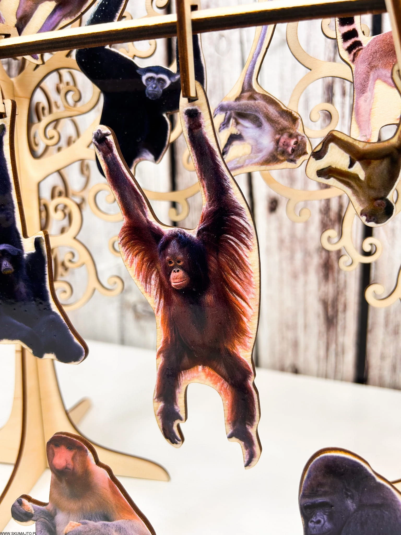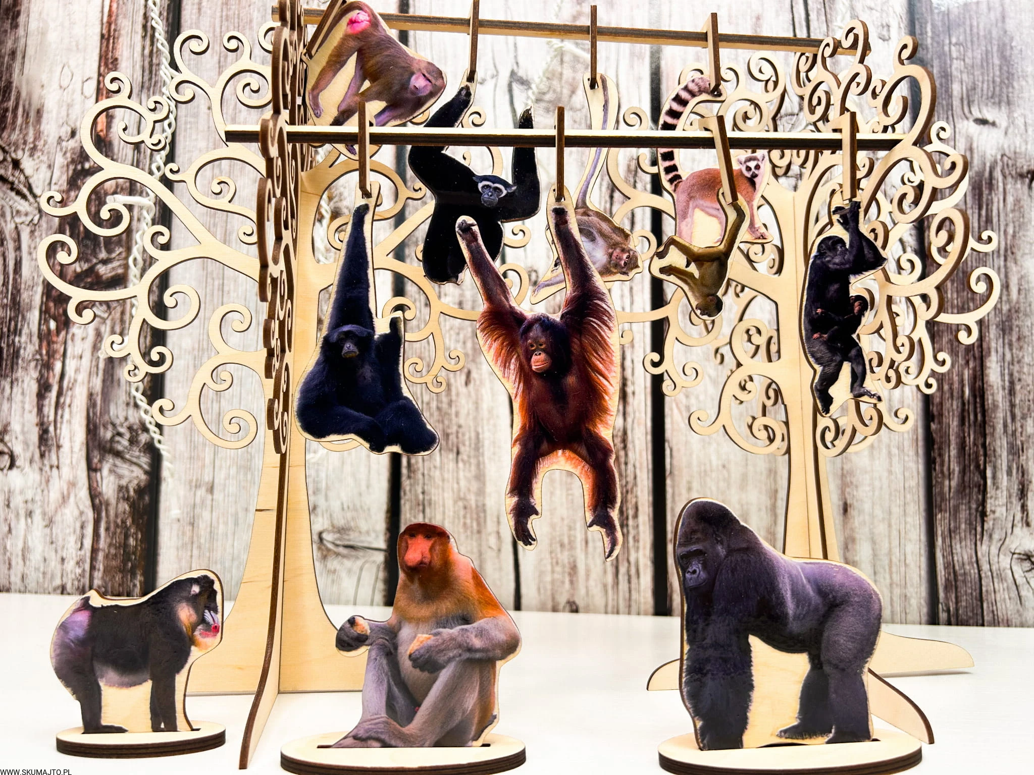 Kolorowe i podpisane gatunki małp: Każda małpka to odrębny gatunek, pięknie pomalowany i opisany, co stymuluje naukę o różnorodności w zabawie.
