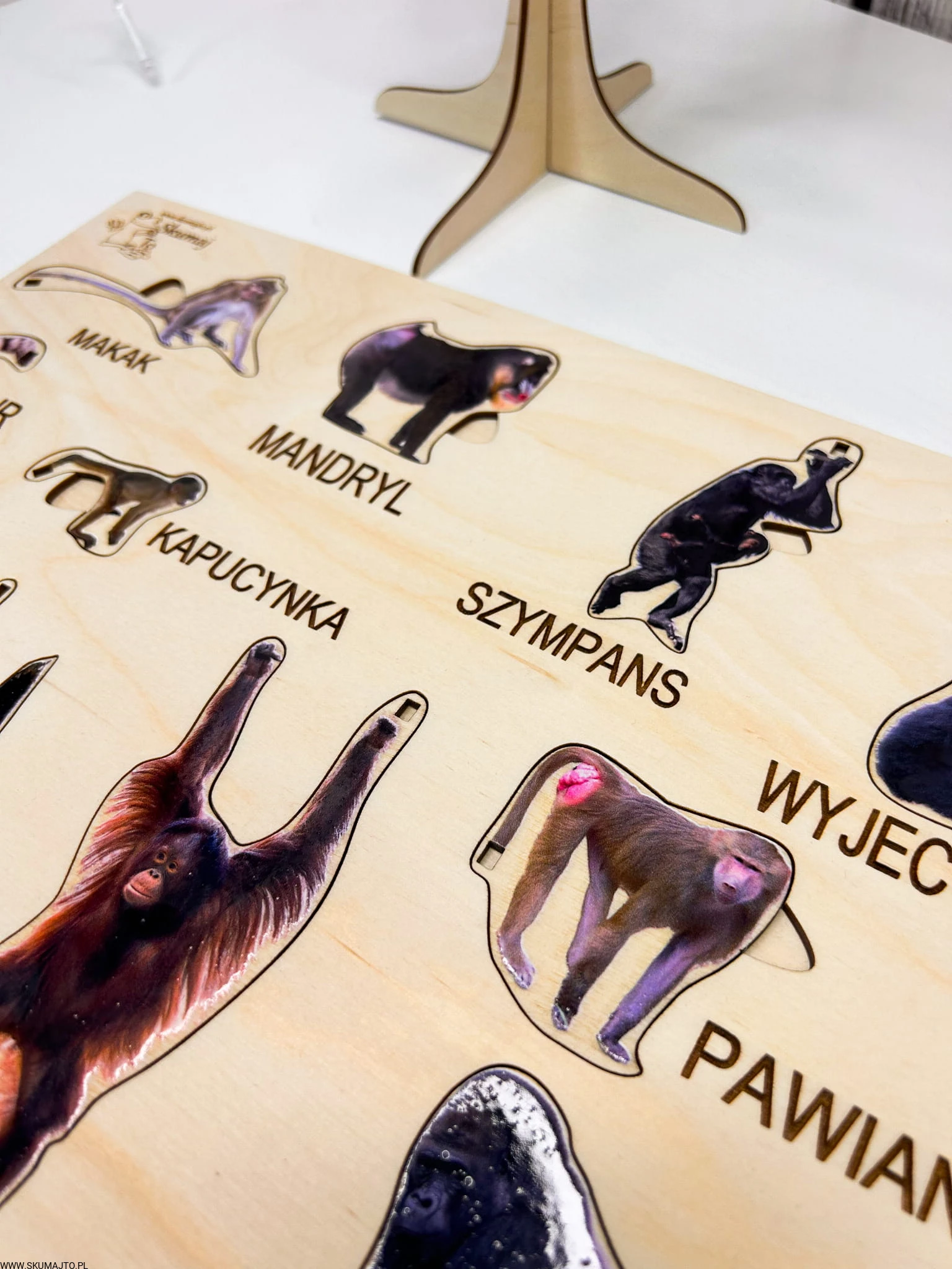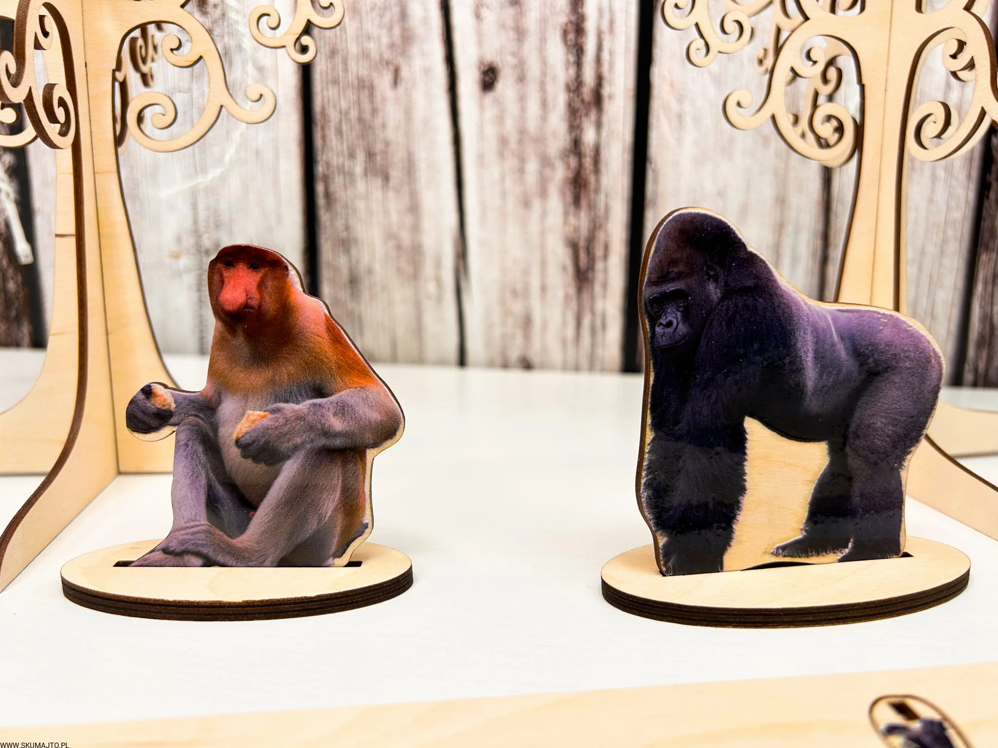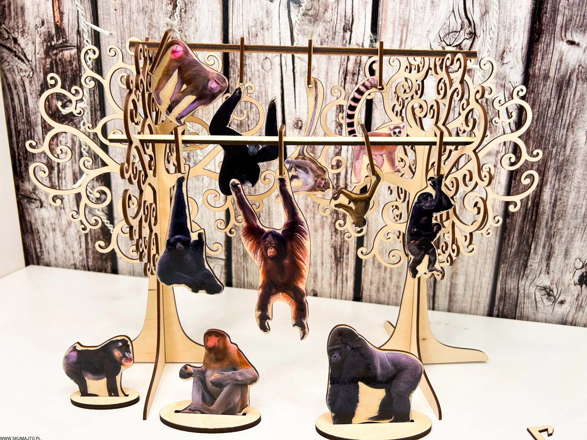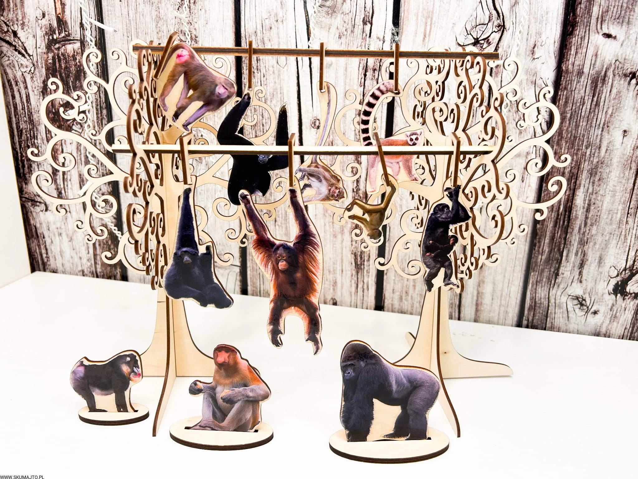 Kolorowe i podpisane gatunki małp: Każda małpka to odrębny gatunek, pięknie pomalowany i opisany, co stymuluje naukę o różnorodności w zabawie.