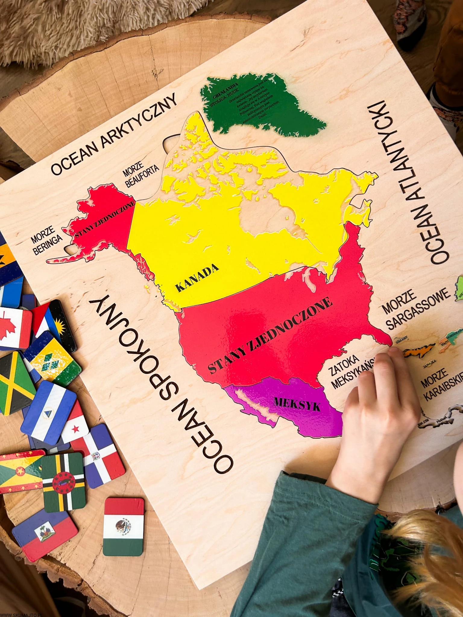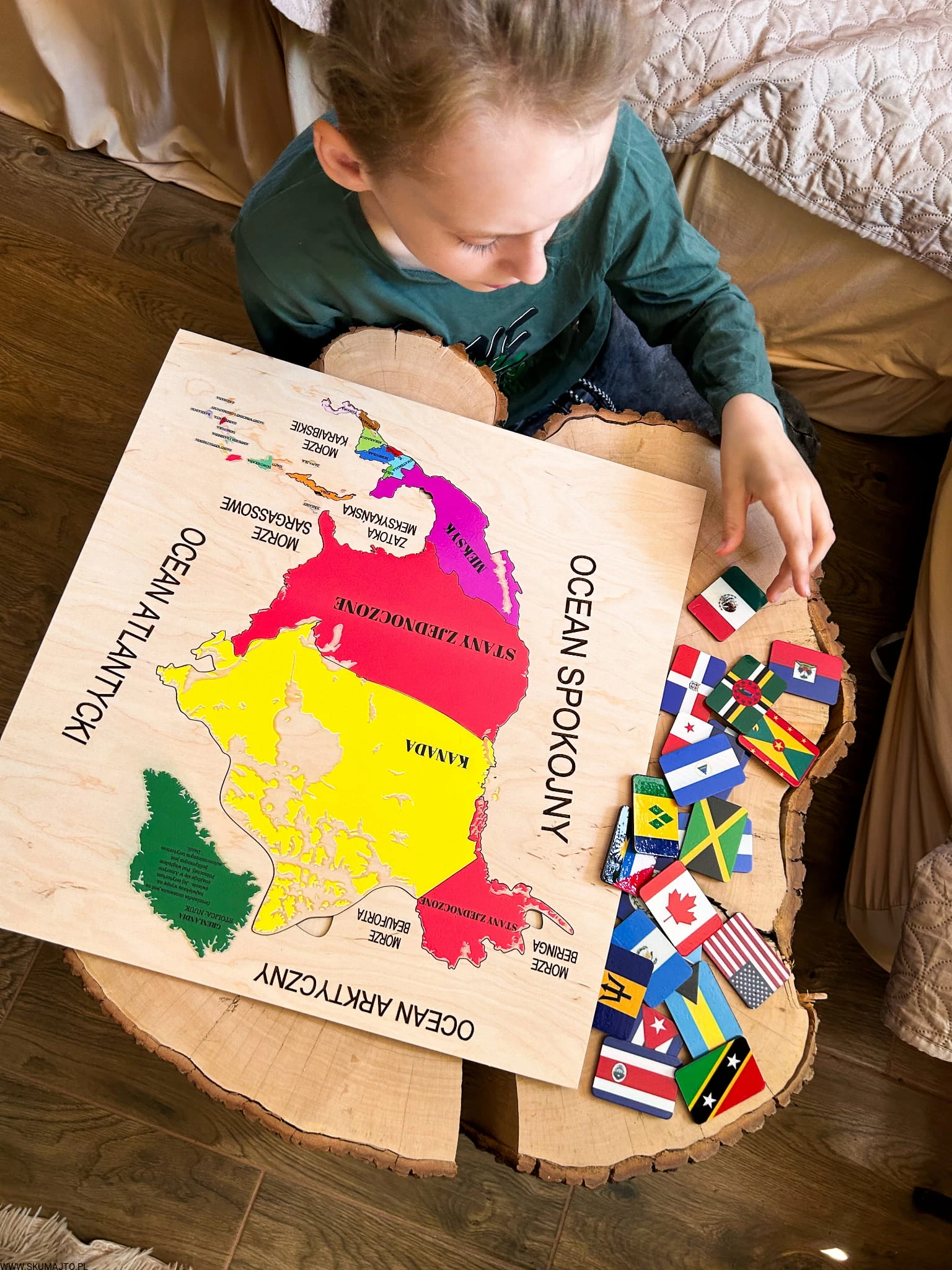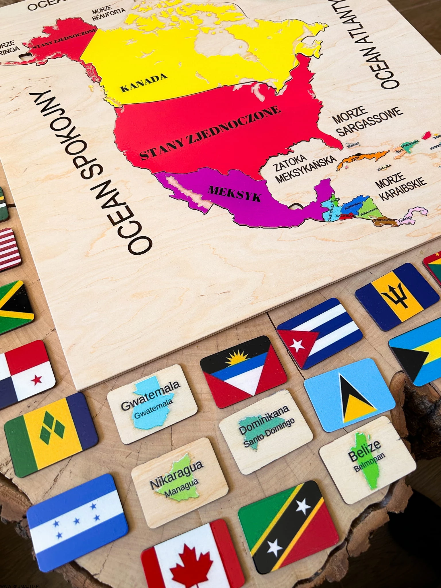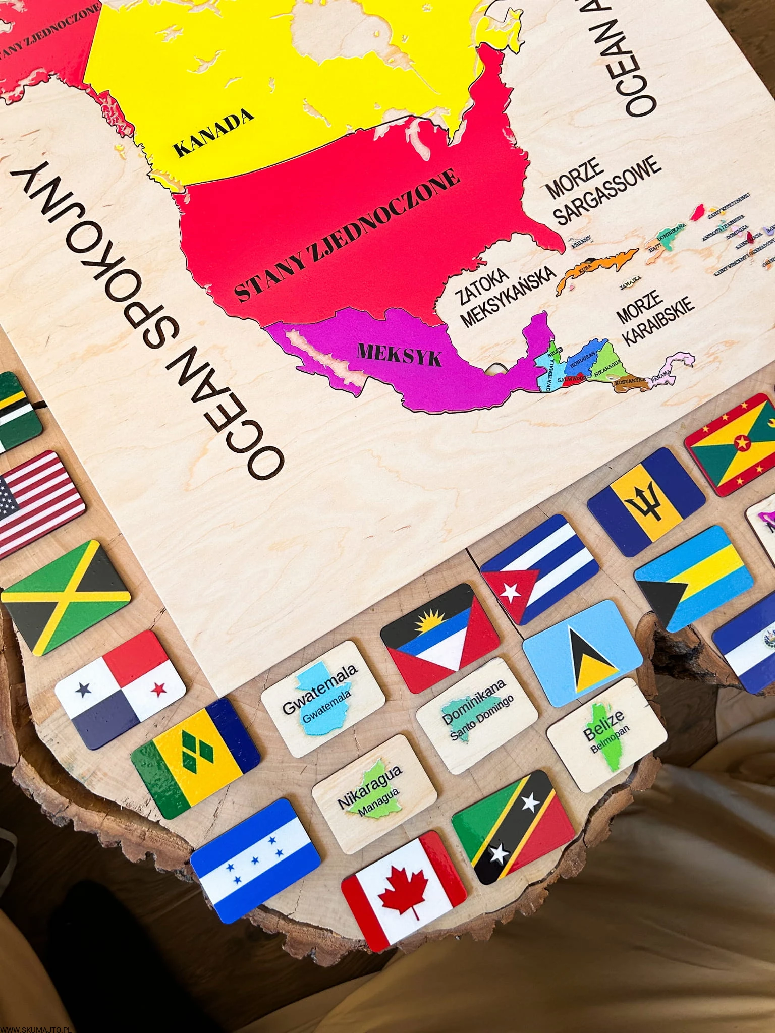 Mapa Ameryki Północnej, drewniana mapa, mapa montessori, flagi i państwa
