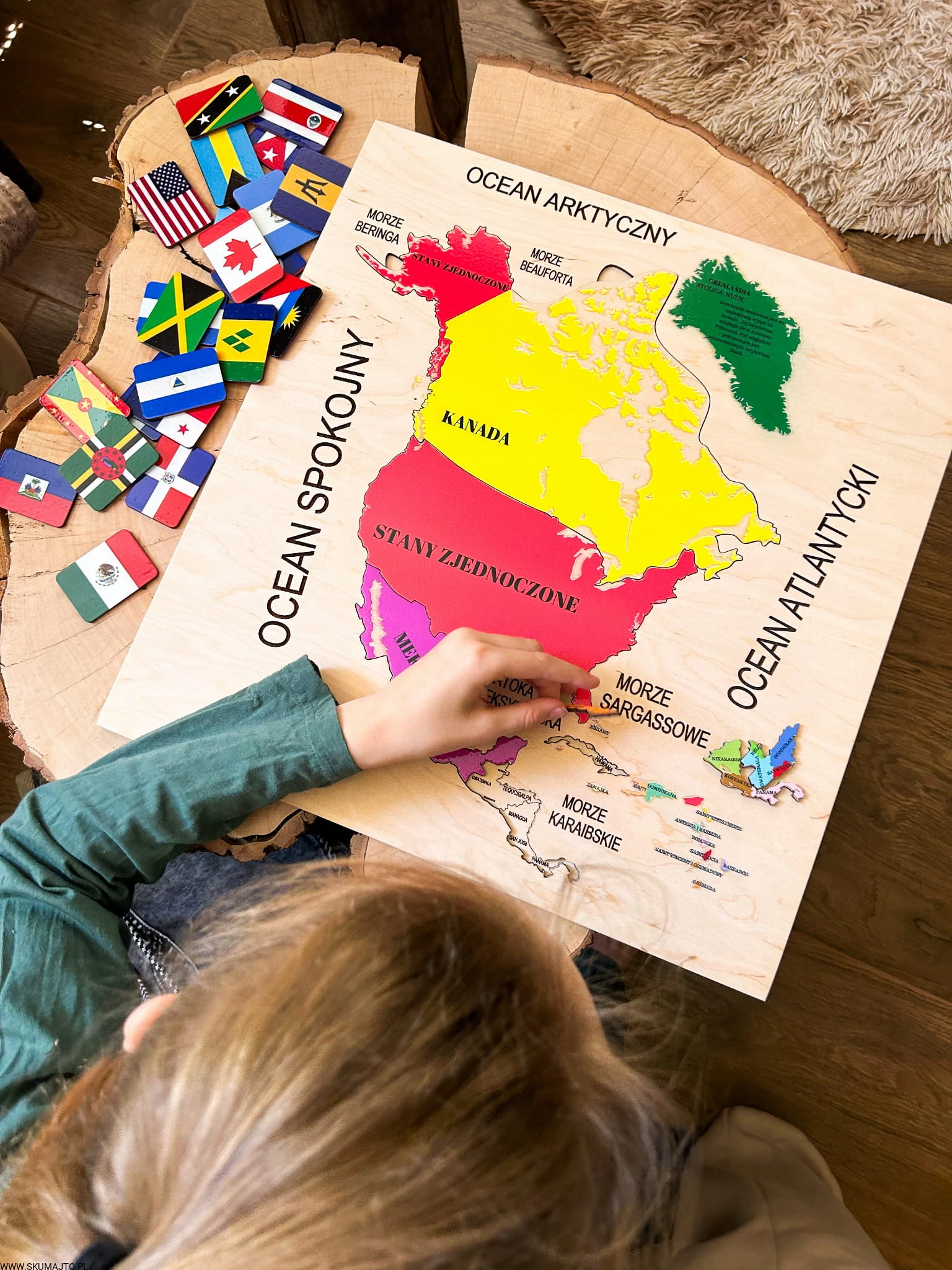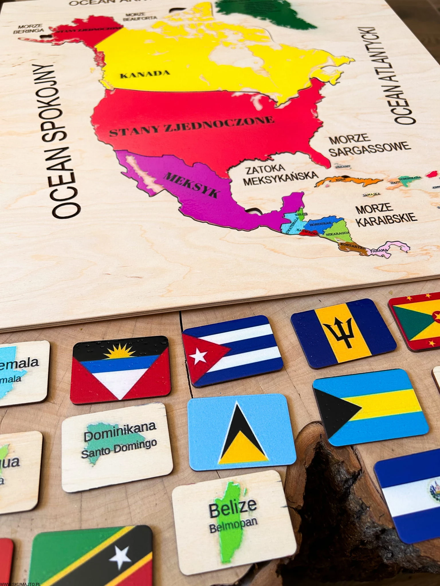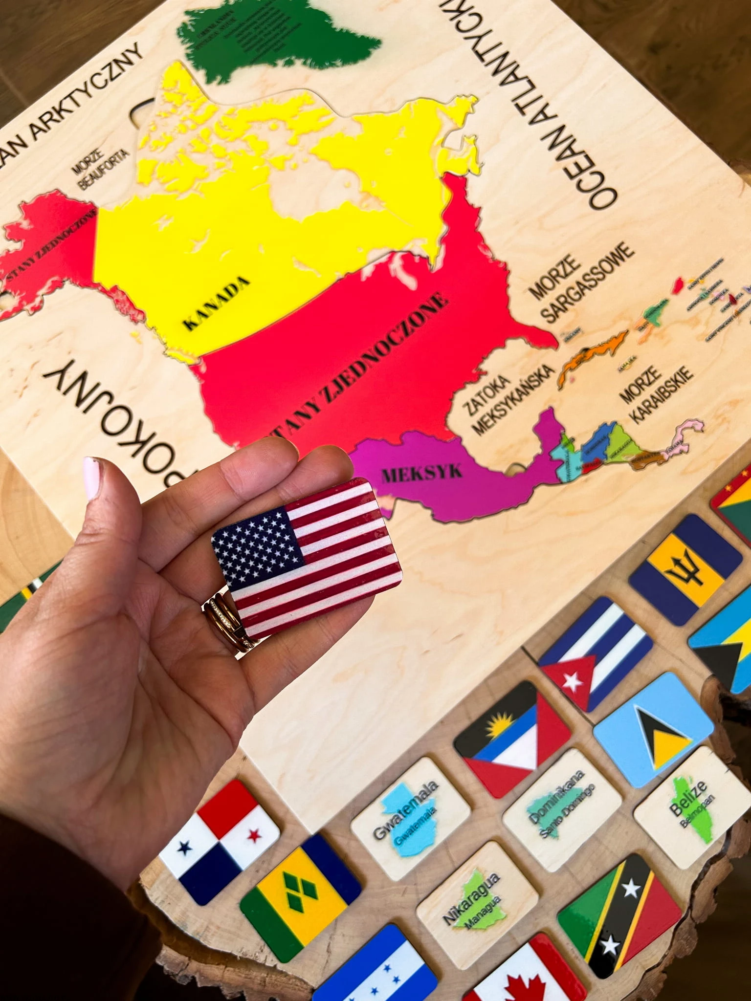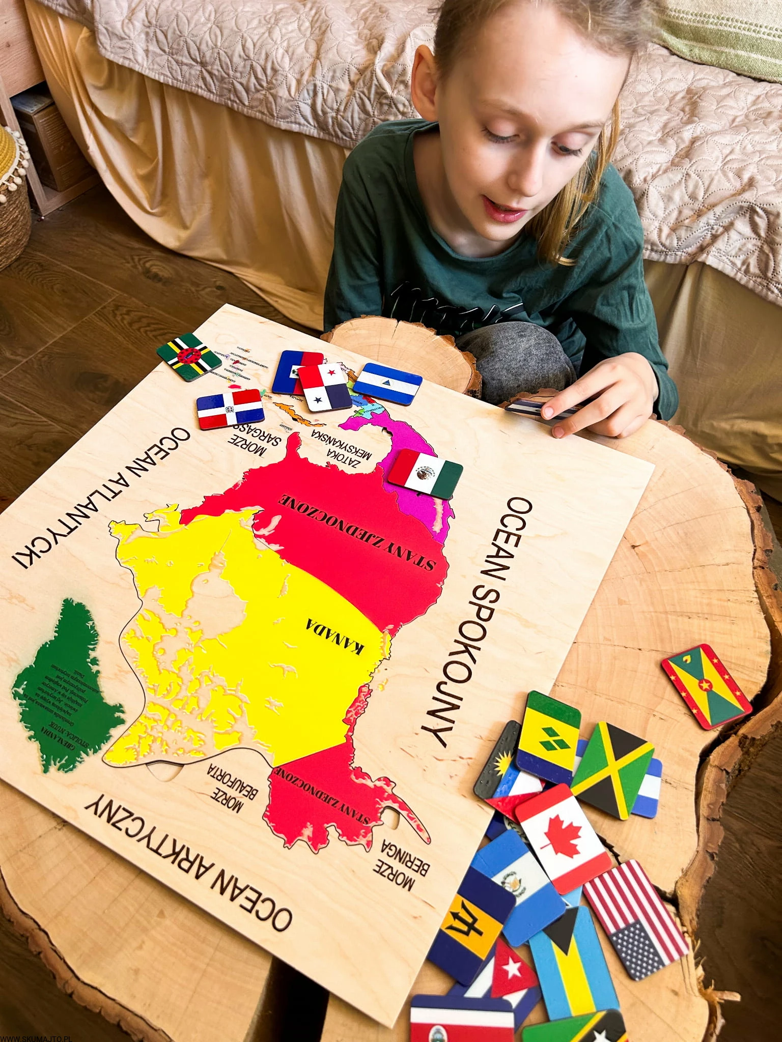 Mapa Ameryki Północnej, drewniana mapa, mapa montessori, flagi i państwa