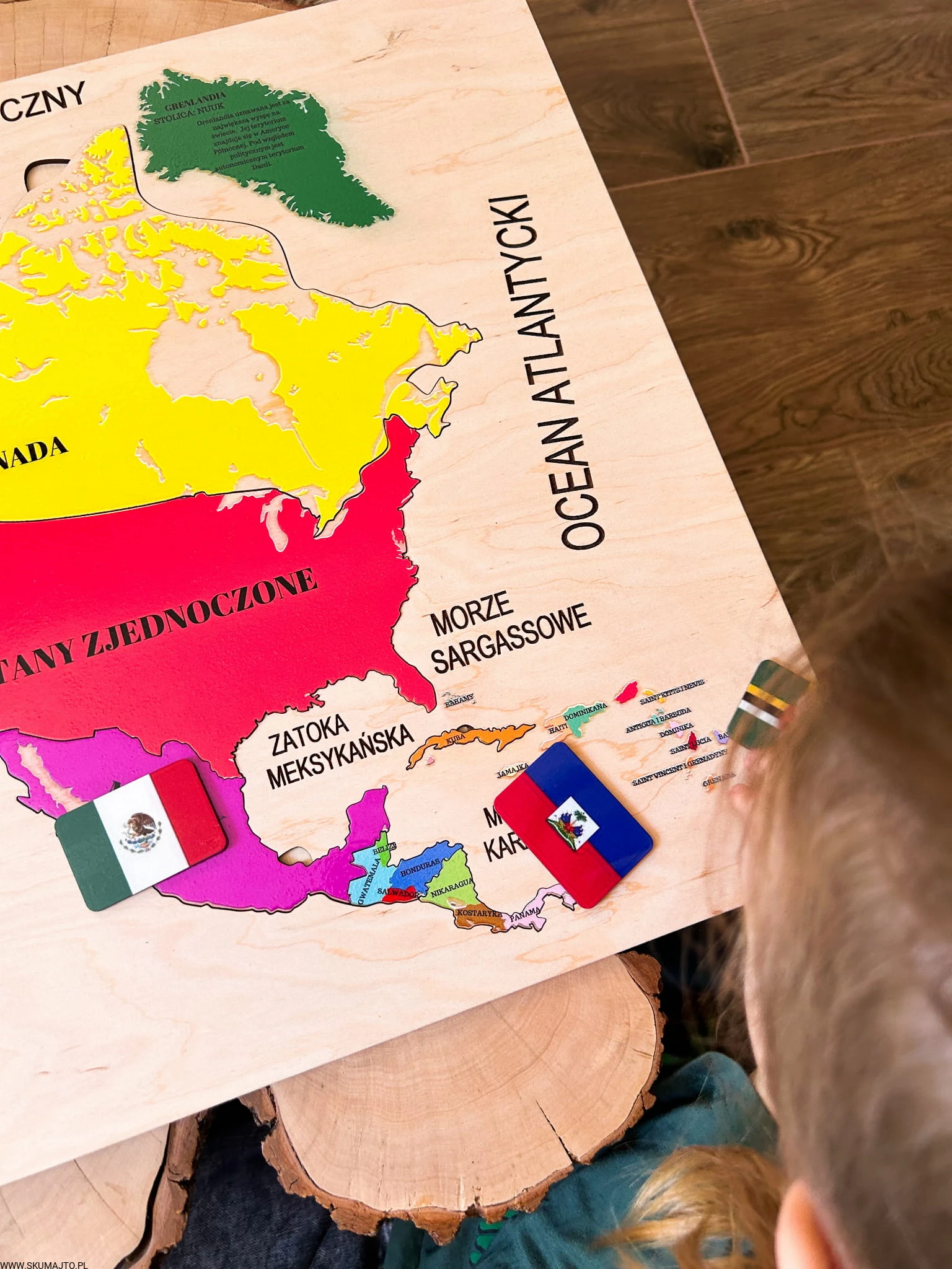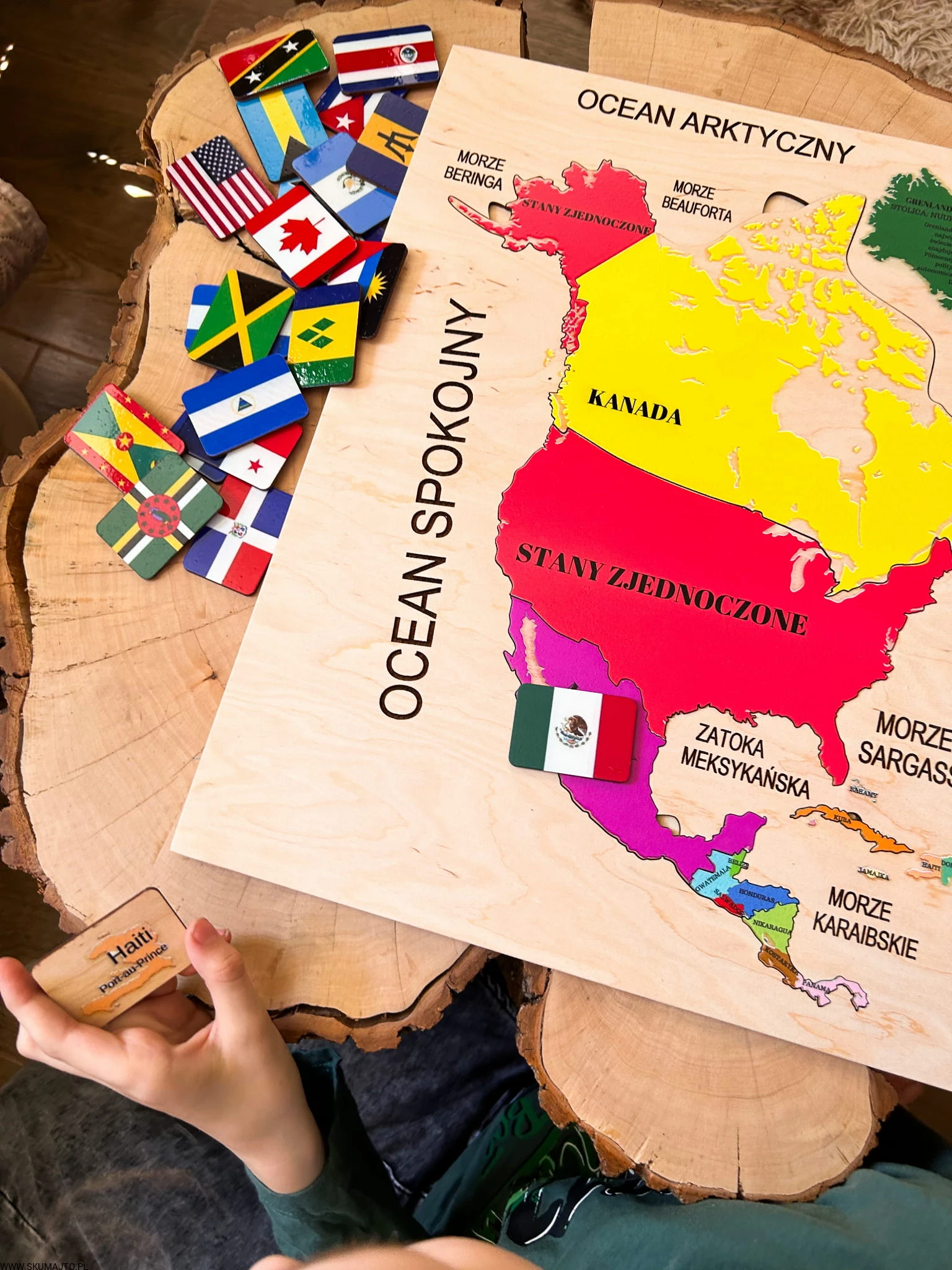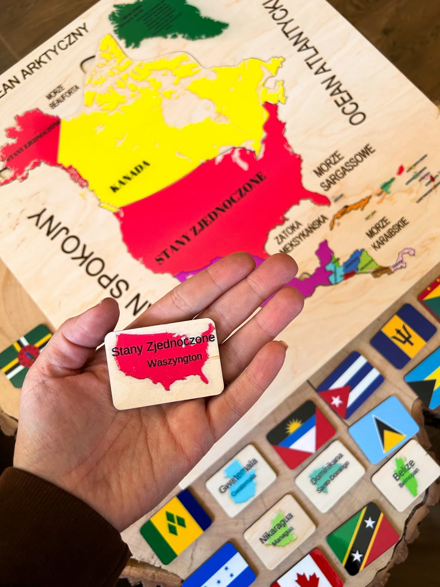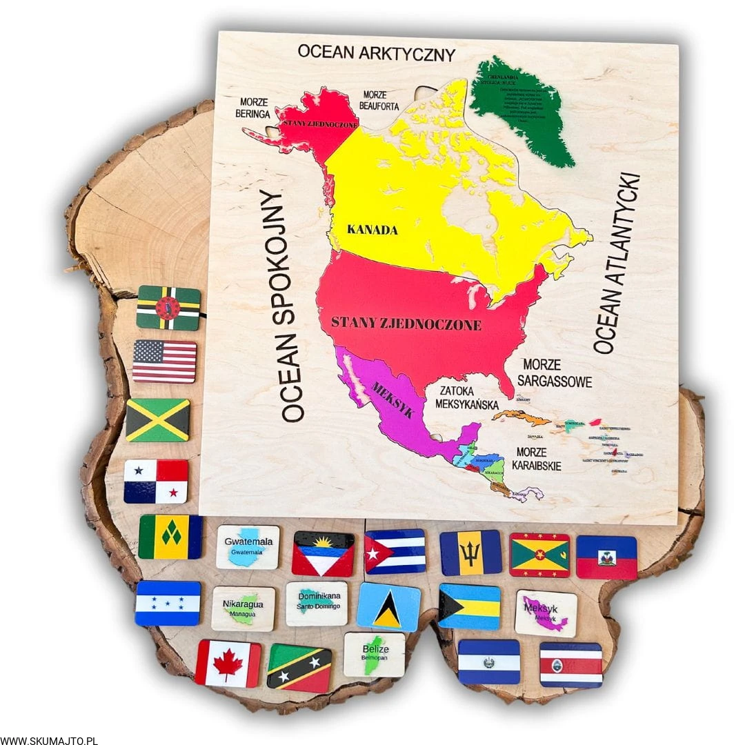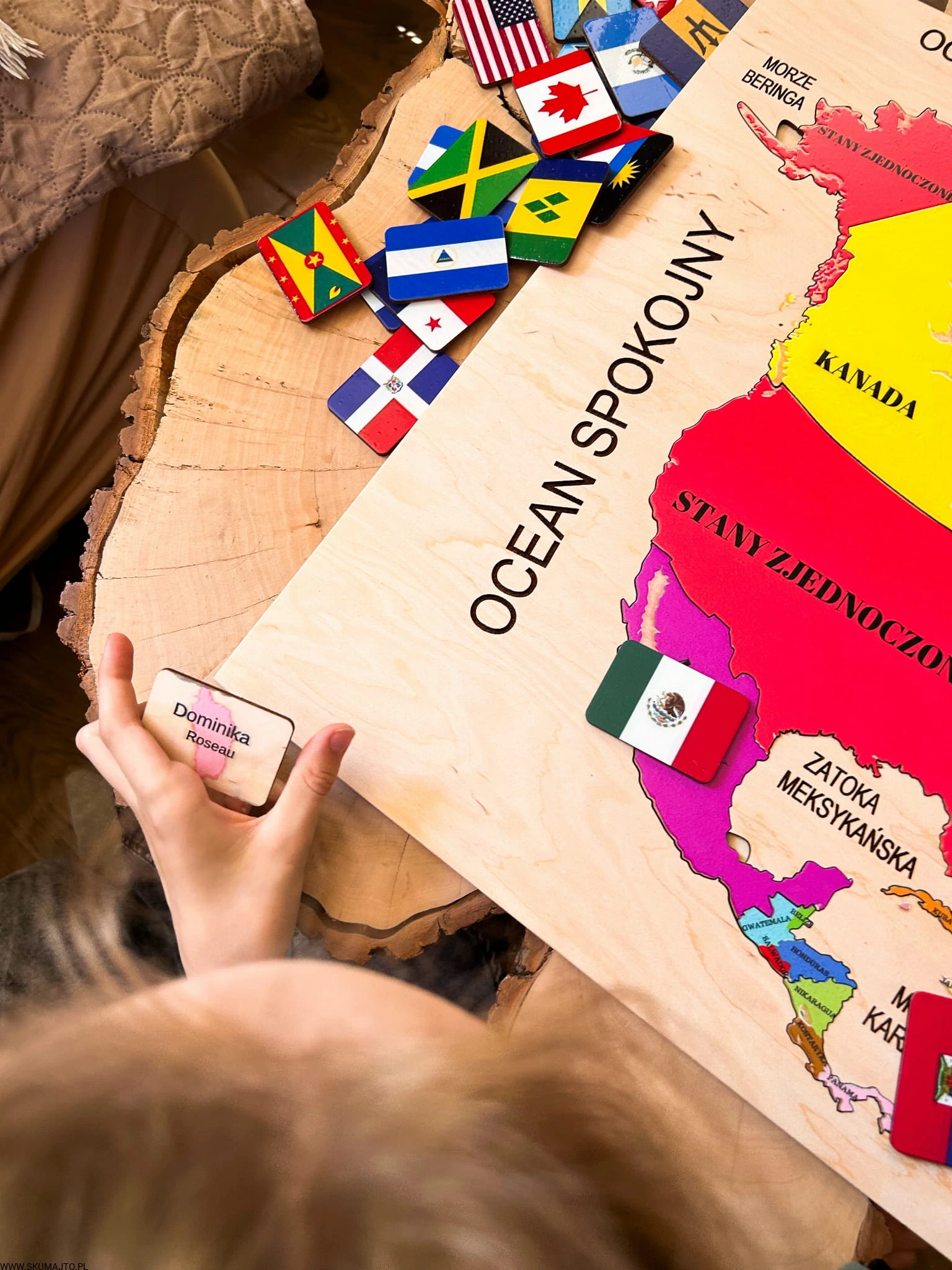 Mapa Ameryki Północnej, drewniana mapa, mapa montessori, flagi i państwa