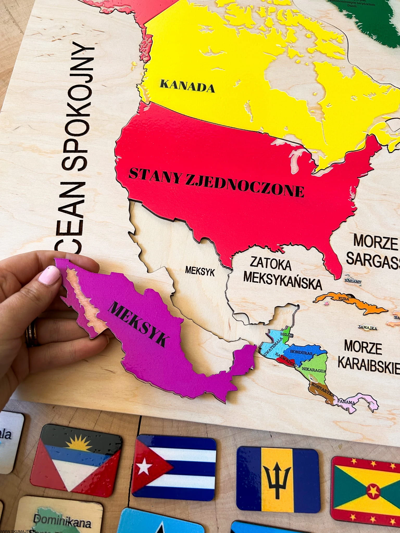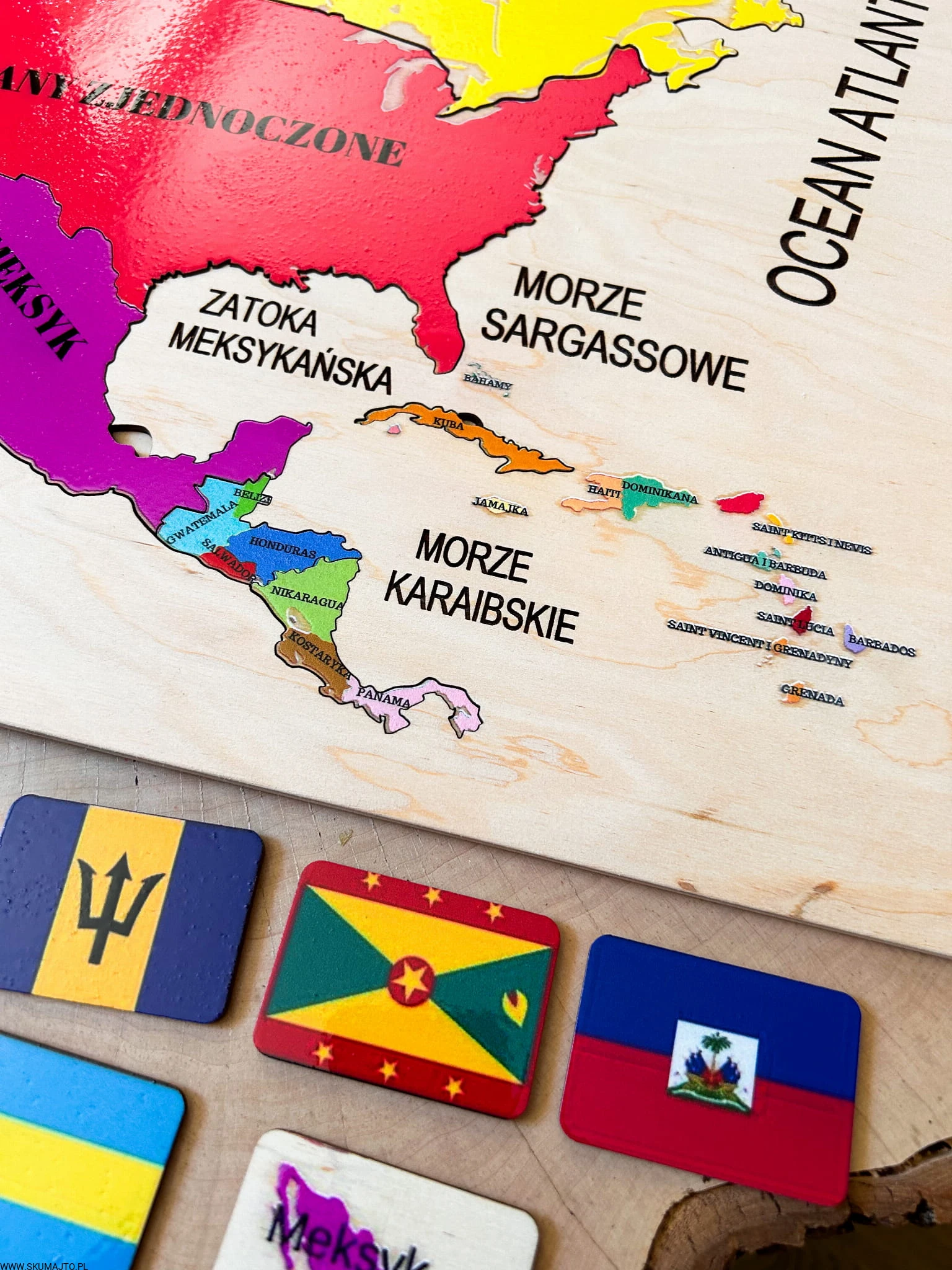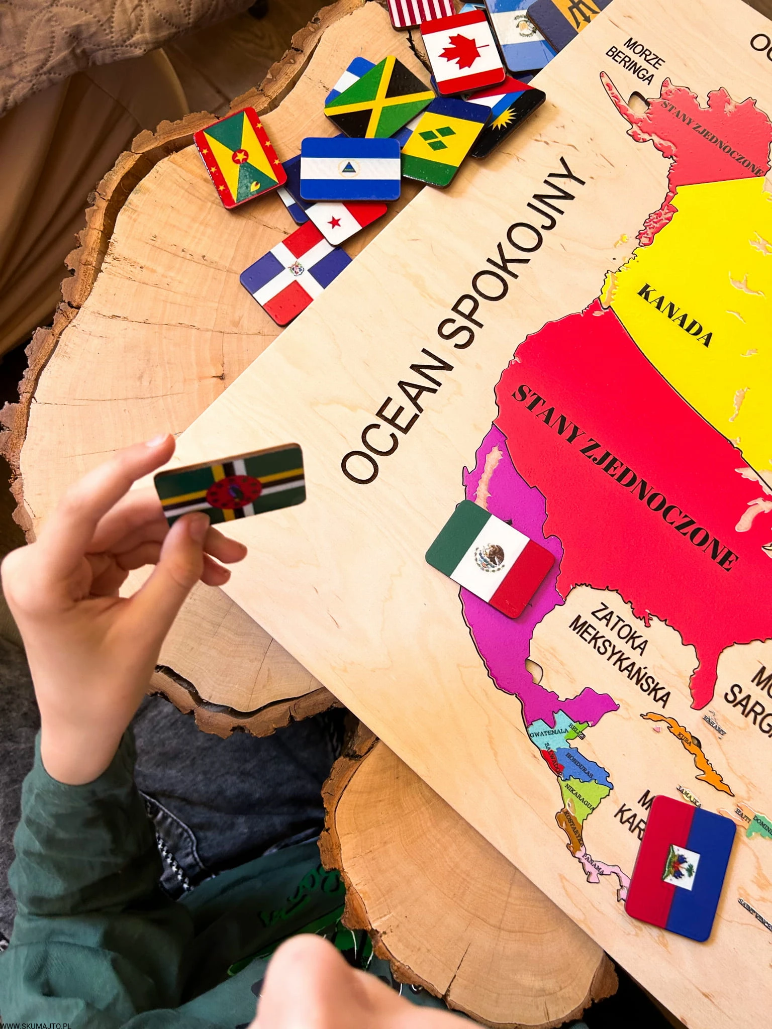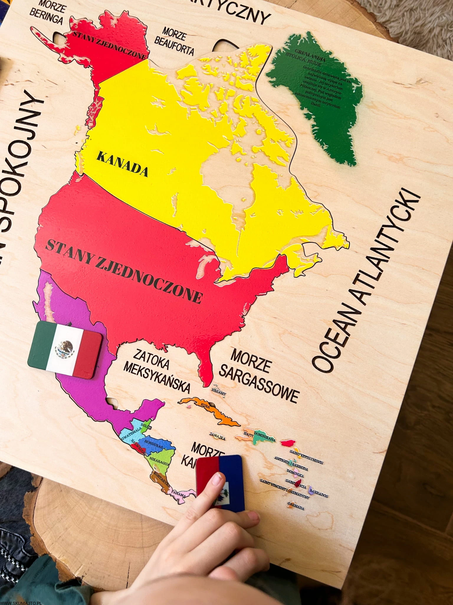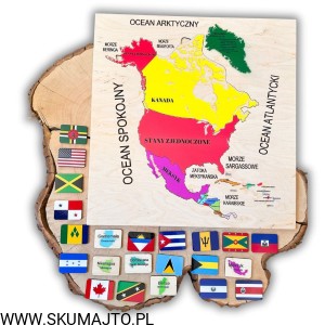 Mapa Ameryki Północnej, drewniana mapa, mapa montessori, flagi i państwa