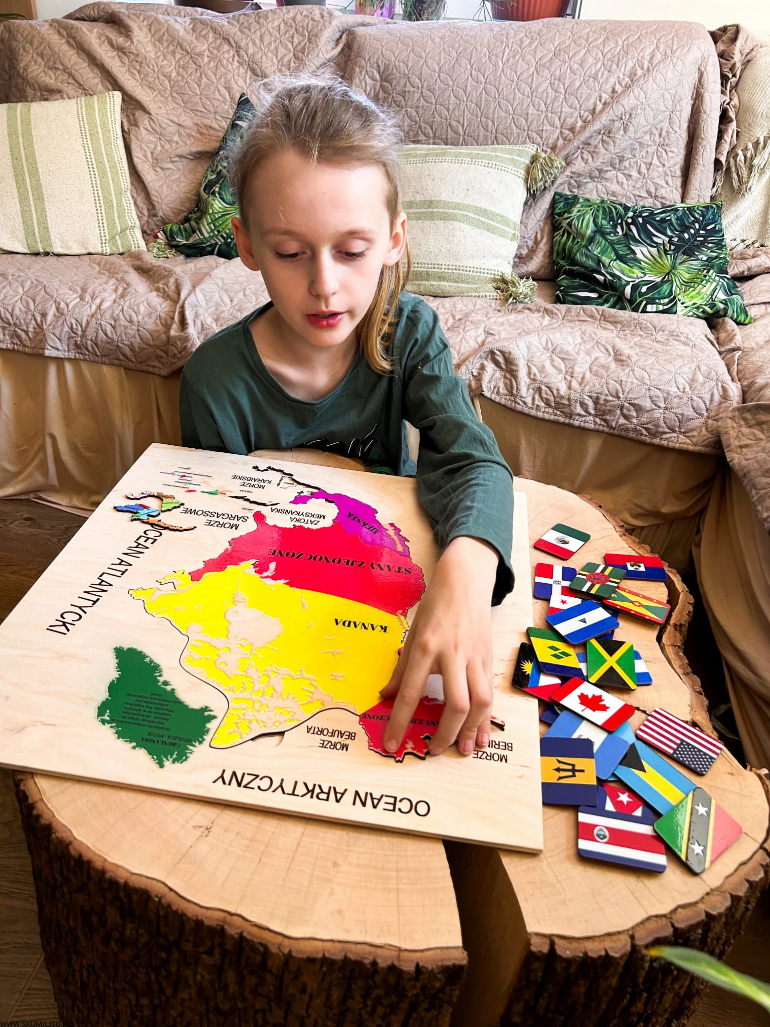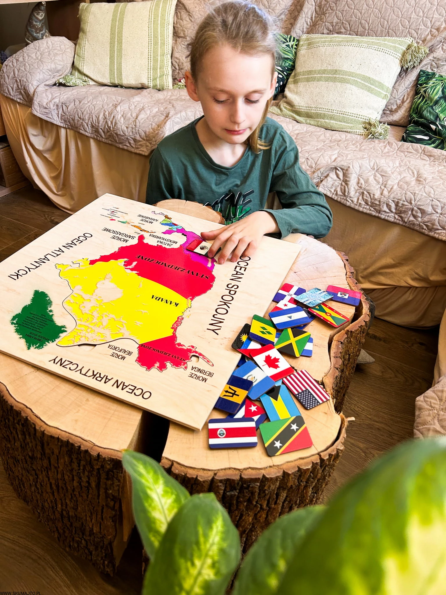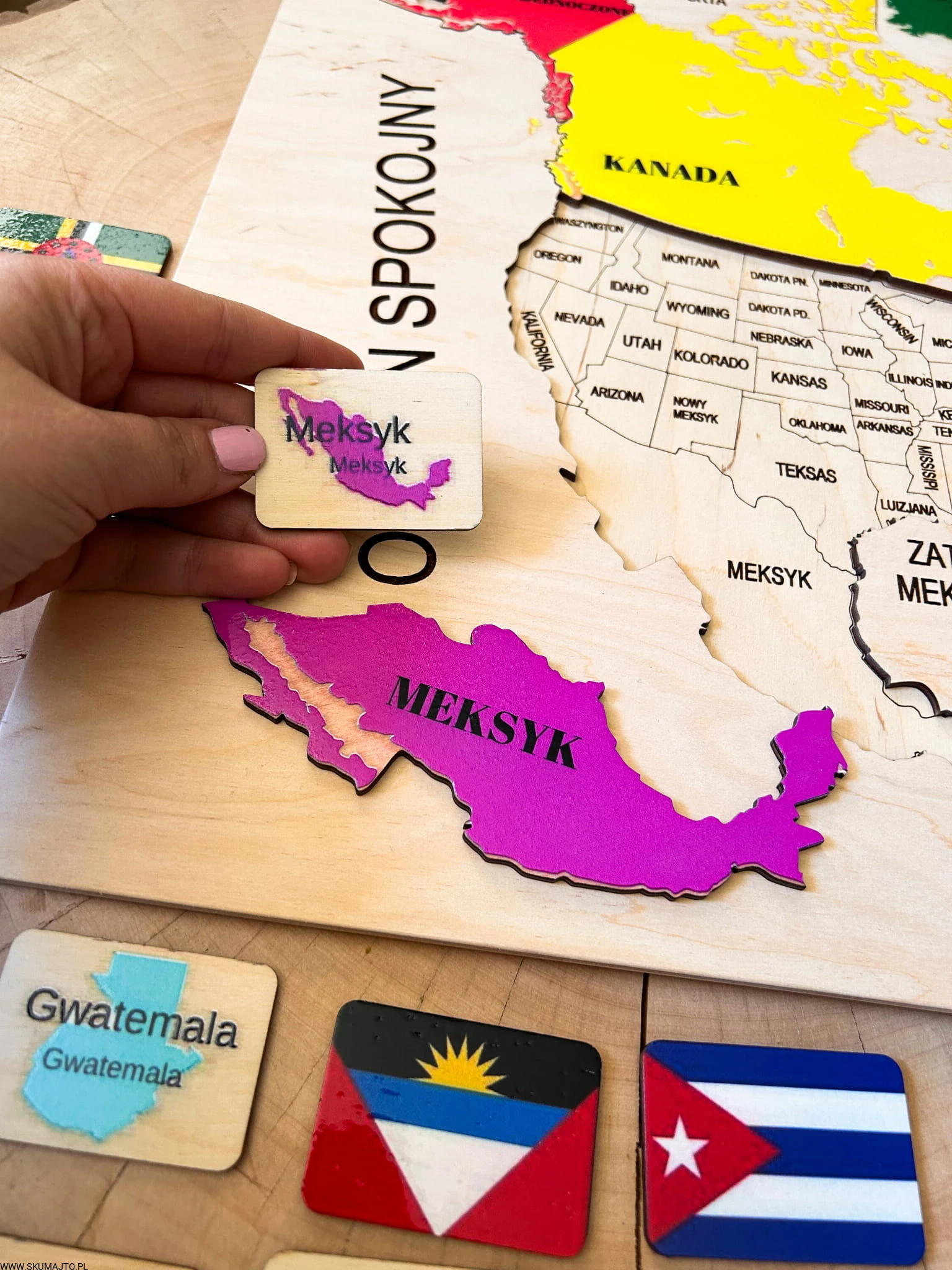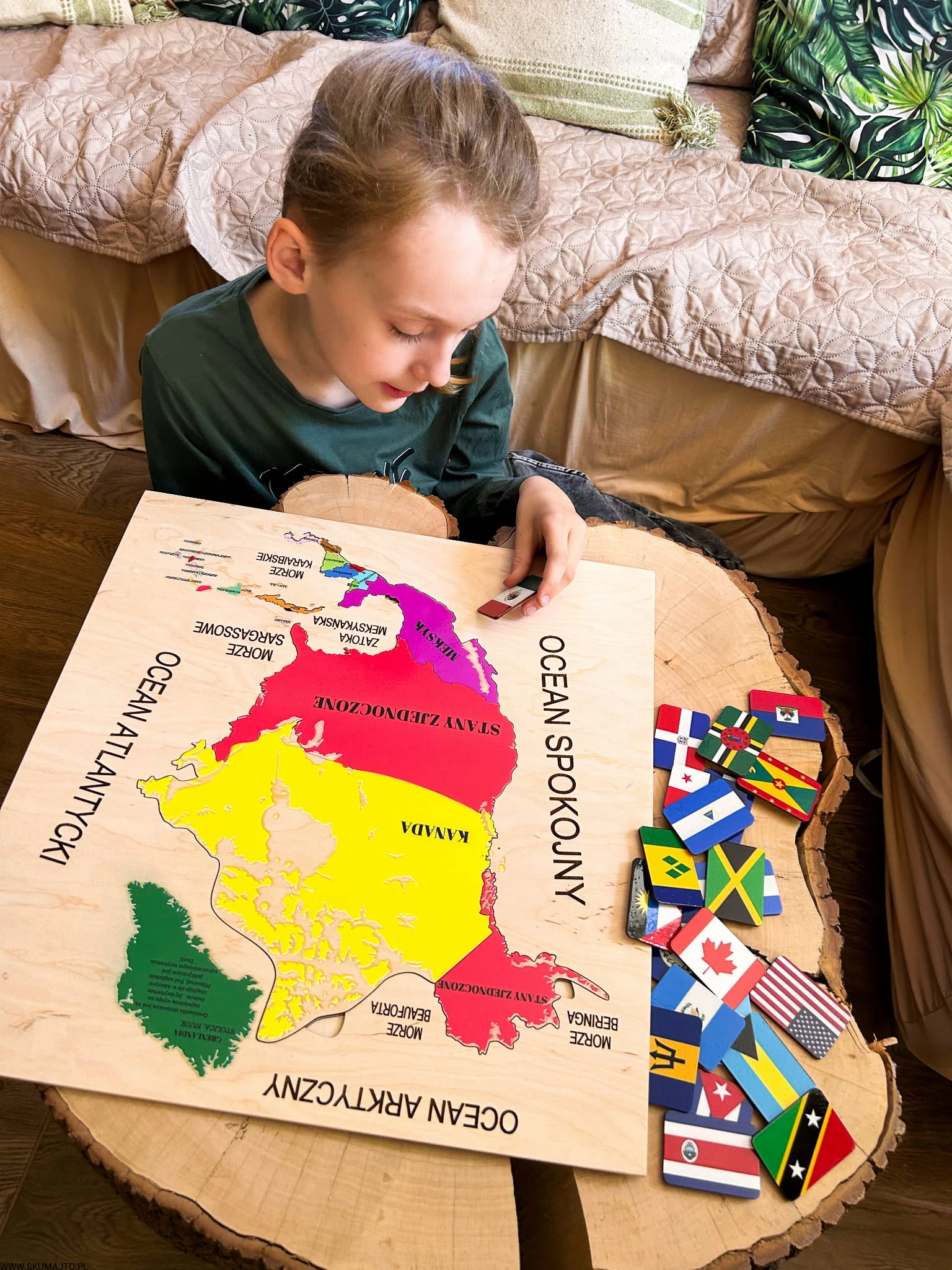 Mapa Ameryki Północnej, drewniana mapa, mapa montessori, flagi i państwa