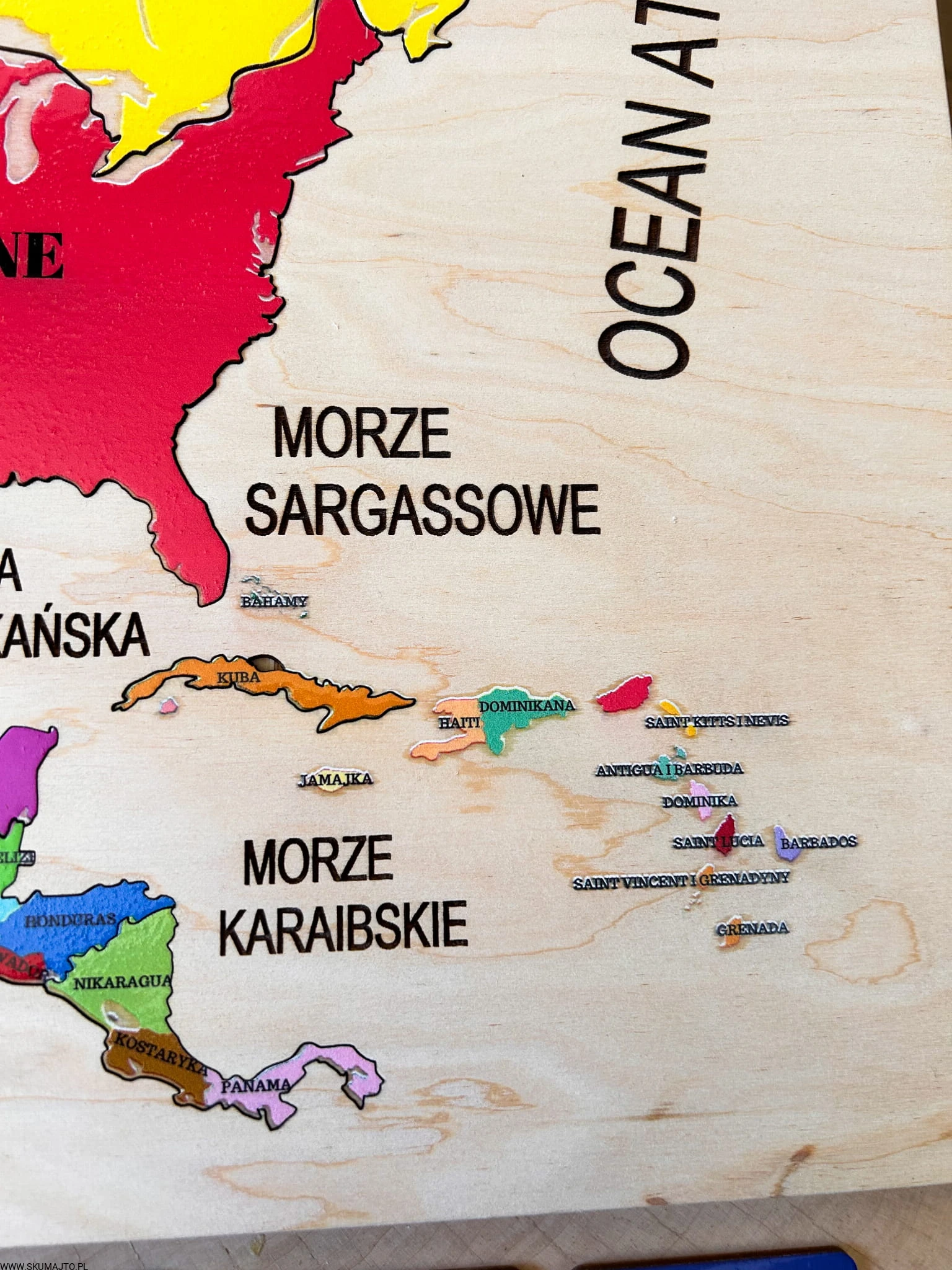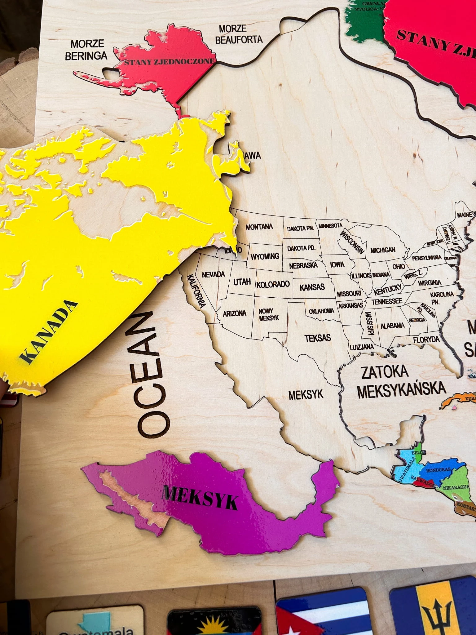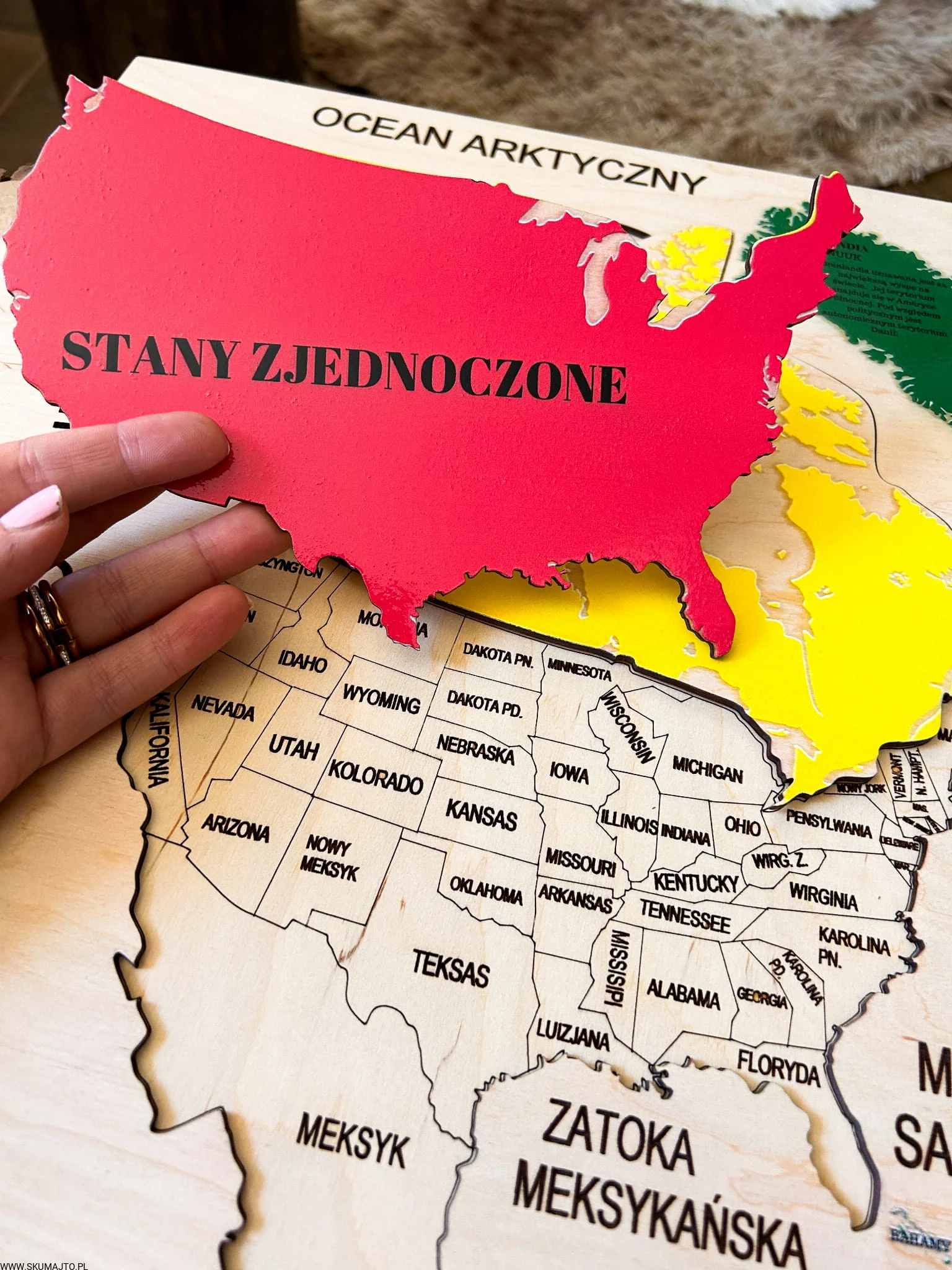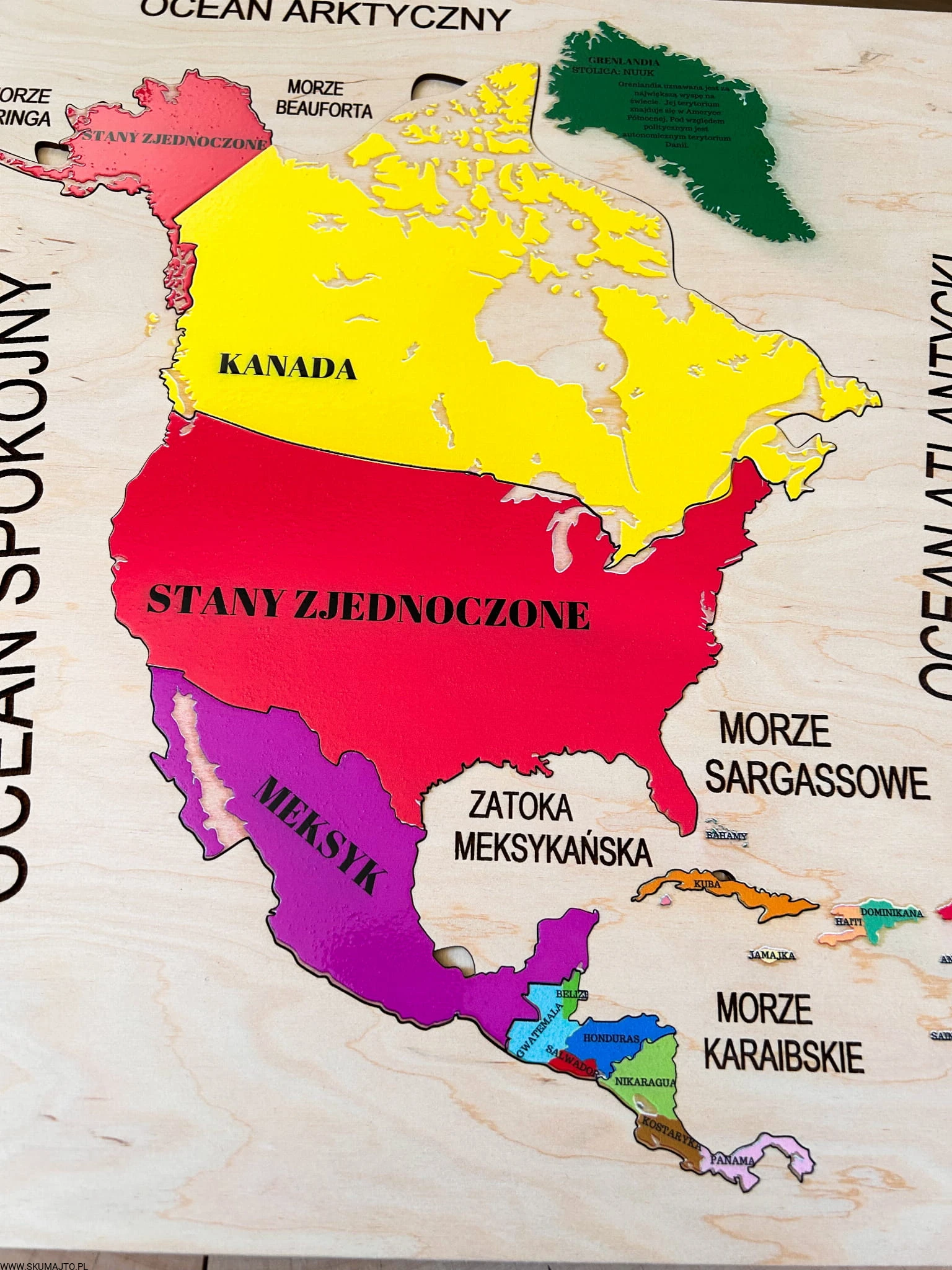 Drewniana Mapa Edukacyjna Ameryki Północnej – Odkryj Kontynent w Kolorach i Kształtach!