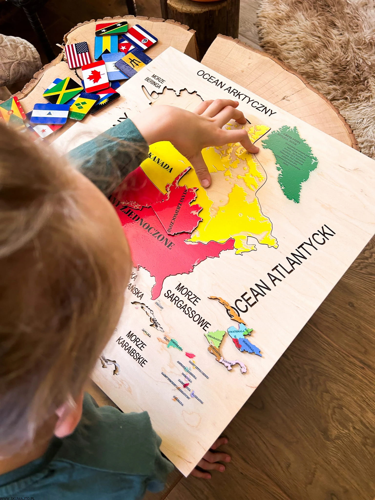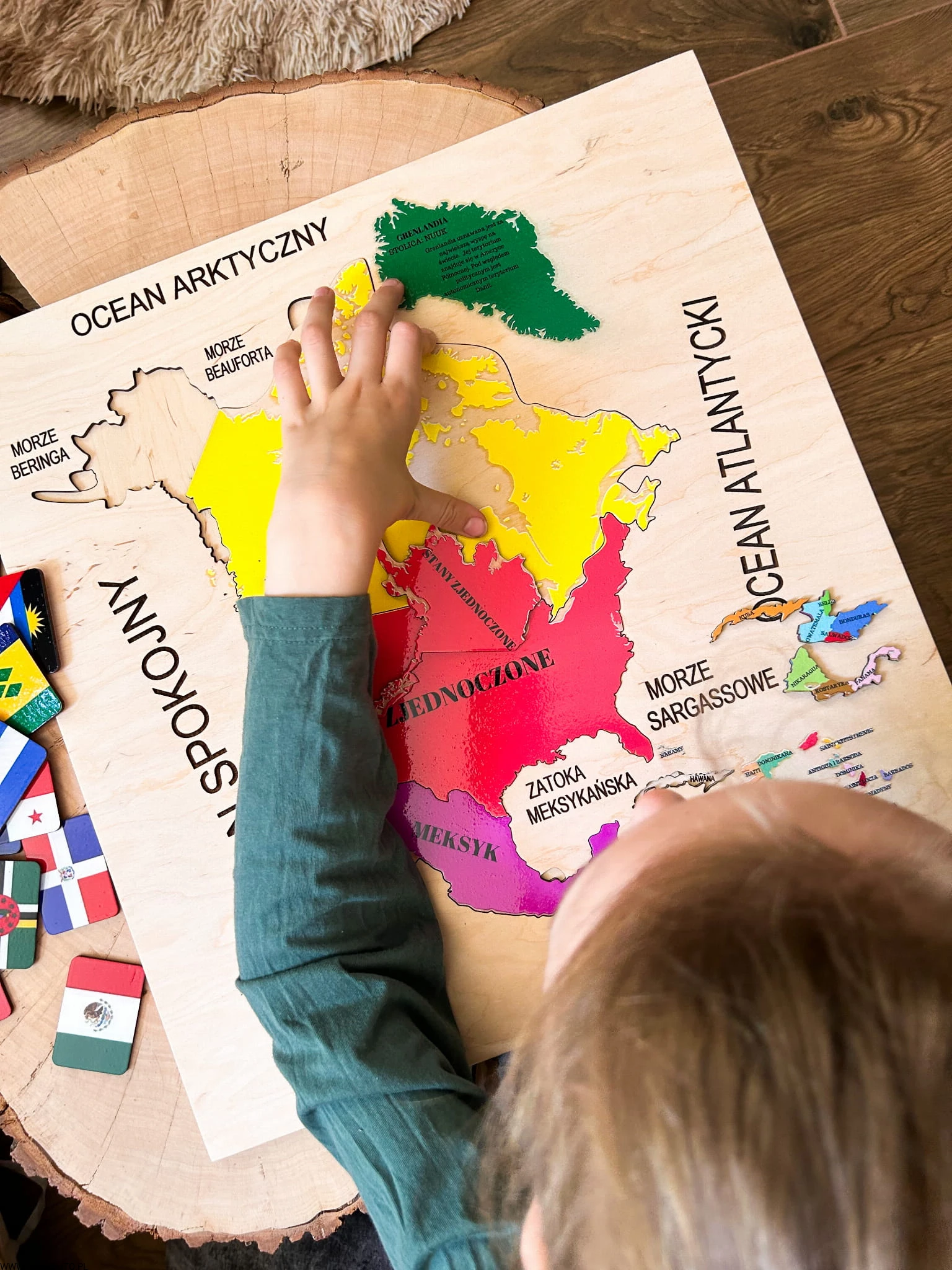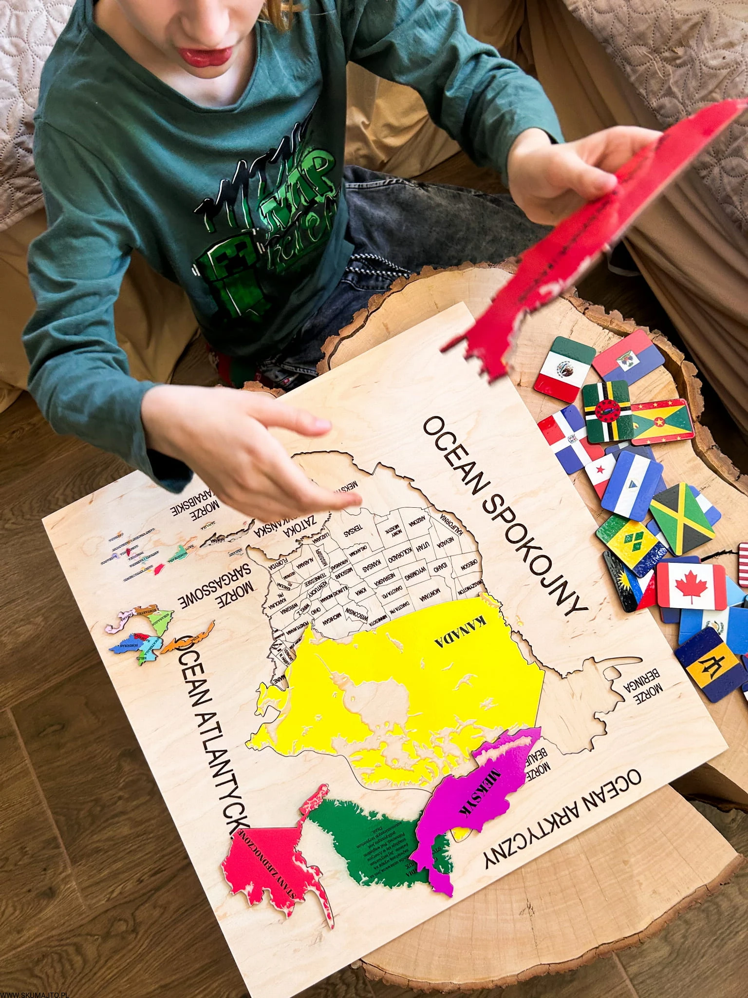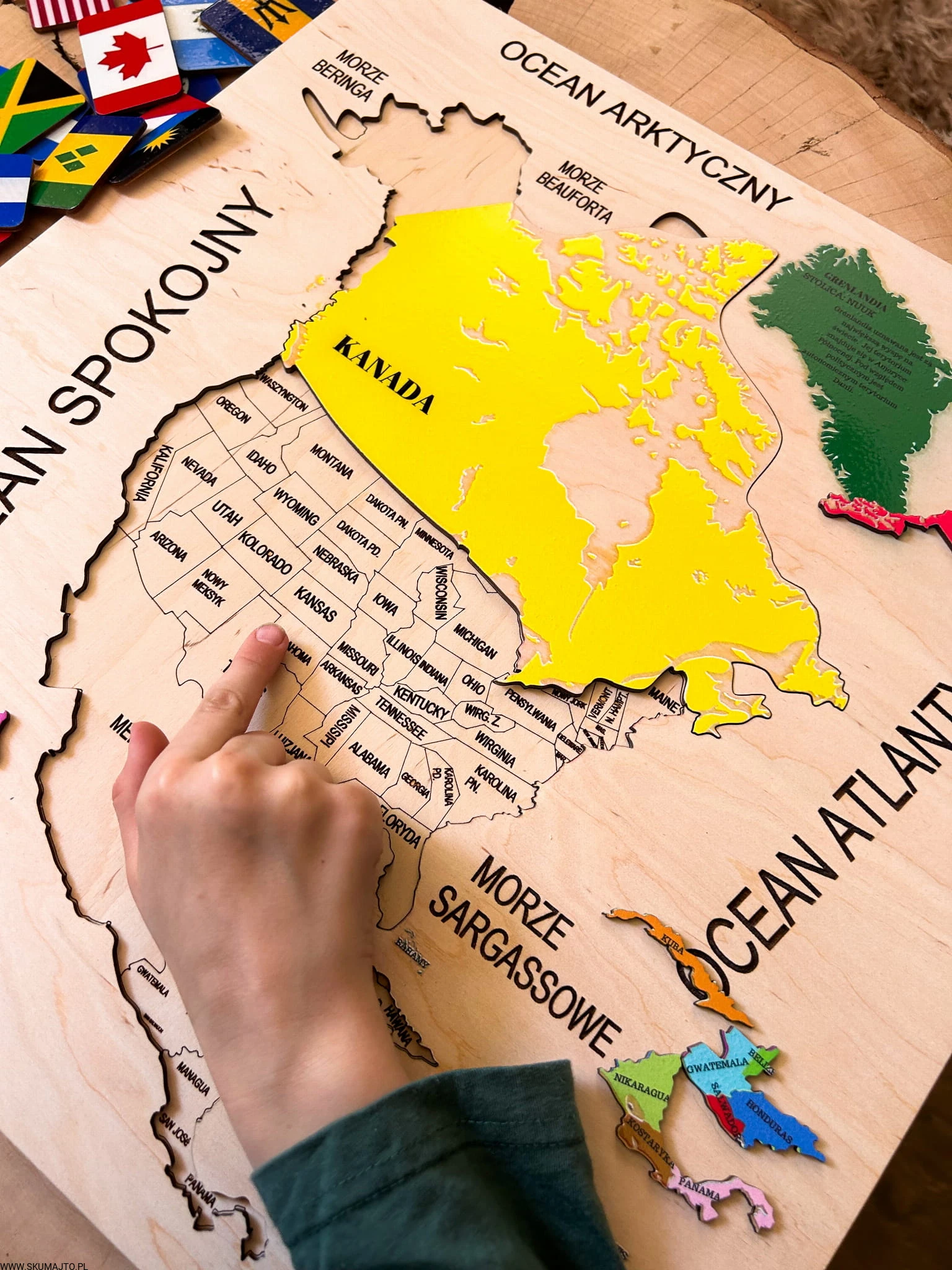 Pozwól swojemu dziecku odkrywać Amerykę Północną z naszą drewnianą mapą edukacyjną – niech każdy dzień przynosi nowe odkrycia!
