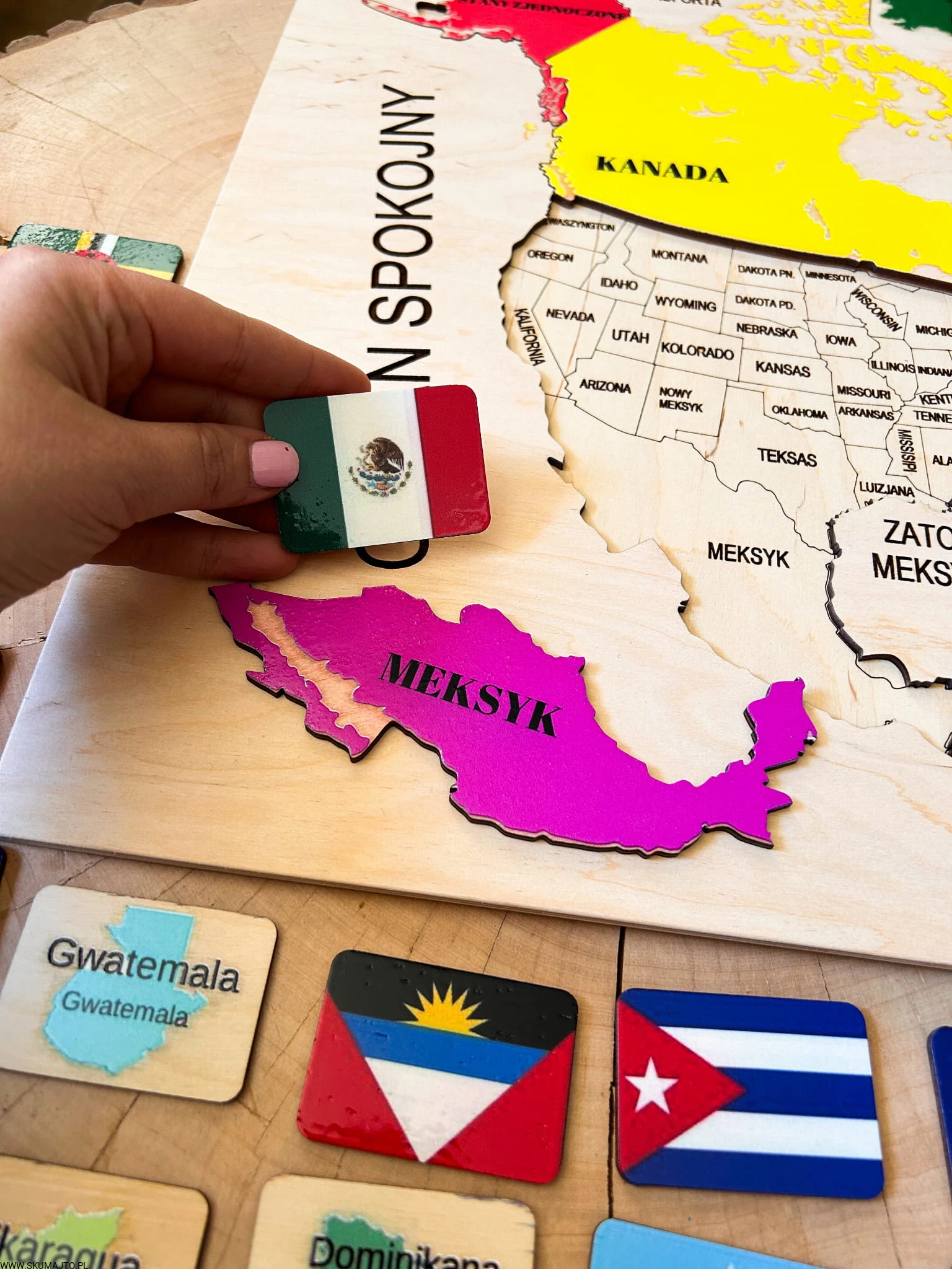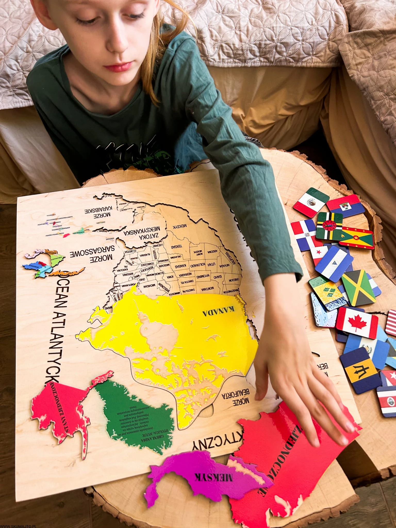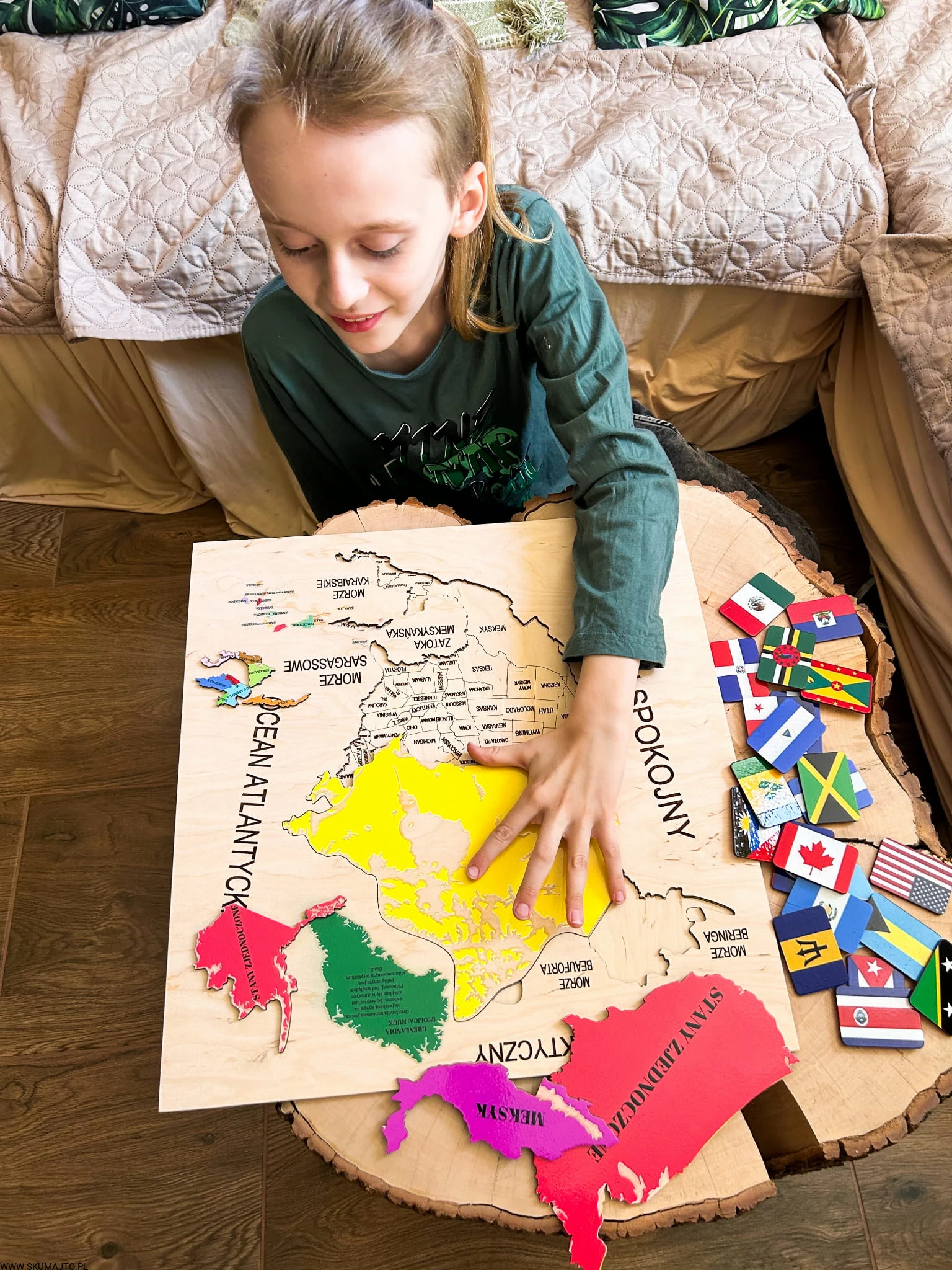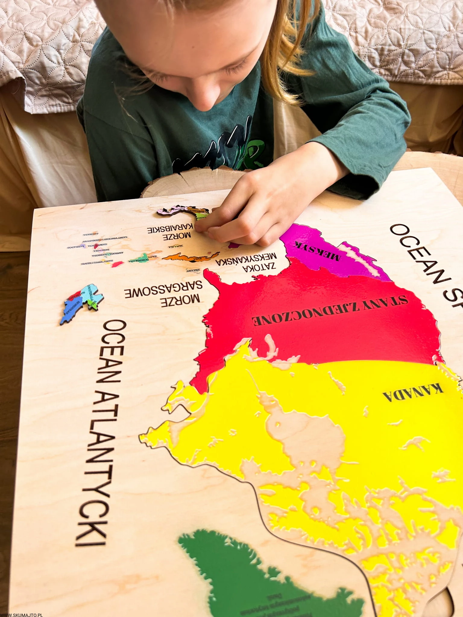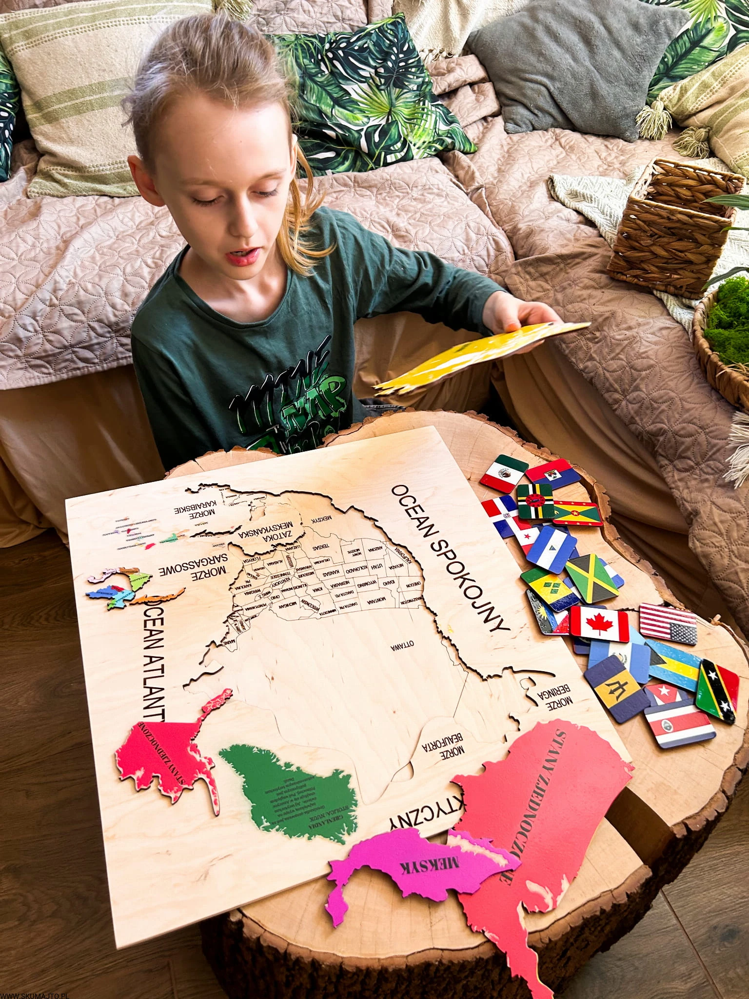 Pozwól swojemu dziecku odkrywać Amerykę Północną z naszą drewnianą mapą edukacyjną – niech każdy dzień przynosi nowe odkrycia!