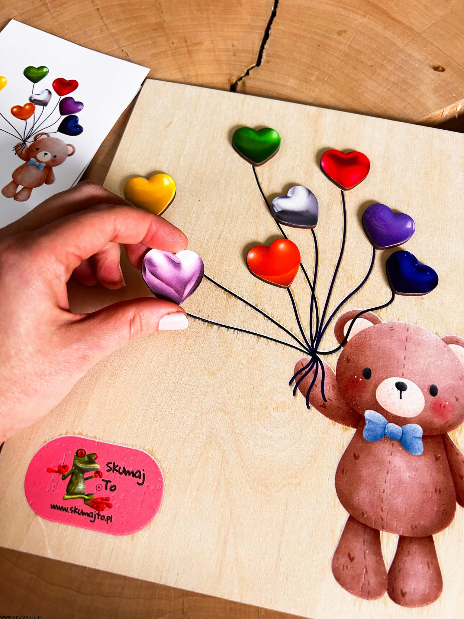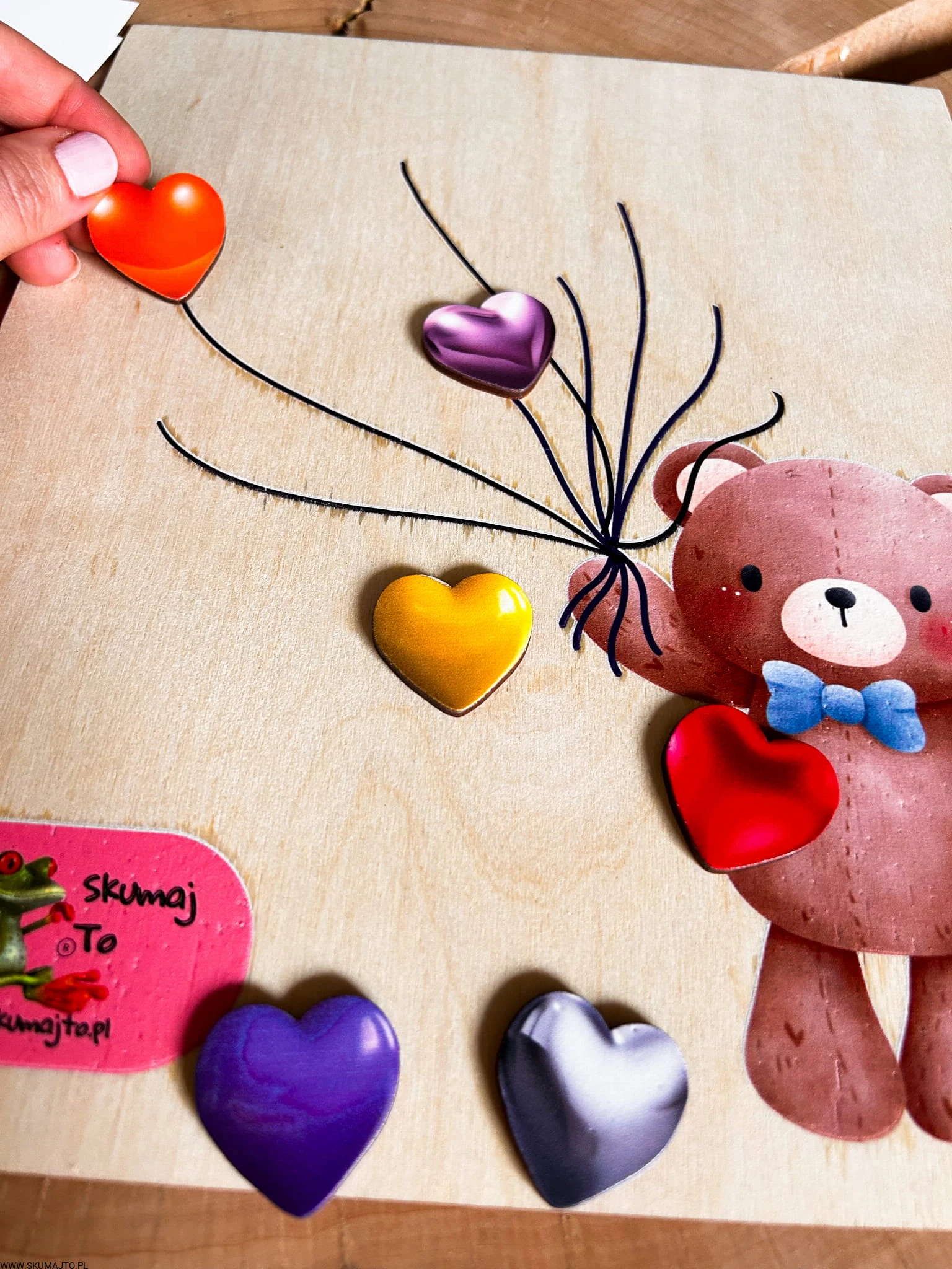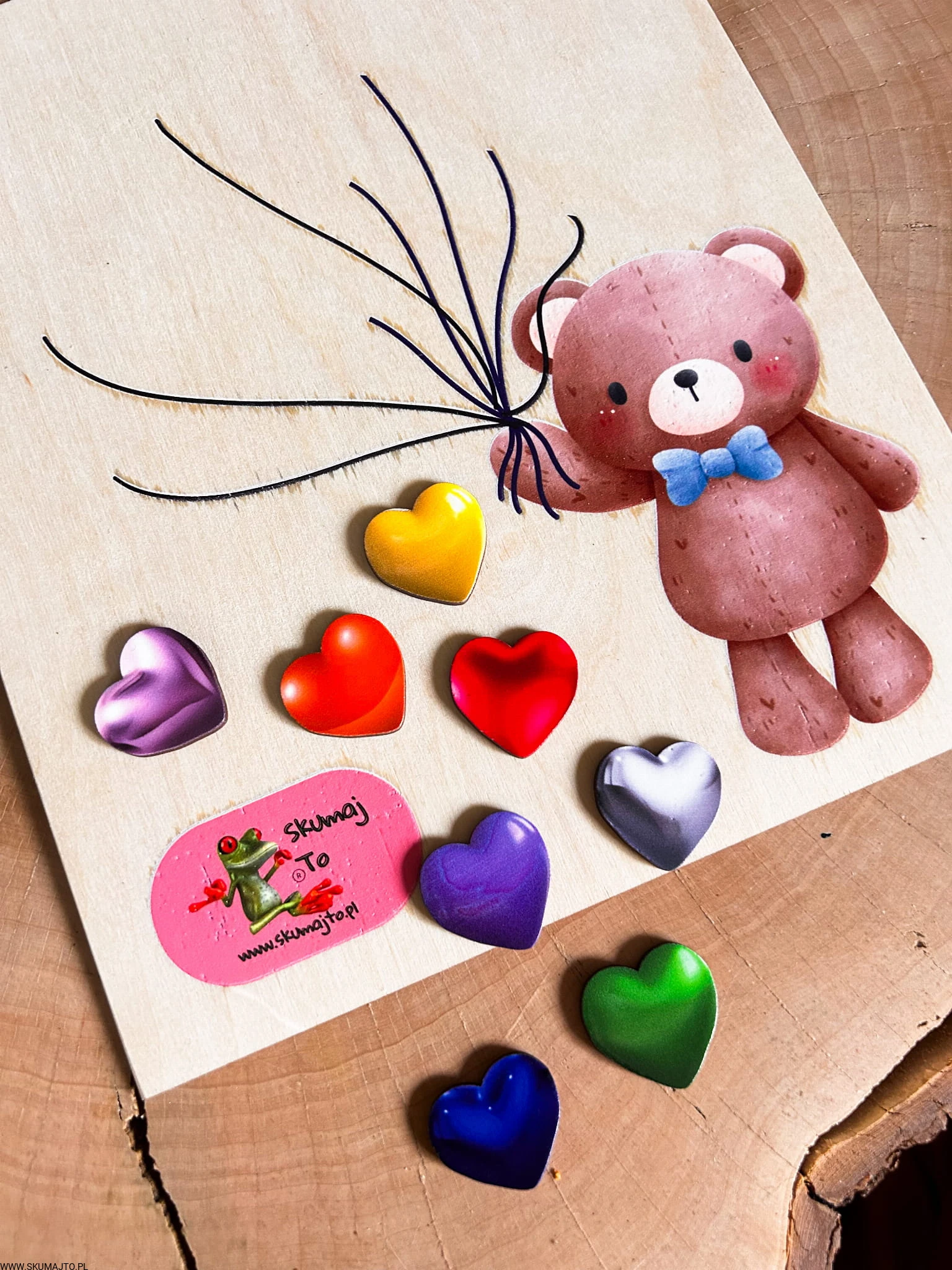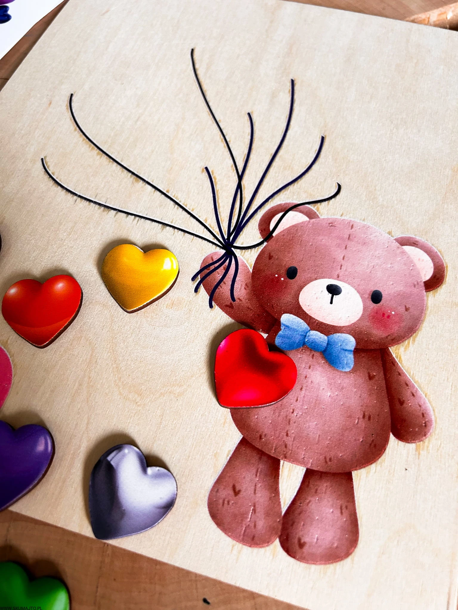 Miś z serduszkami, drewniana układanka montessori, odwzorowywanie