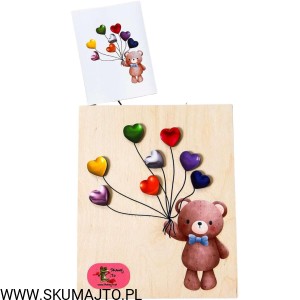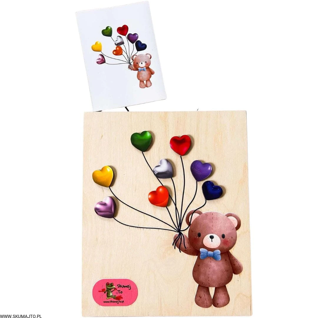 Wyjątkowa, drewniana układanka, która nie tylko bawi, ale także uczy koncentracji, logicznego myślenia i precyzji ruchów. Uroczy miś trzyma w łapkach baloniki w kształcie serduszek, a zadaniem dziecka jest ich odpowiednie dopasowanie według wzoru z dołączonych kart.