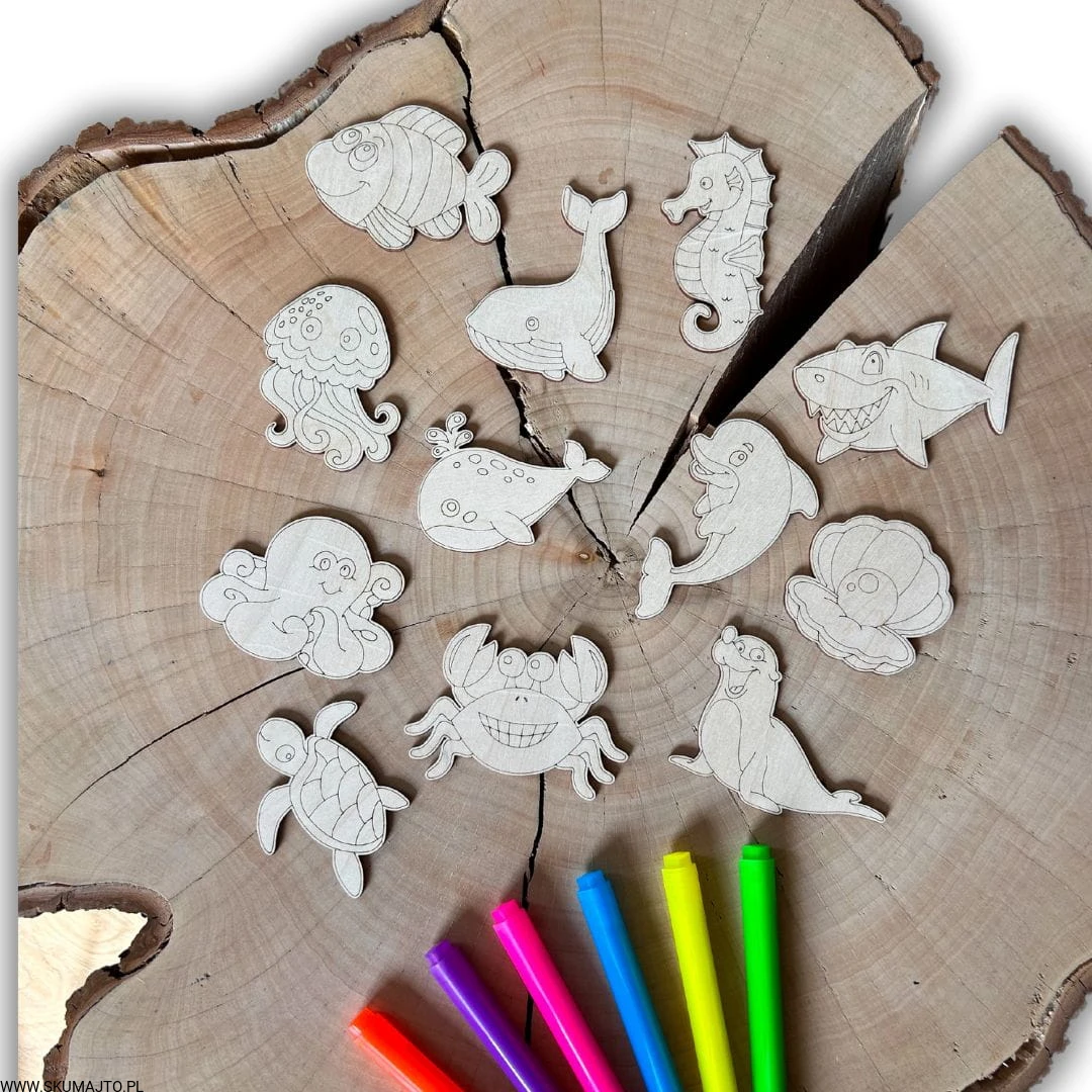 Kreatywna Zabawa: Zestaw zawiera 12 tabliczek ze sklejki o wymiarach około 7x7 cm, na których znajdują się różnorodne morskie zwierzęta, takie jak ośmiornica, krab, delfin, rekin i wiele innych. Zadaniem dziecka jest pokolorowanie tych zwierzątek przy użyciu kredek, flamastrów lub farb, co pozwala na pełną swobodę artystyczną i rozwija kreatywność.
