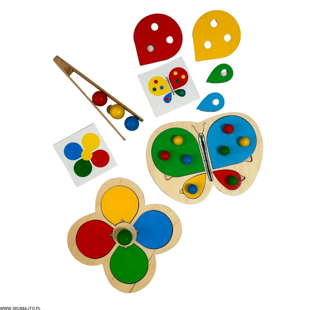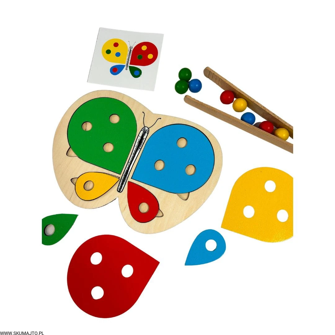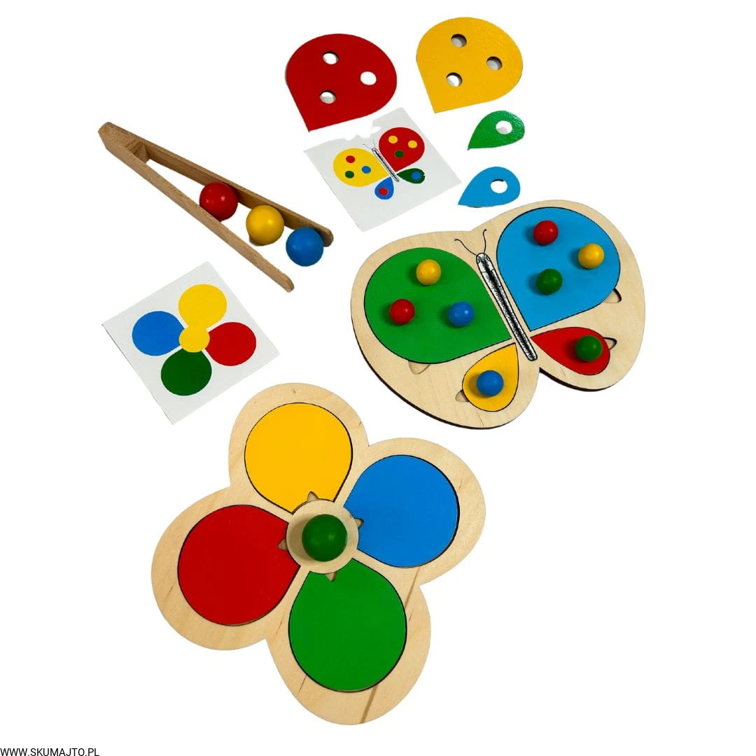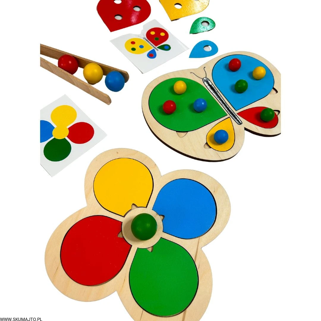 Motylek i kwiatek, układanka drewniana do nauki kolorów, odwzorowywanie, mała motoryka, szczypce, kolorowe kulki