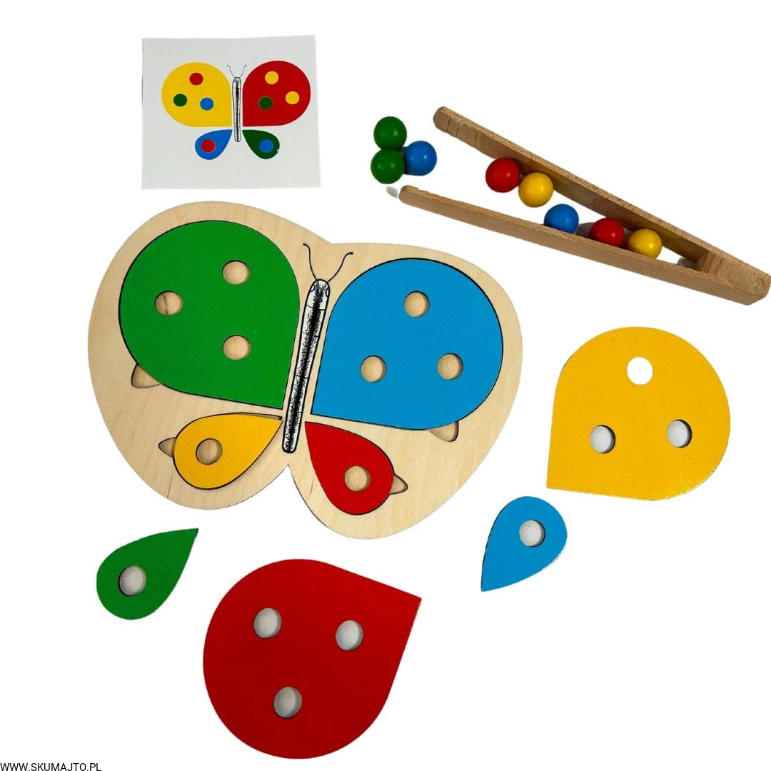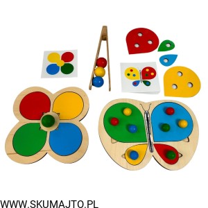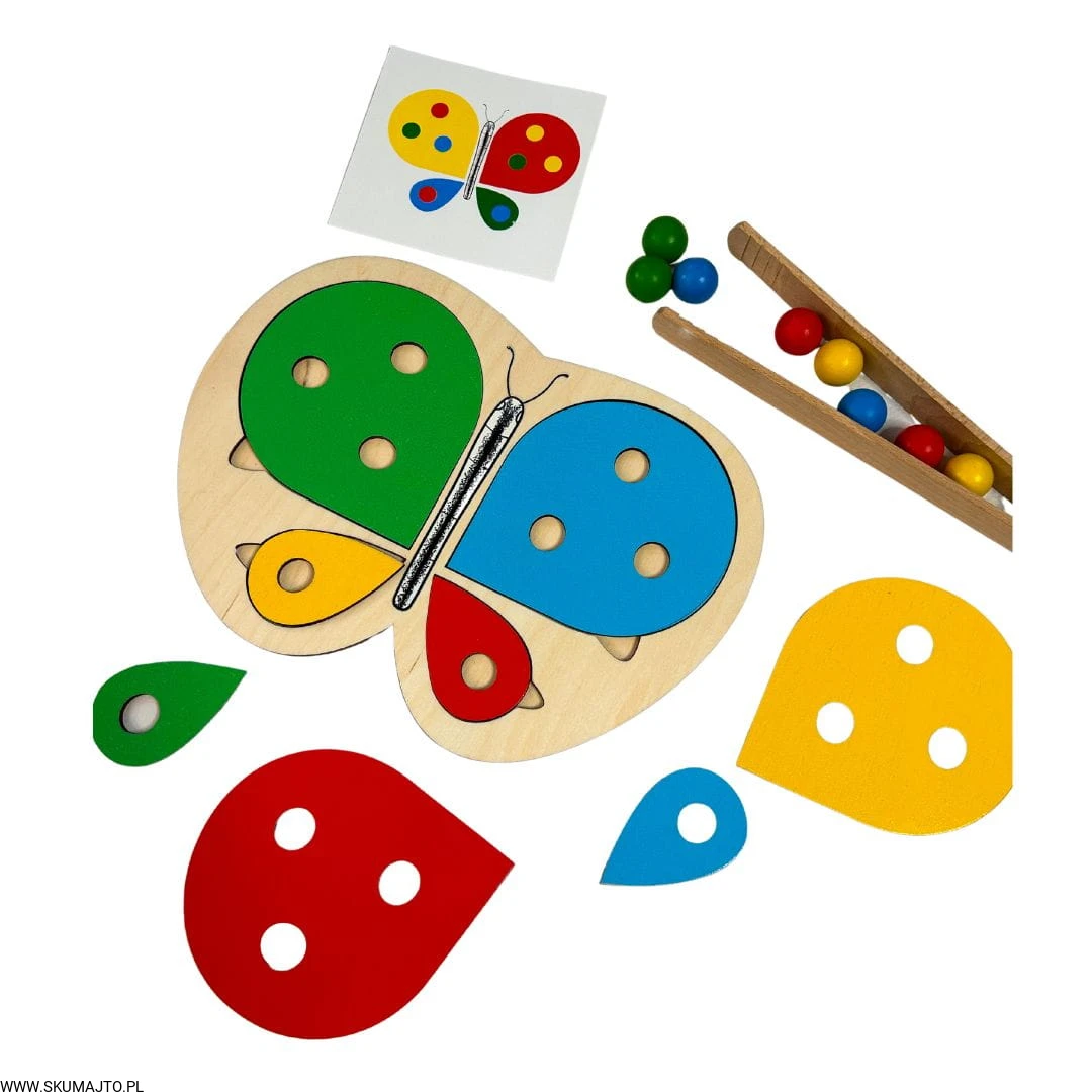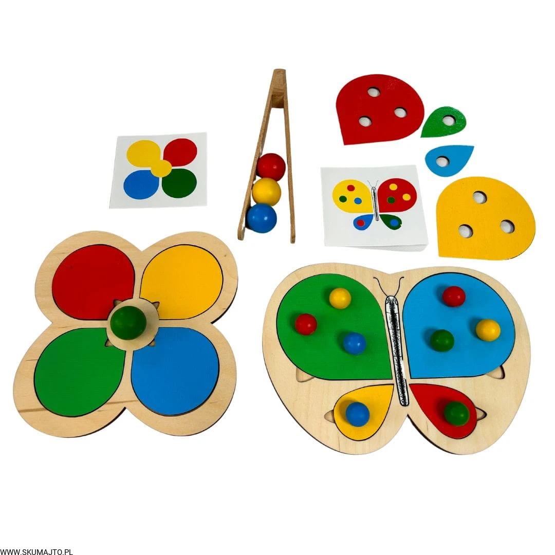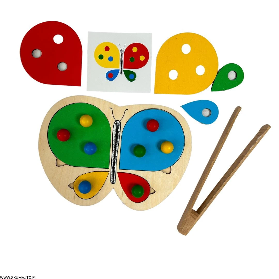 Motylek i kwiatek, układanka drewniana do nauki kolorów, odwzorowywanie, mała motoryka, szczypce, kolorowe kulki