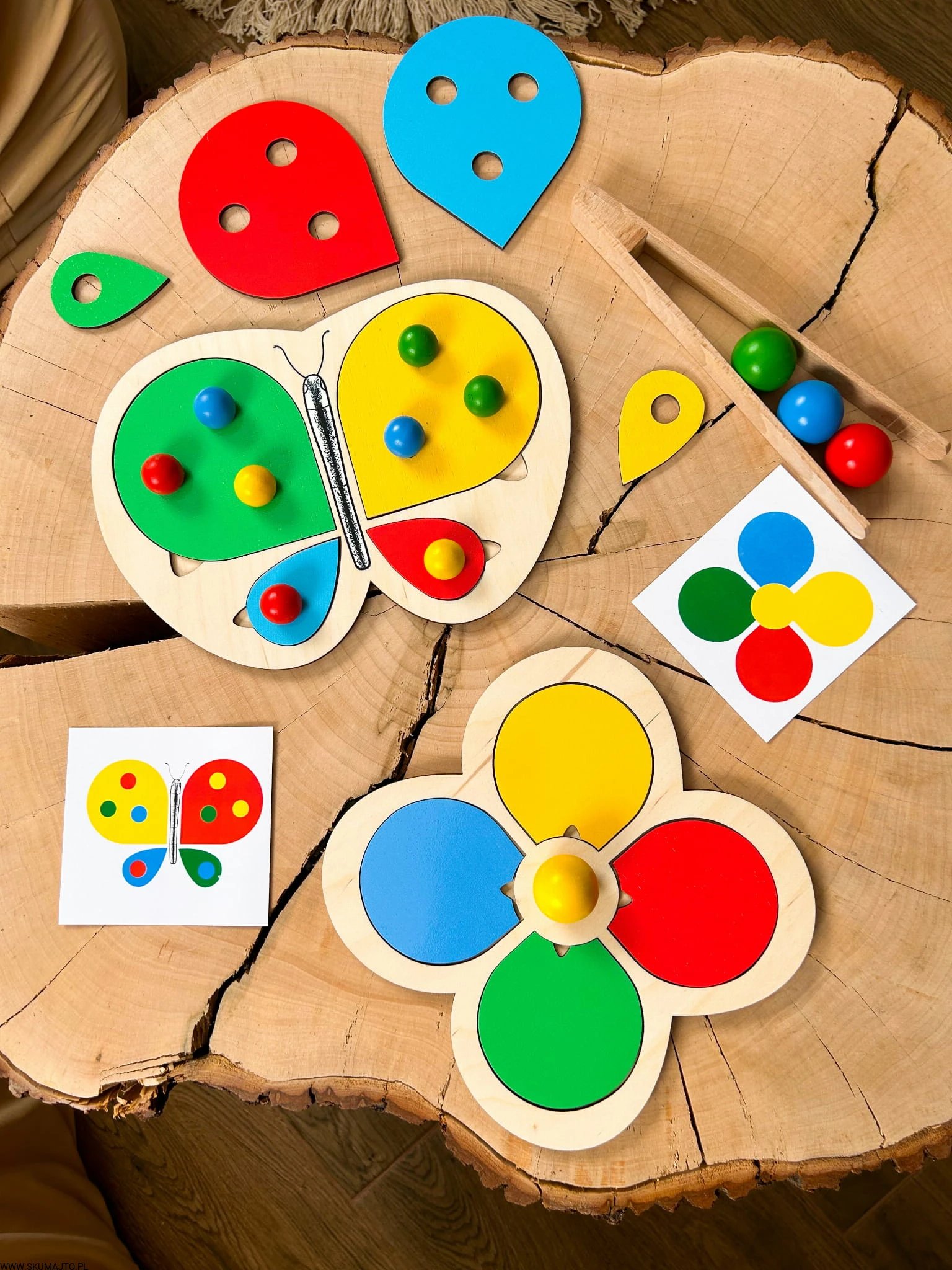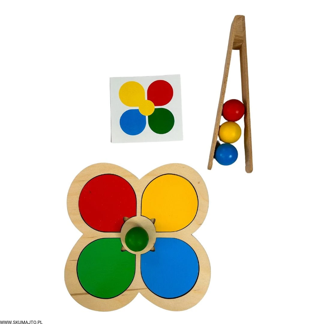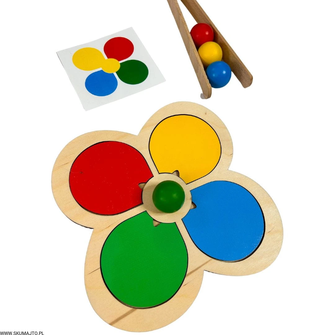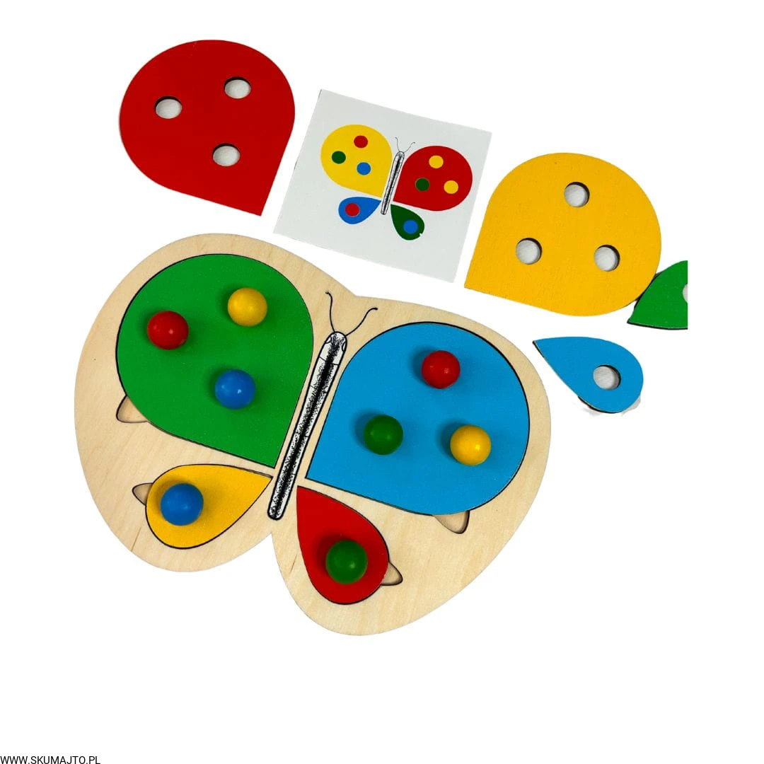 Motylek i kwiatek, układanka drewniana do nauki kolorów, odwzorowywanie, mała motoryka, szczypce, kolorowe kulki