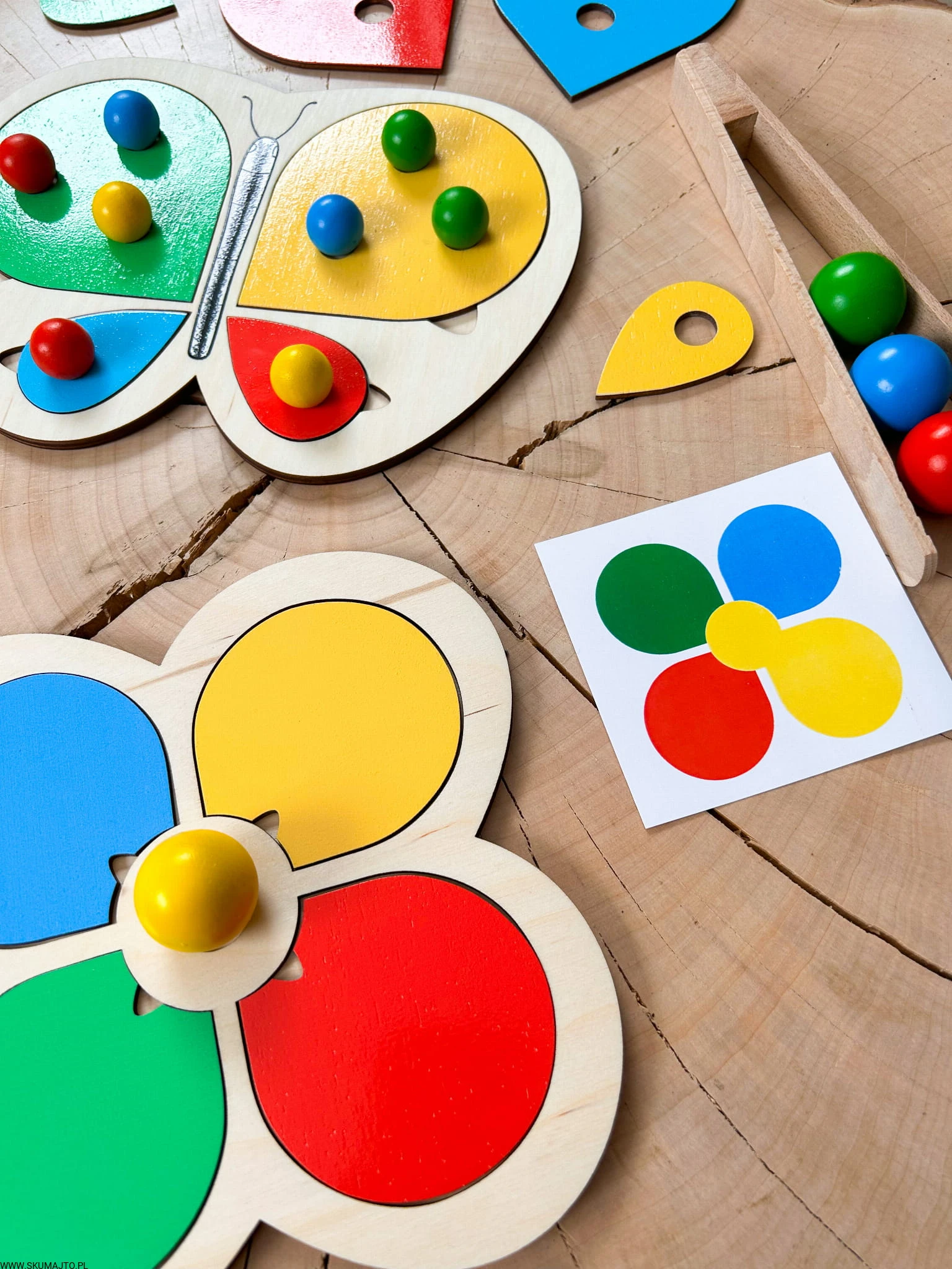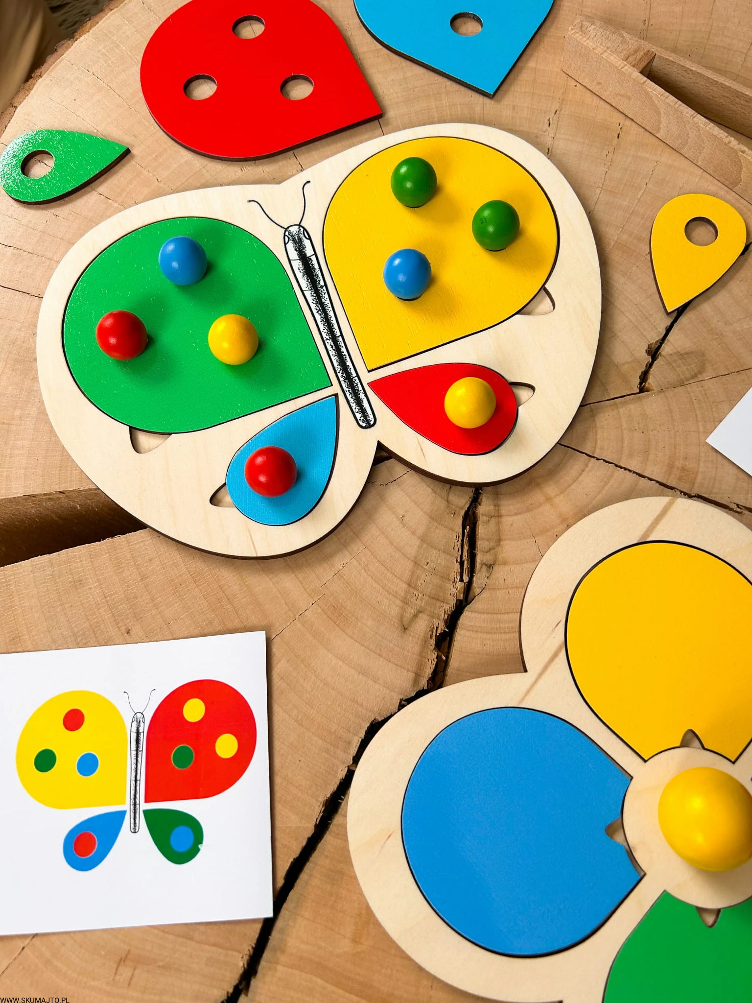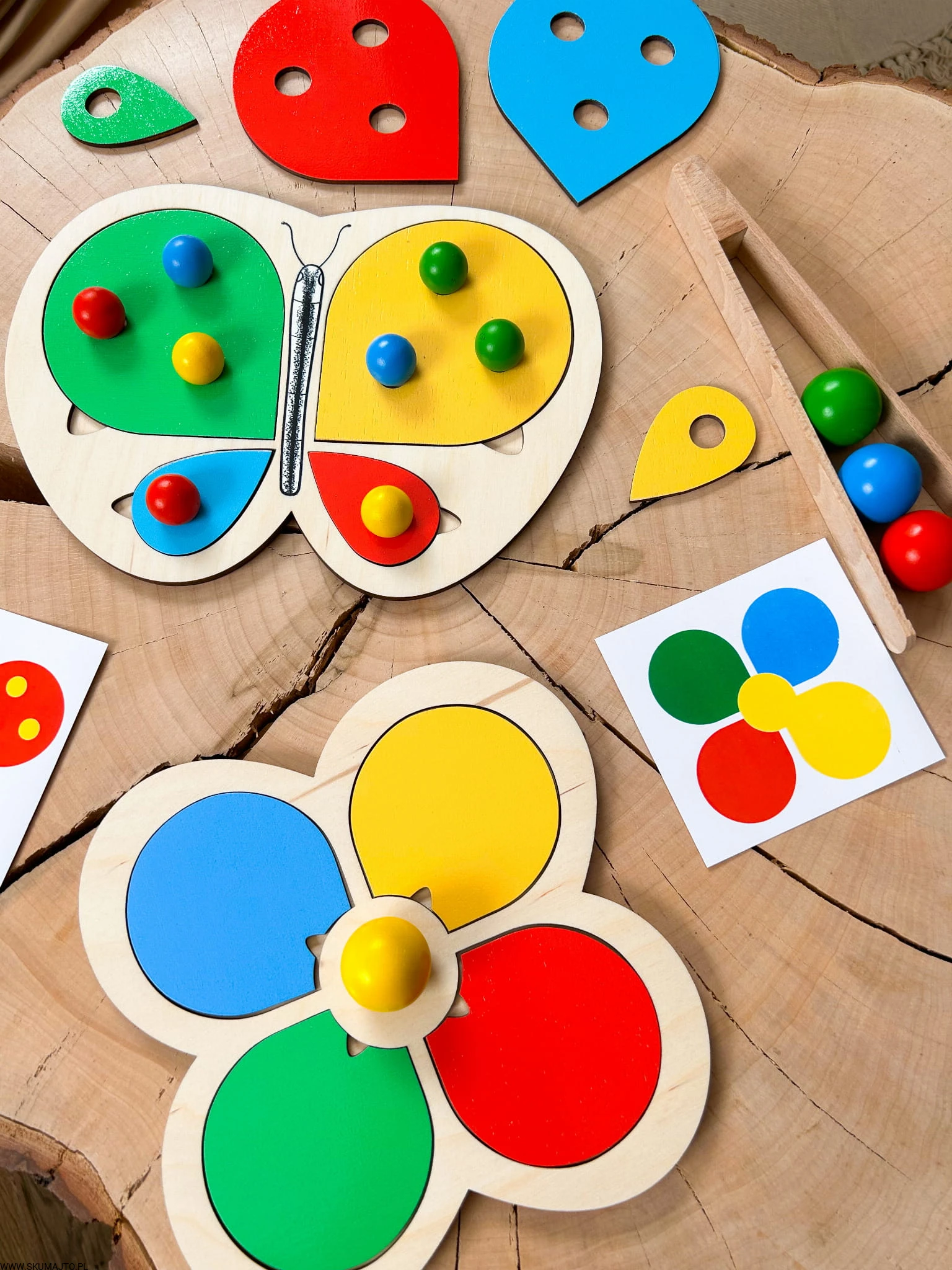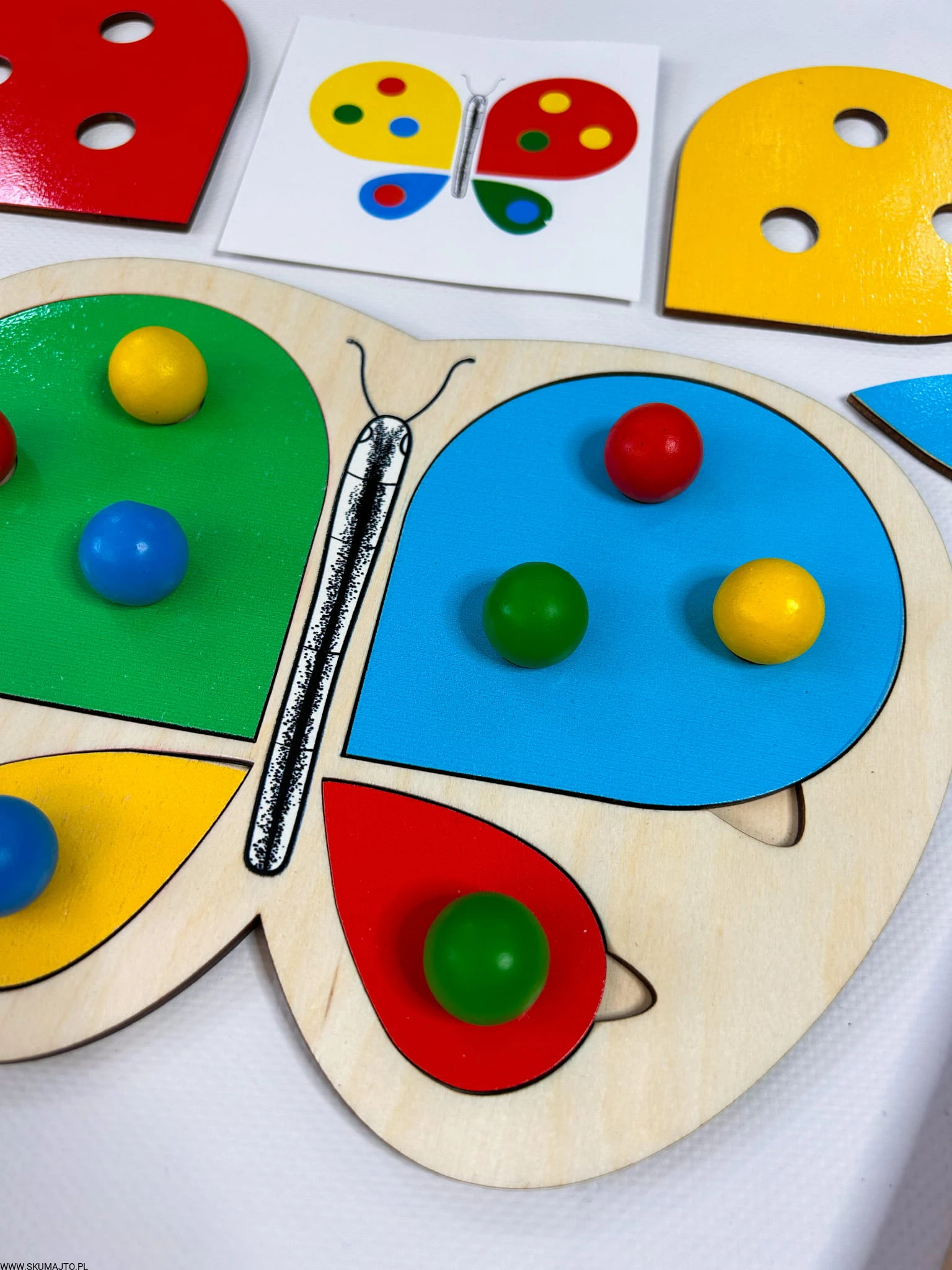 Motylek i kwiatek, układanka drewniana do nauki kolorów, odwzorowywanie, mała motoryka, szczypce, kolorowe kulki