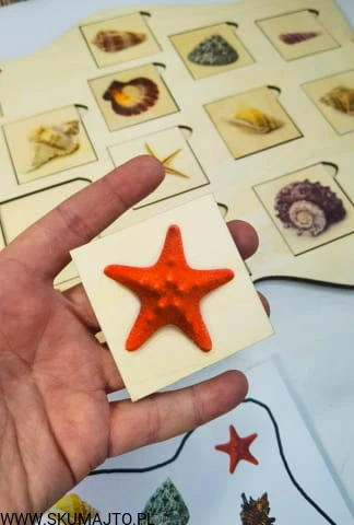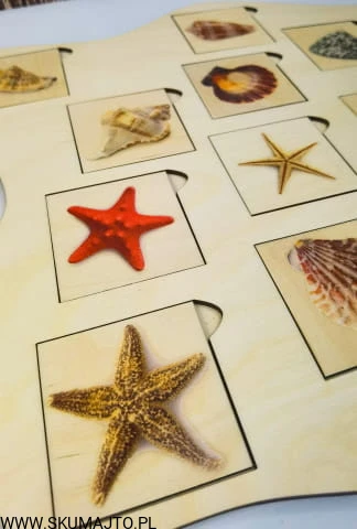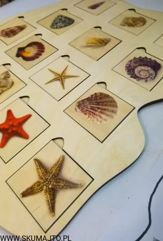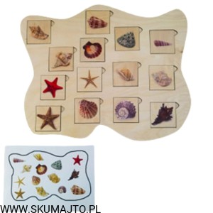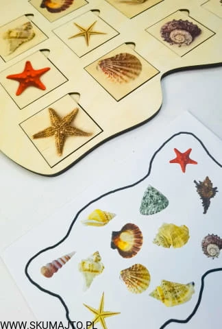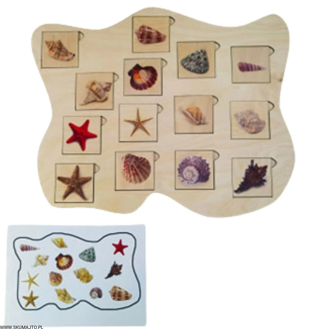 Muszelki, drewniana układanka, odwzorowywanie, rodzaje muszli