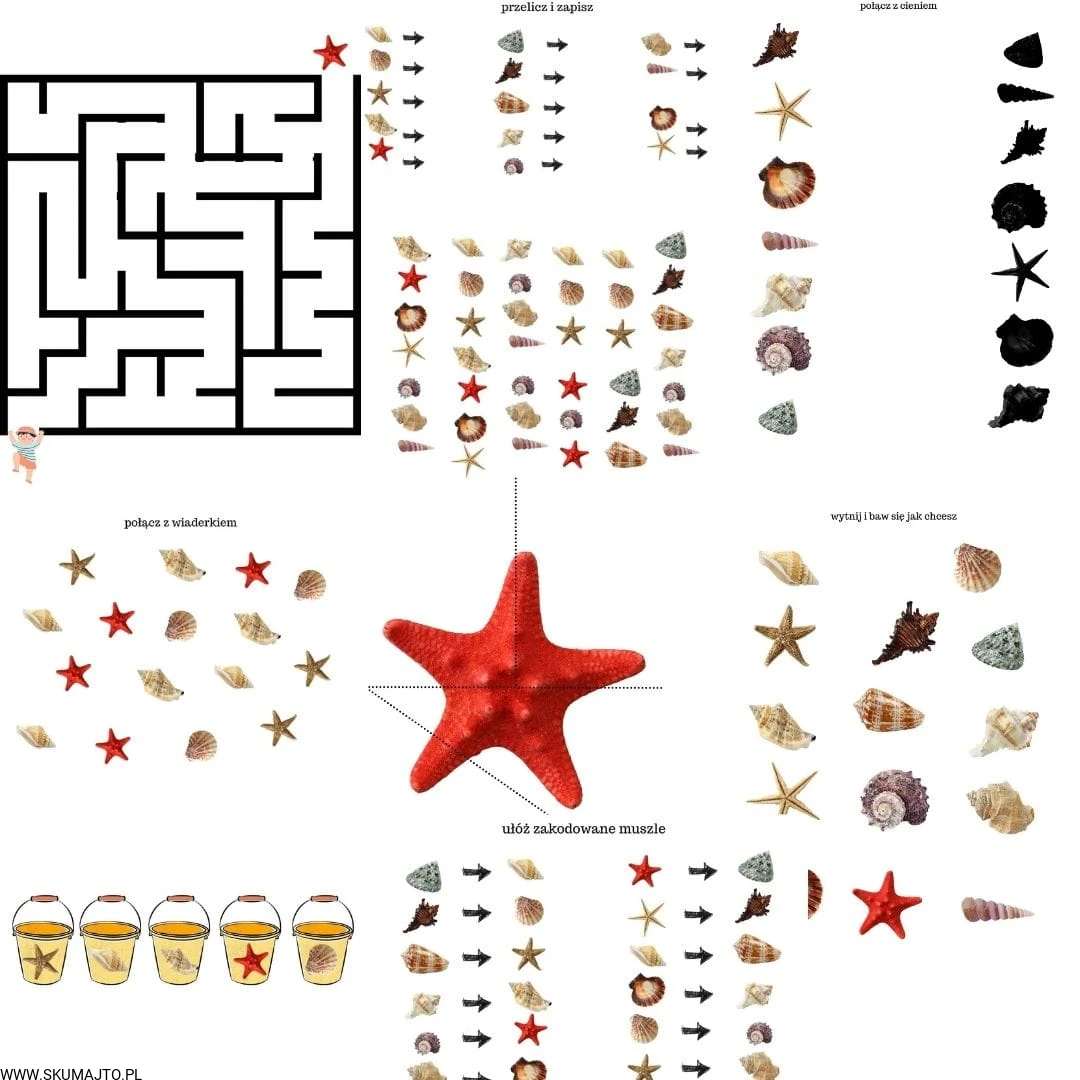 - 6 Wydrukowanych Kart: Do odwzorowywania układu muszelek na plaży.