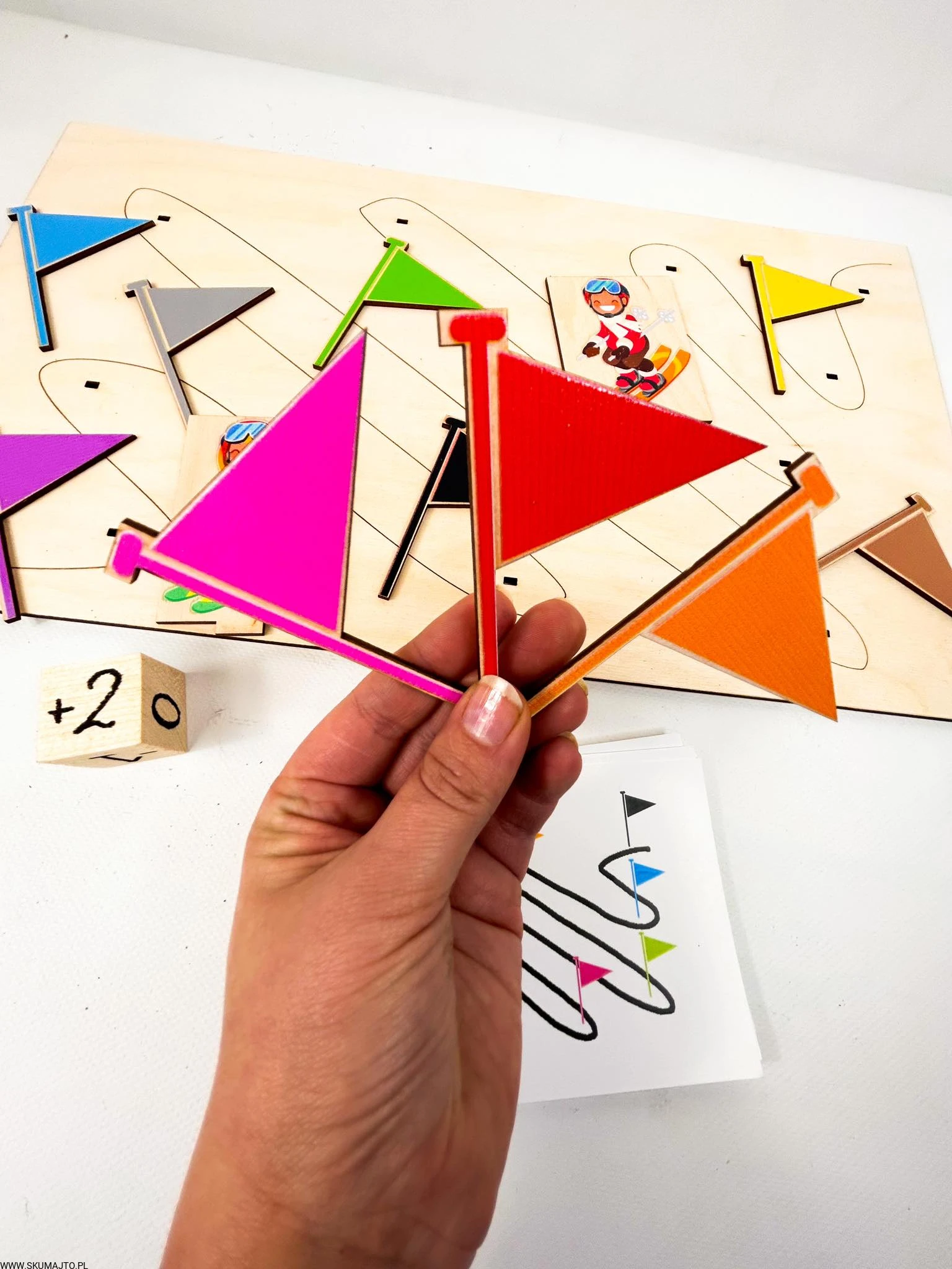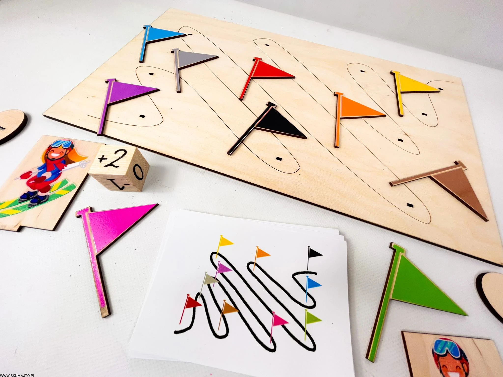 - Edukacja przez Zabawę: Dziecko rozwija małą motorykę, koordynację ręka-oko oraz logiczne myślenie, odwzorowując ułożenie kolorowych chorągiewek według dołączonych kart.