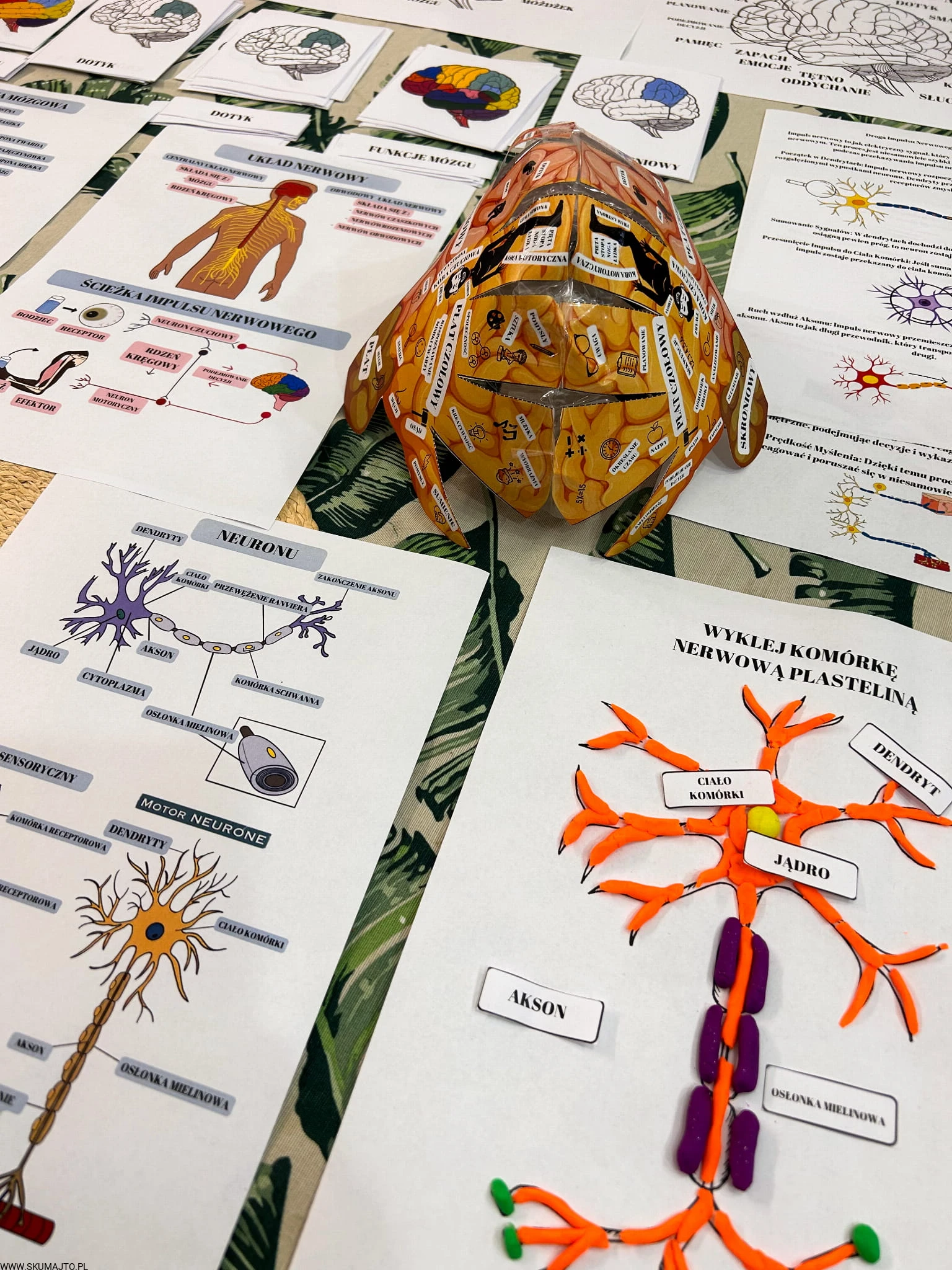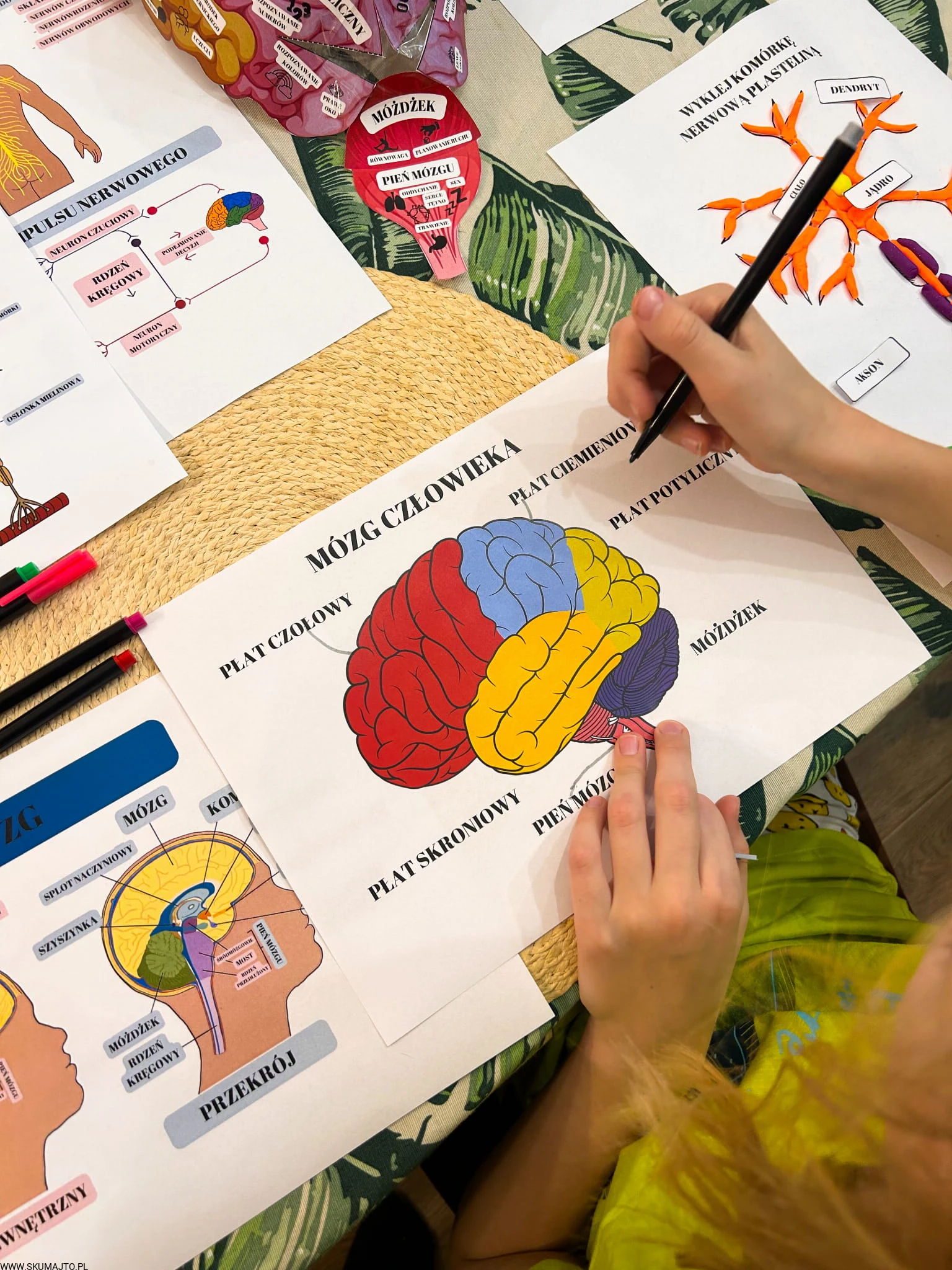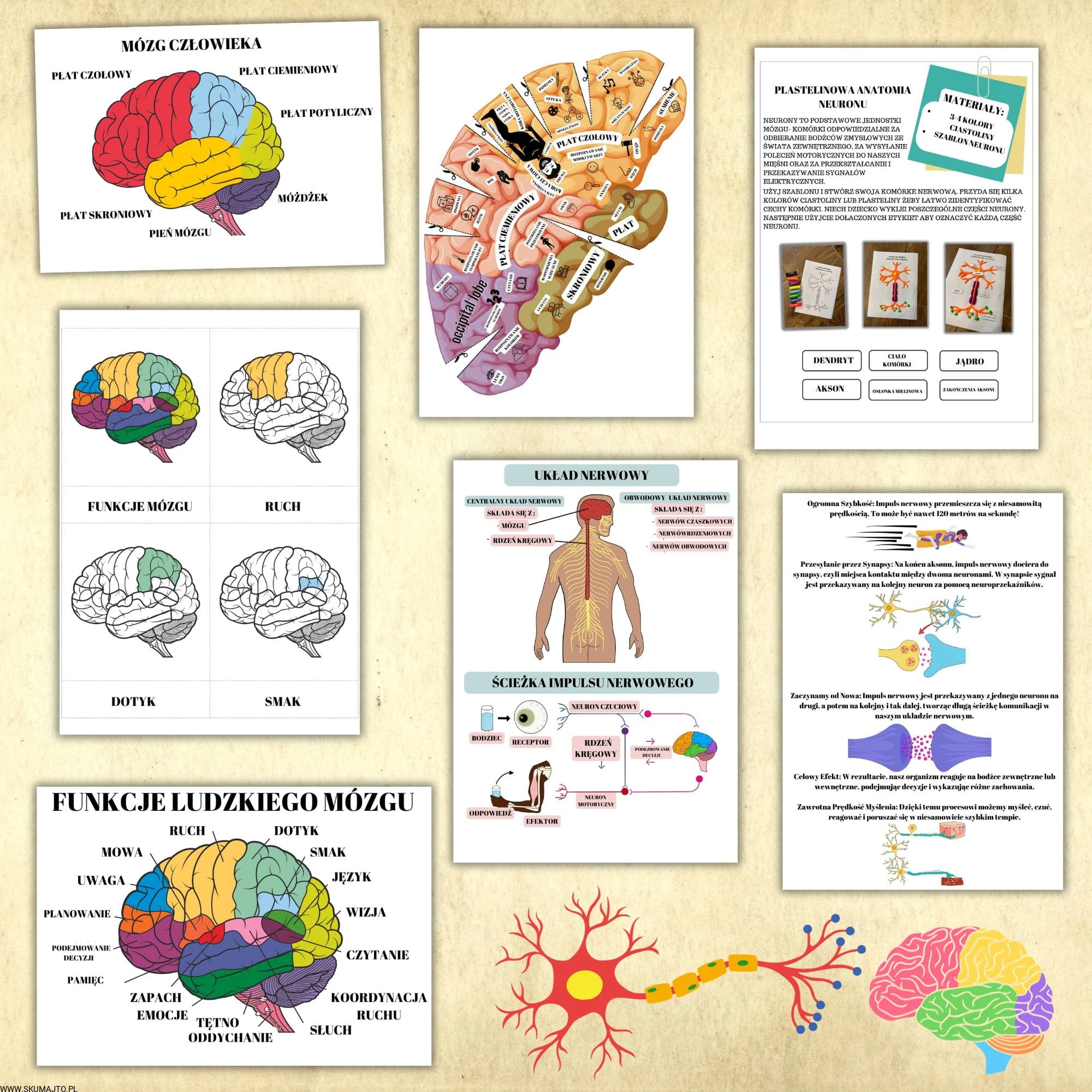 Ale to nie wszystko! W zestawie znajdują się także karty w wersji PDF, które zawierają aż 26 fascynujących ciekawostek o układzie nerwowym, budowie mózgu i jego funkcjach. Karty trójdzielne pozwalają na zgłębienie wiedzy na temat budowy i funkcji mózgu, a trójwymiarowy model mózgu do własnego sklejenia stanowi doskonałą okazję do nauki, praktycznej zabawy i eksploracji, umożliwiając dzieciom zrozumienie, gdzie znajdują się różne ośrodki mózgowe.
