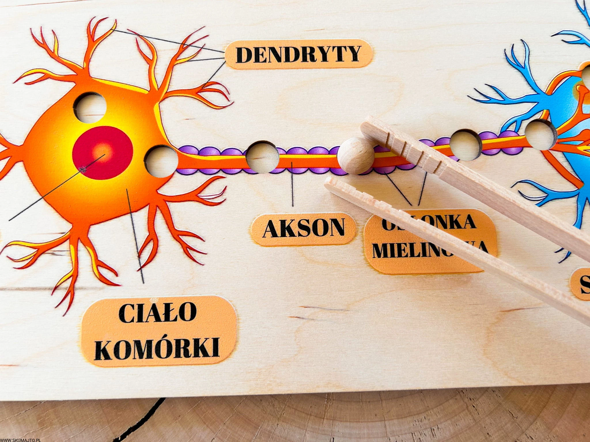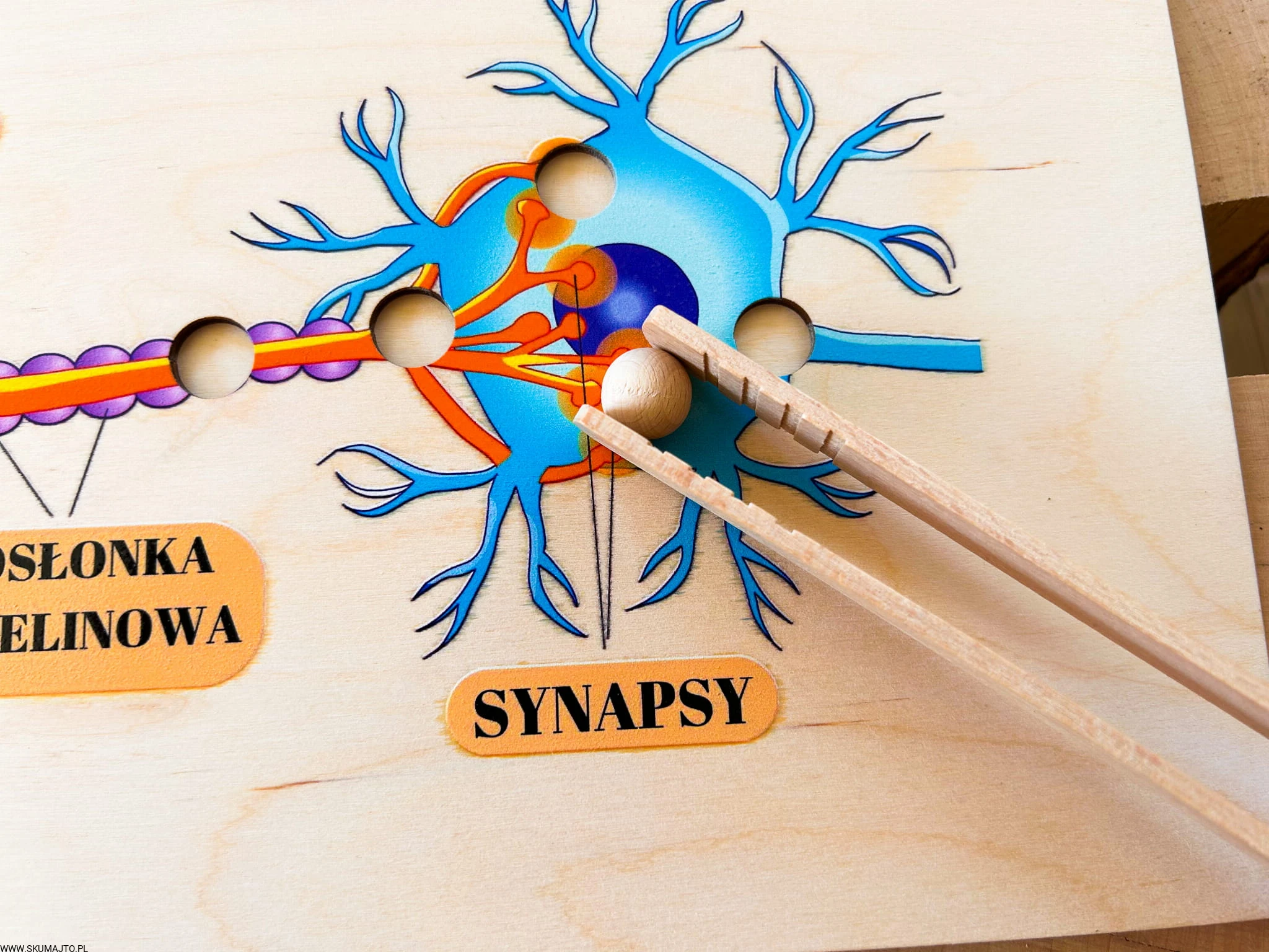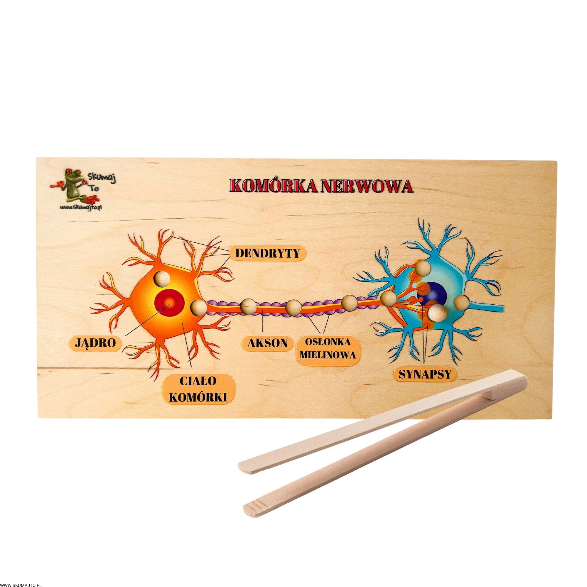 Nasza układanka to klucz do zrozumienia budowy neuronów i drogi impulsu nerwowego w sposób przystępny i fascynujący. Dzieci otrzymują specjalne szczypce i kulki, które imitują sygnały nerwowe. Przesuwając kulkę między komórkami, dzieci mogą śledzić drogę impulsu nerwowego, ucząc się, jak informacje przekazywane są między komórkami nerwowymi.