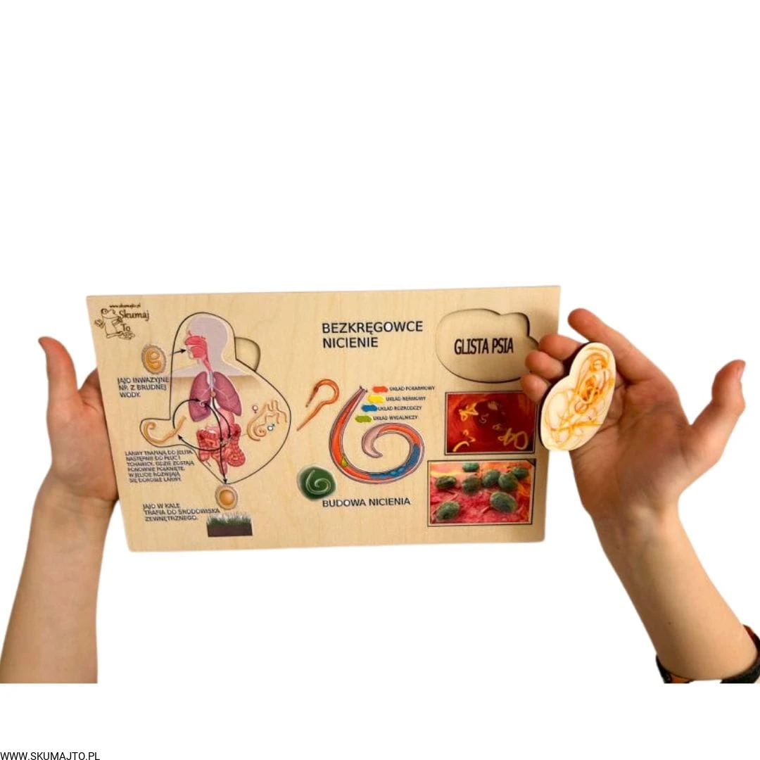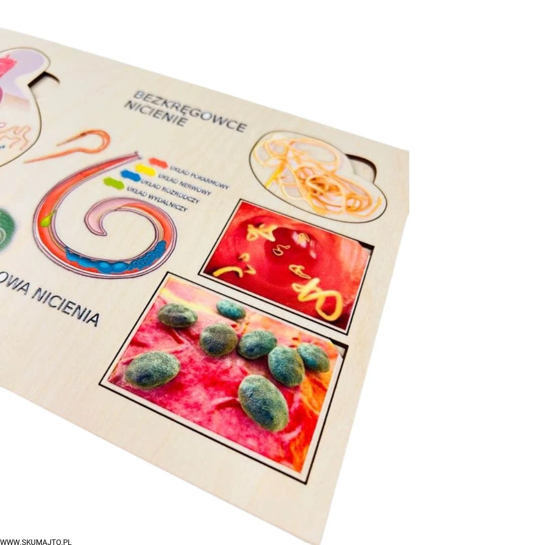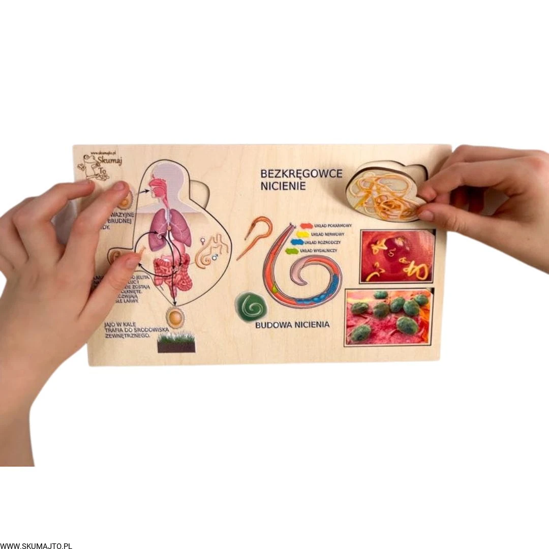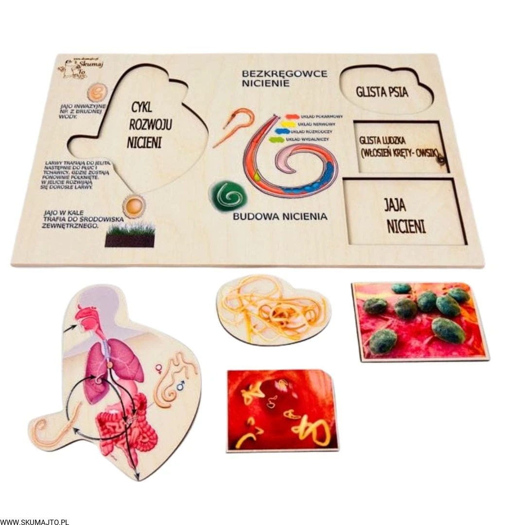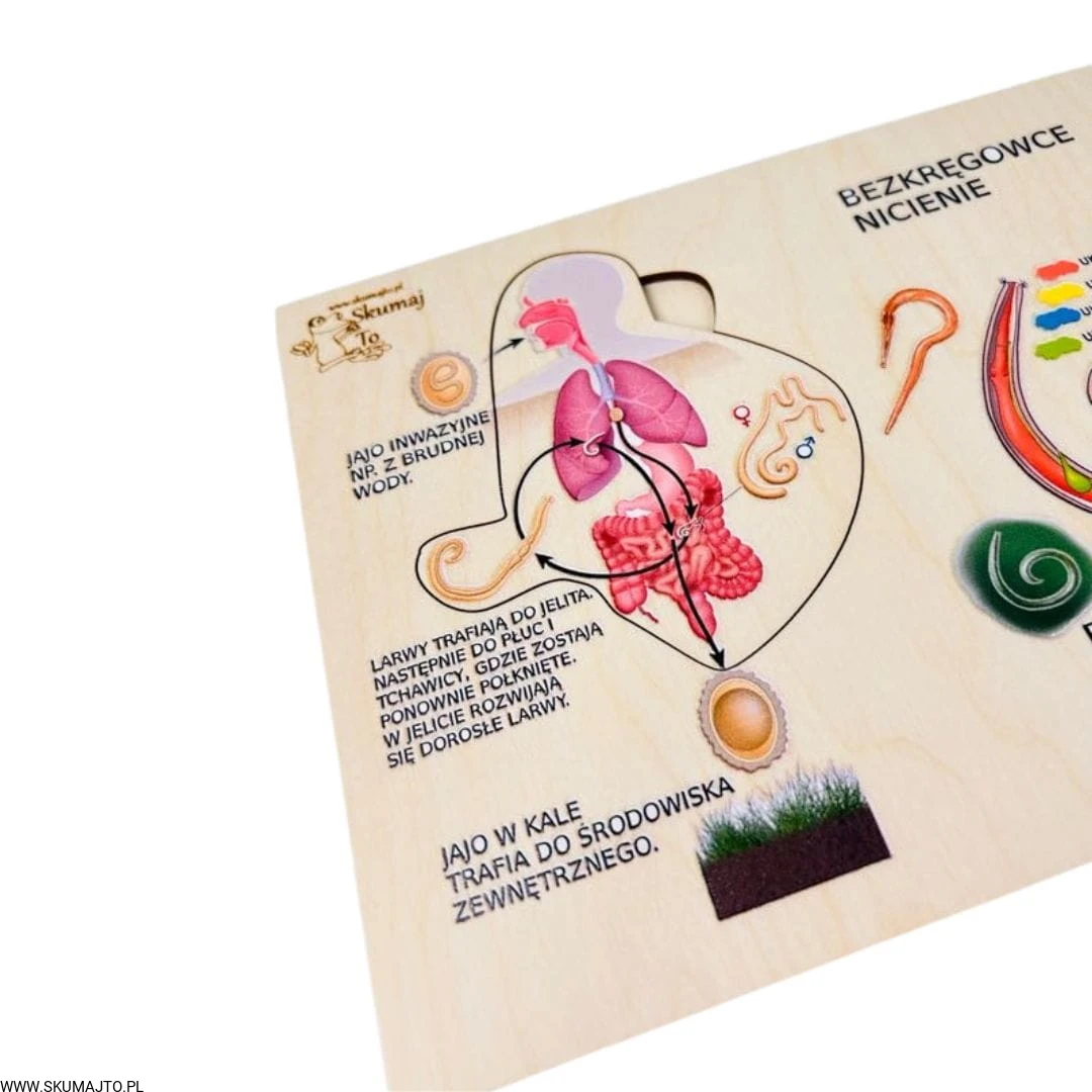 Poznaj fascynujący świat nicieni dzięki naszej edukacyjnej układance! Ta unikalna pomoc dydaktyczna została stworzona, aby w przystępny sposób przybliżyć dzieciom cykl rozwojowy glisty ludzkiej oraz różnorodność nicieni.