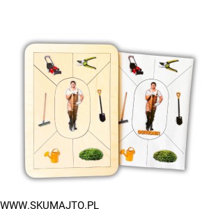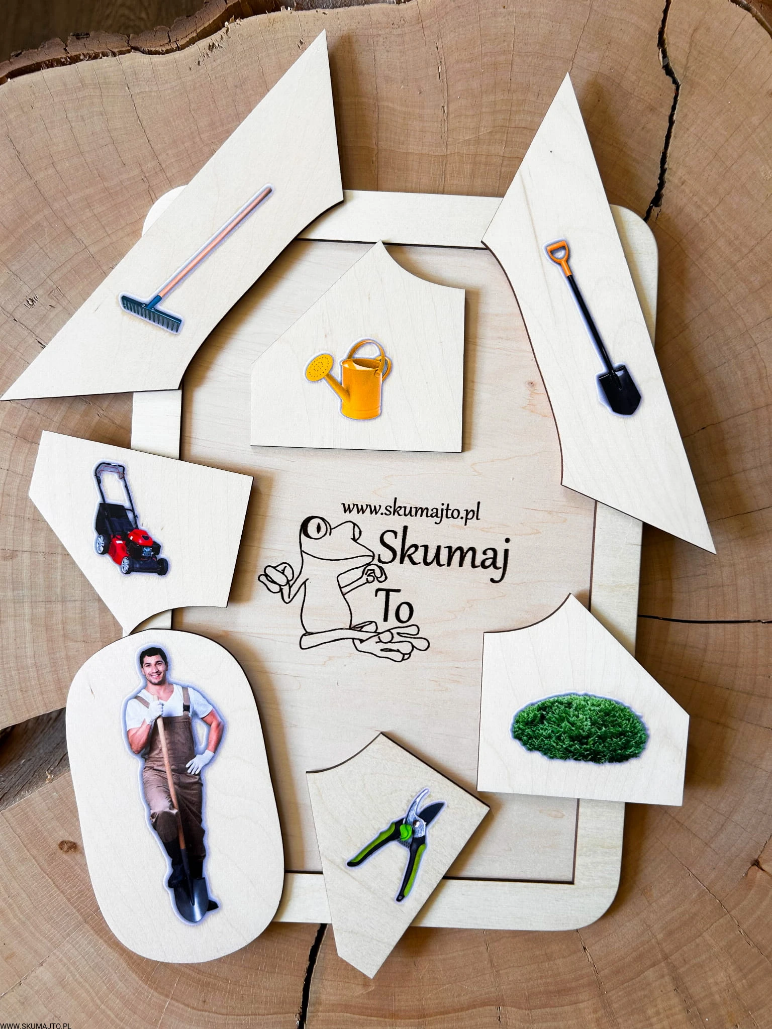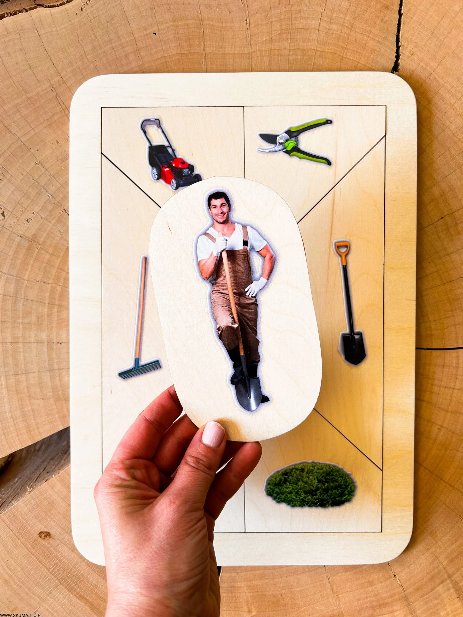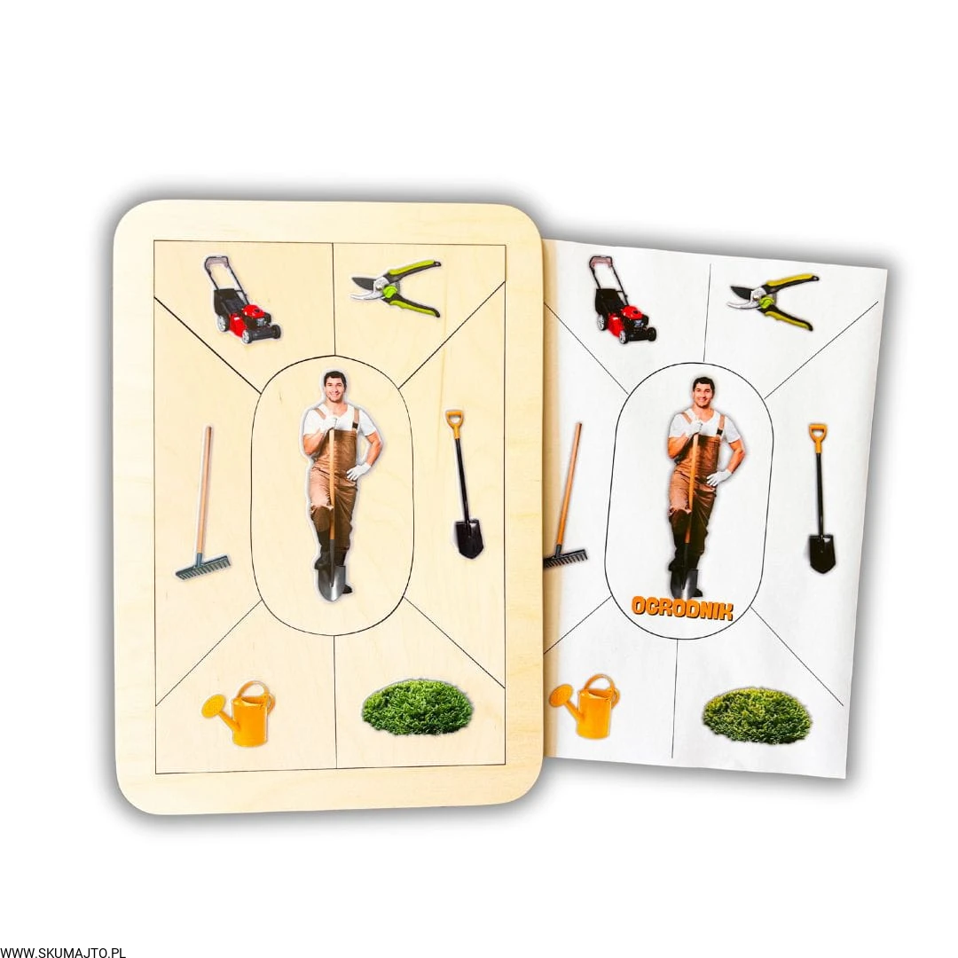 W zestawie znajduje się także edukacyjna ulotka z podpisem „ogrodnik” – z opisem zawodu i ilustracjami wszystkich elementów, które można znaleźć w układance.