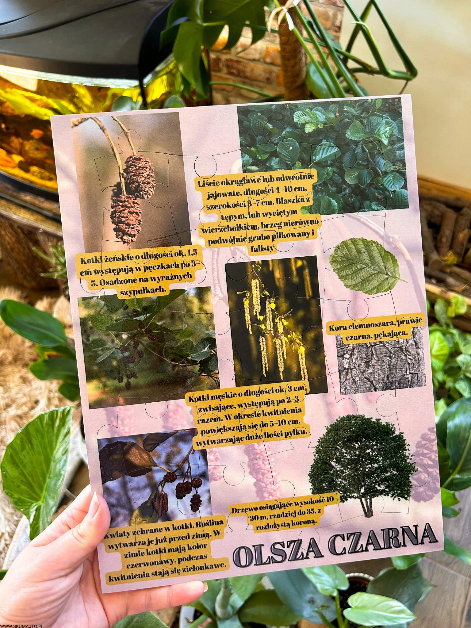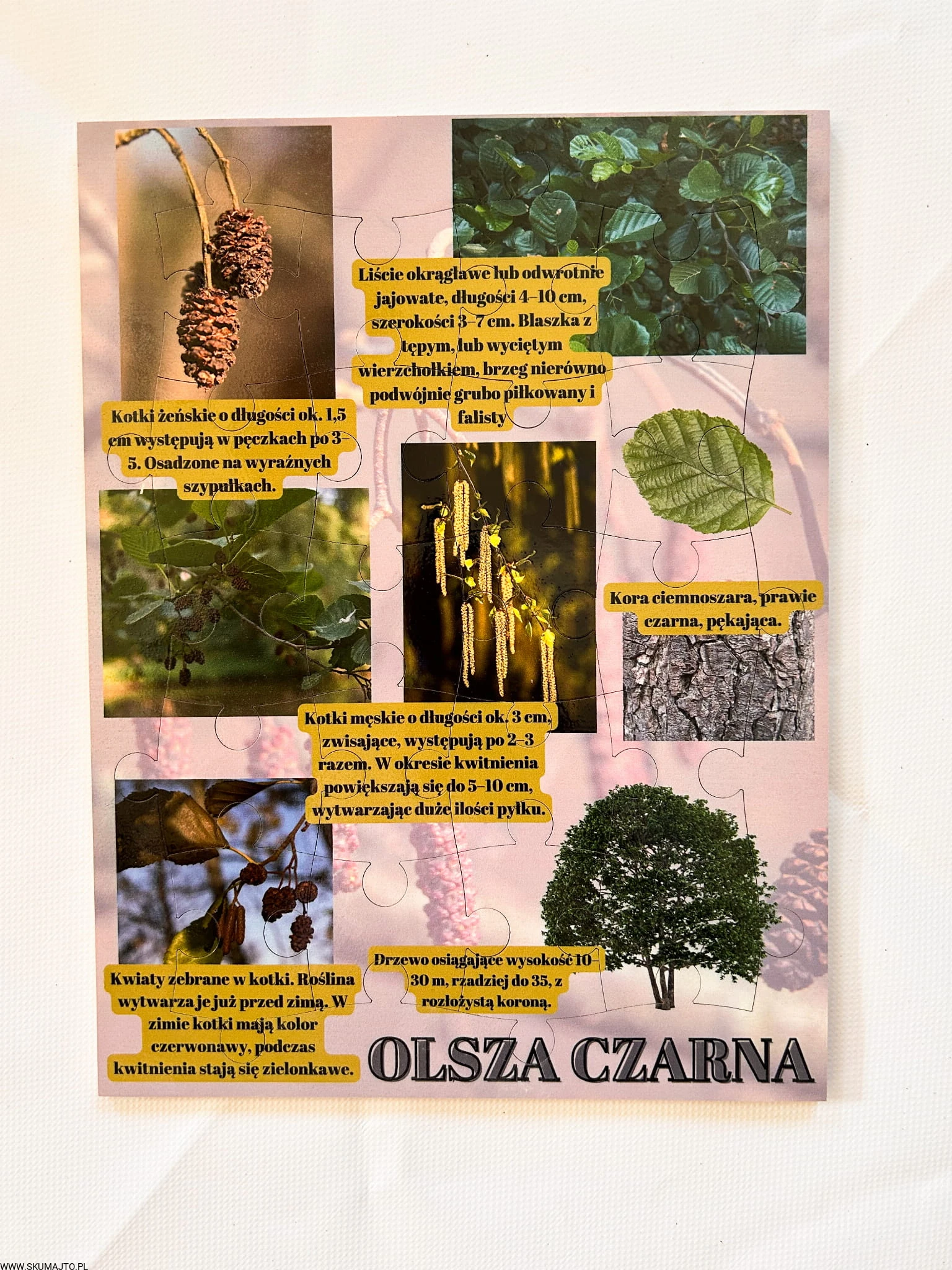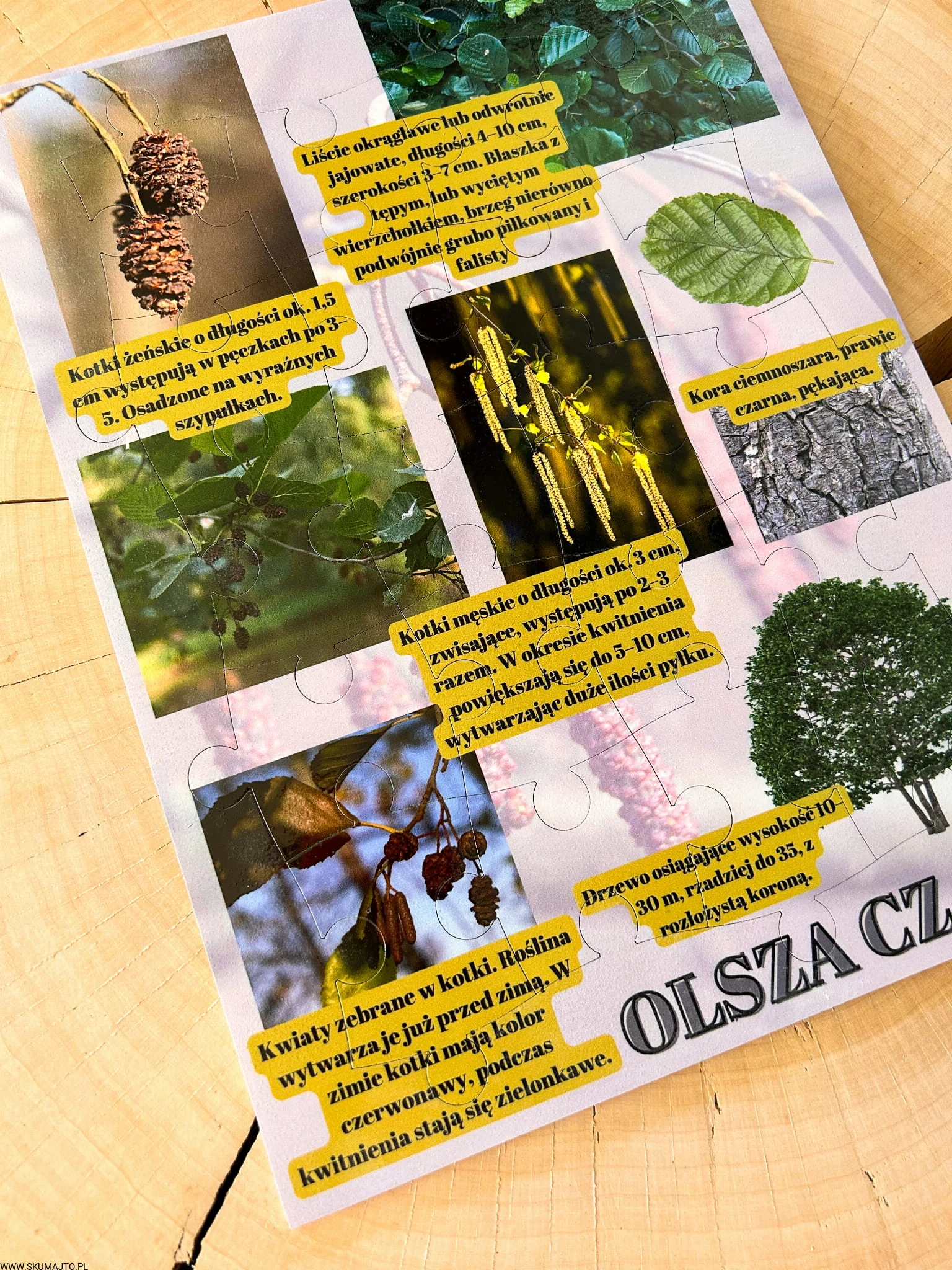 Zabawki edukacyjne, nauka przez zabawę: Nasza układanka to nie tylko puzzlowa rozrywka, to także nieoceniona lekcja o olszy czarnej. Dzieci poznają różnorodność tego drzewa i dowiadują się fascynujących faktów, rozwijając jednocześnie swoje umiejętności.