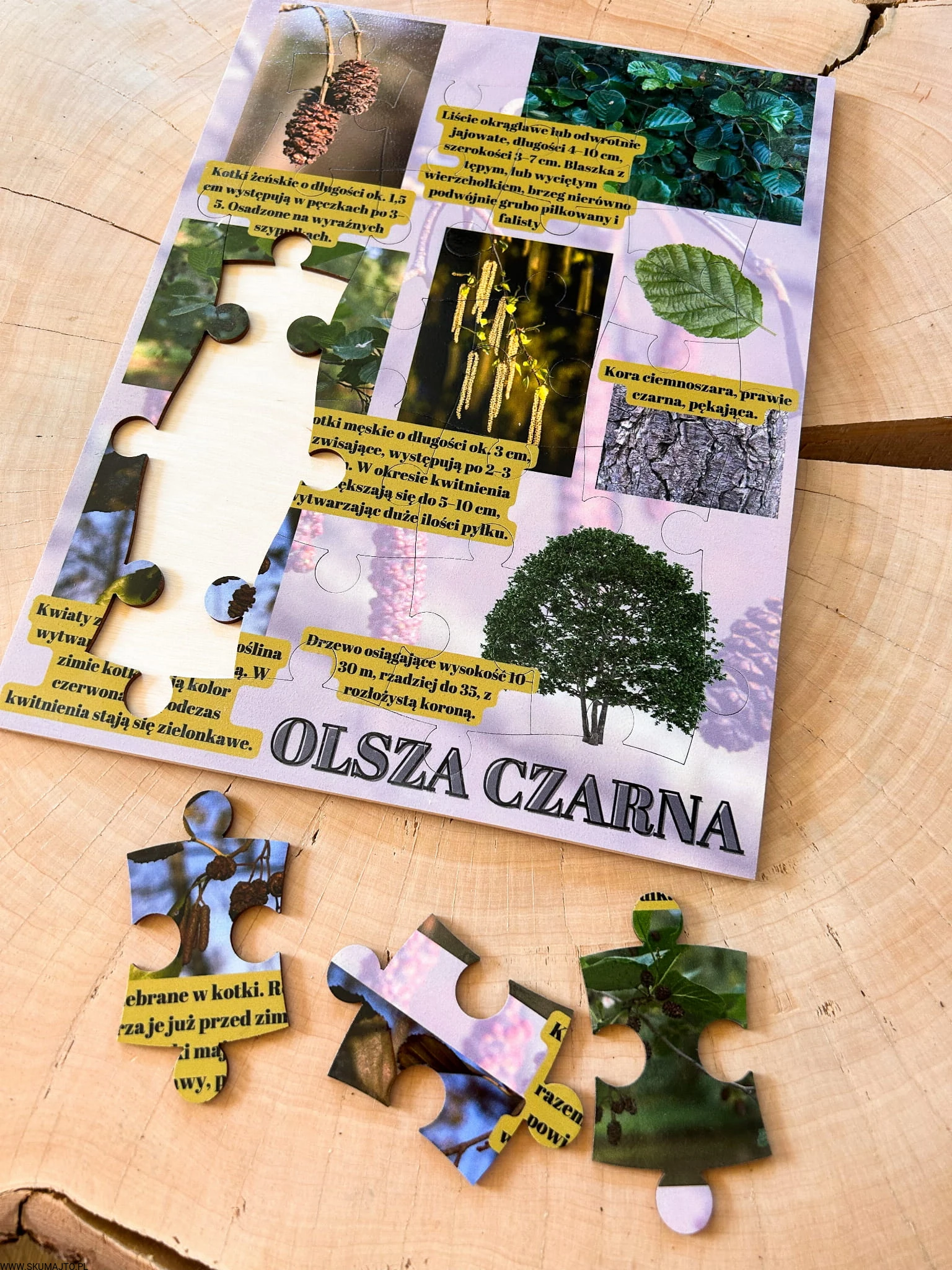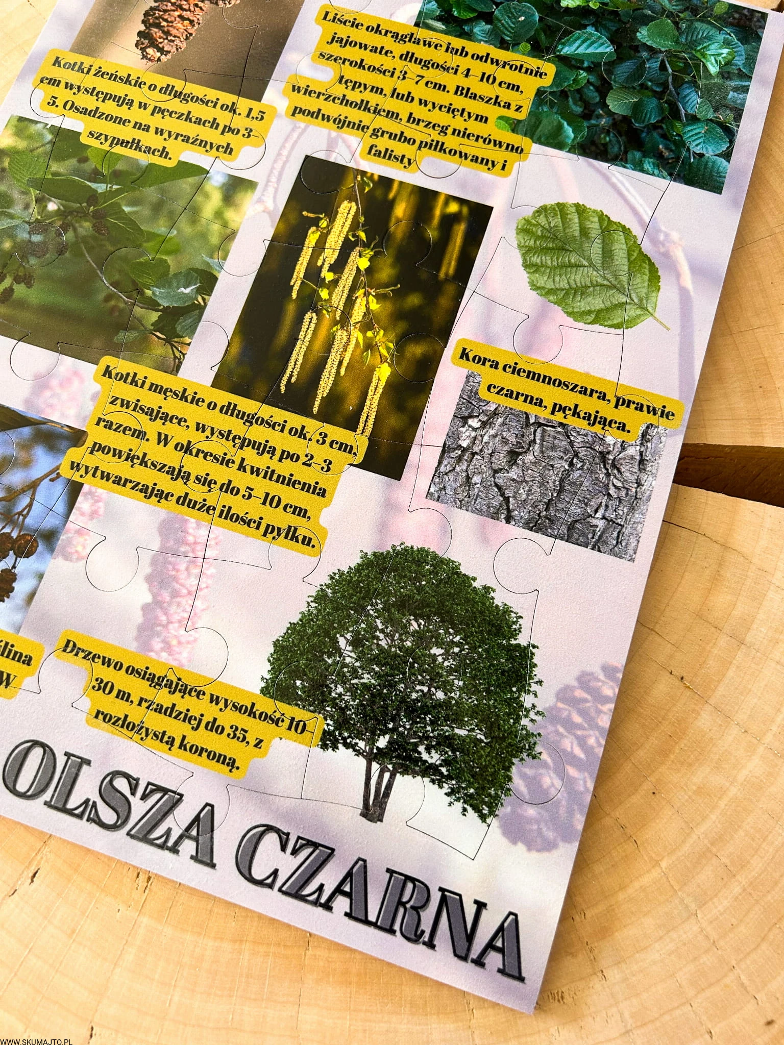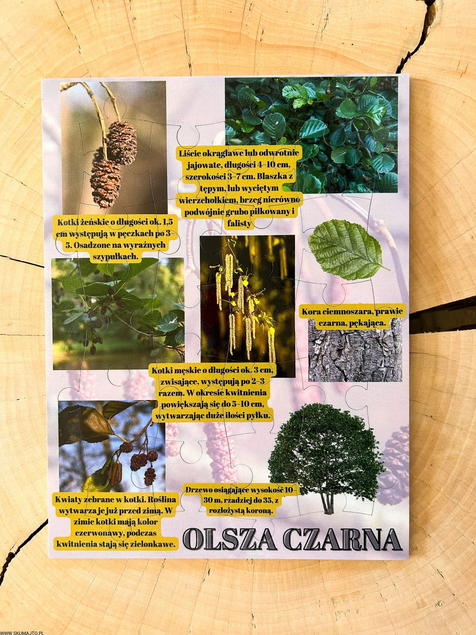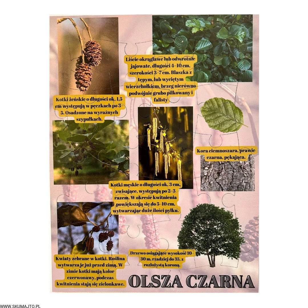 Zabawki edukacyjne, nauka przez zabawę: Nasza układanka to nie tylko puzzlowa rozrywka, to także nieoceniona lekcja o olszy czarnej. Dzieci poznają różnorodność tego drzewa i dowiadują się fascynujących faktów, rozwijając jednocześnie swoje umiejętności.