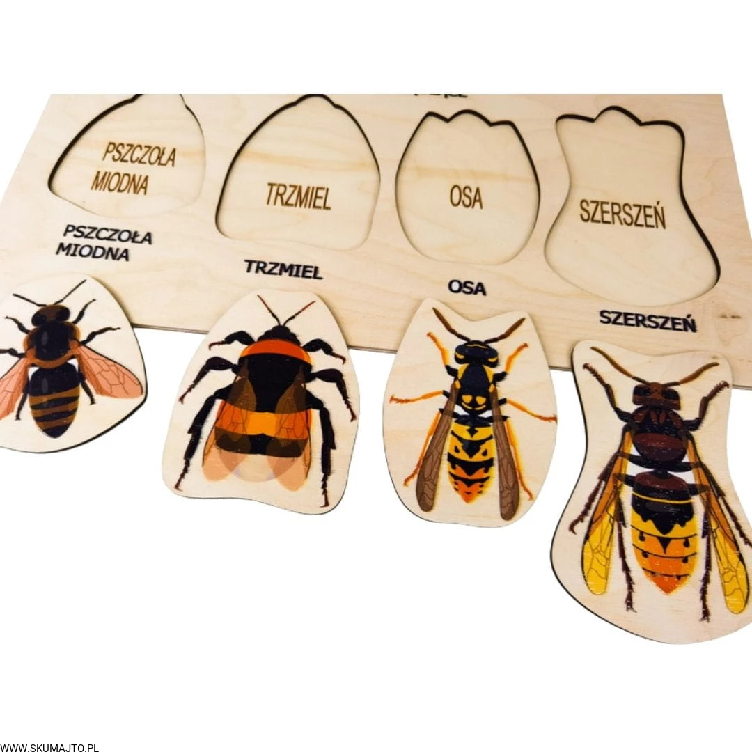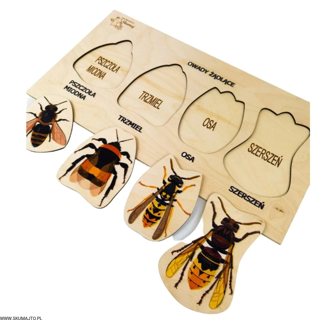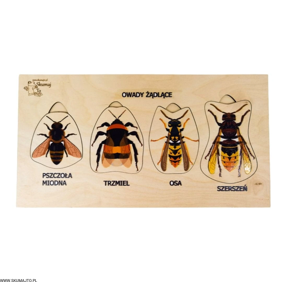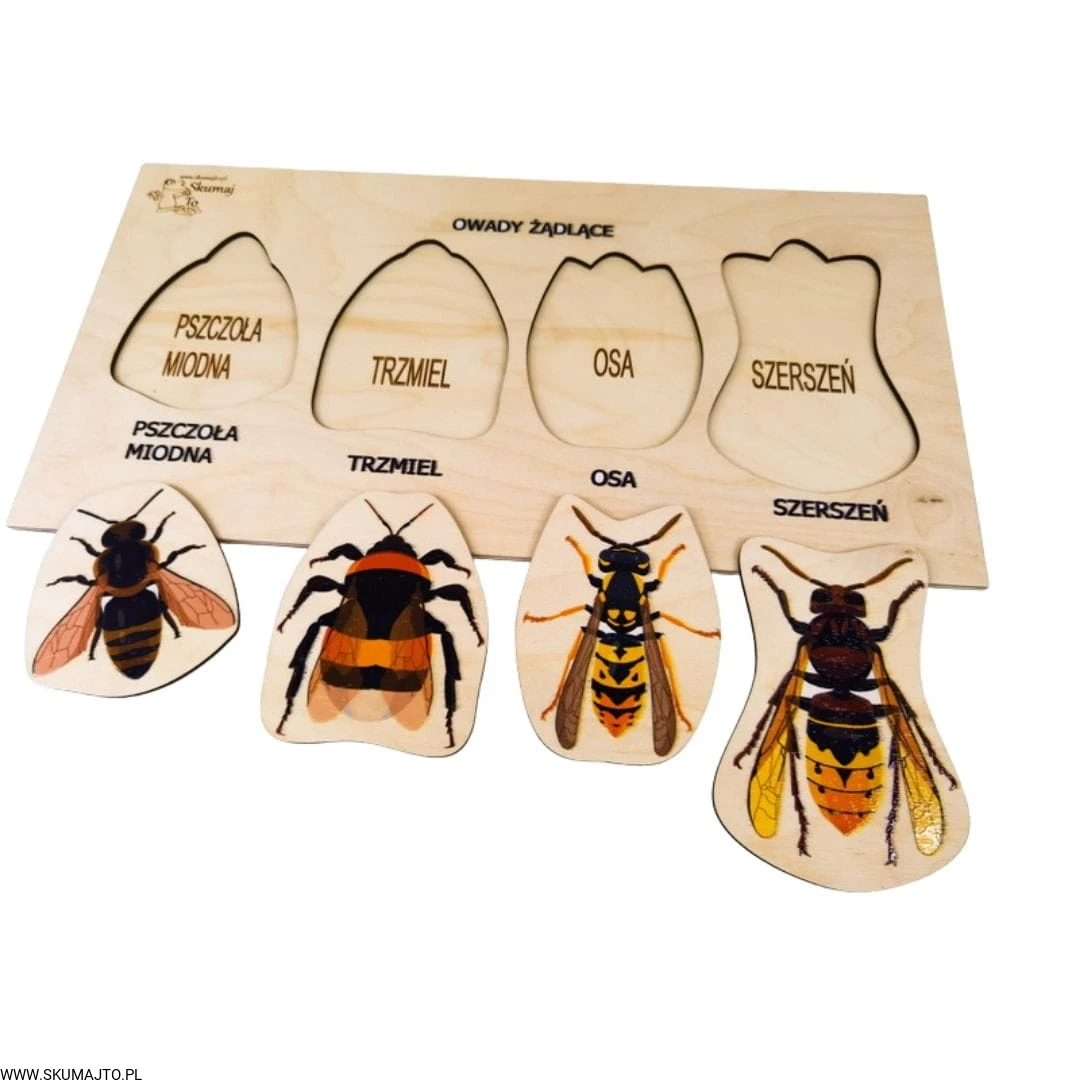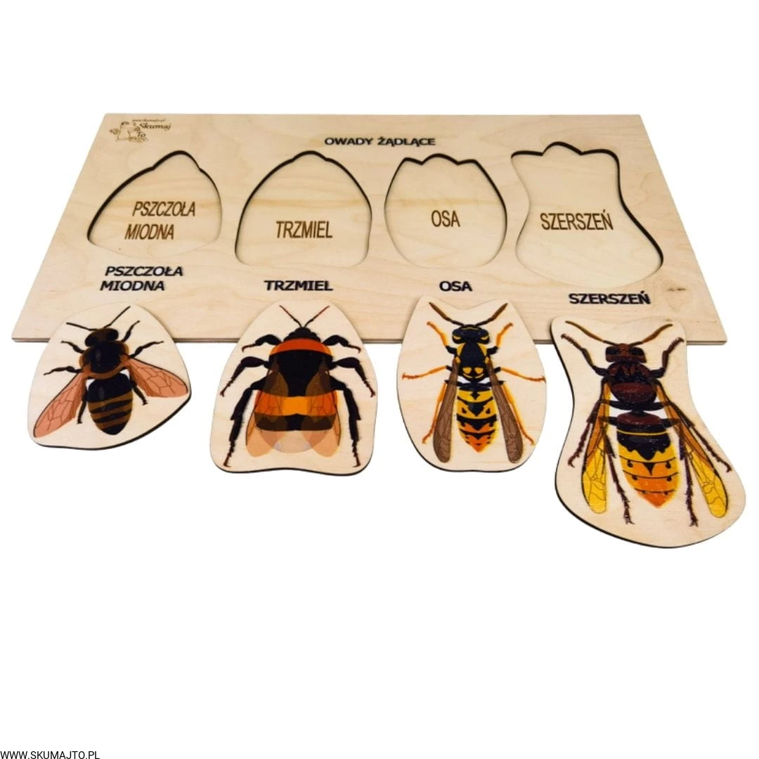 Owady żądlące, drewniana układanka, rodzaje owadów, wyciągane elementy z podpisami