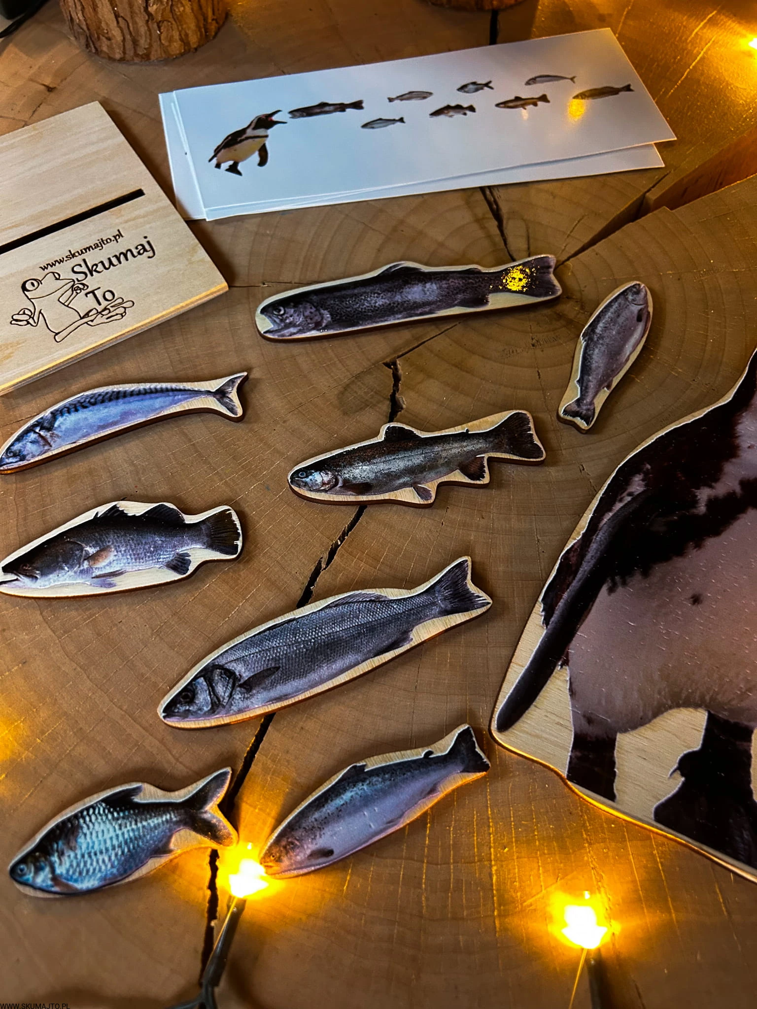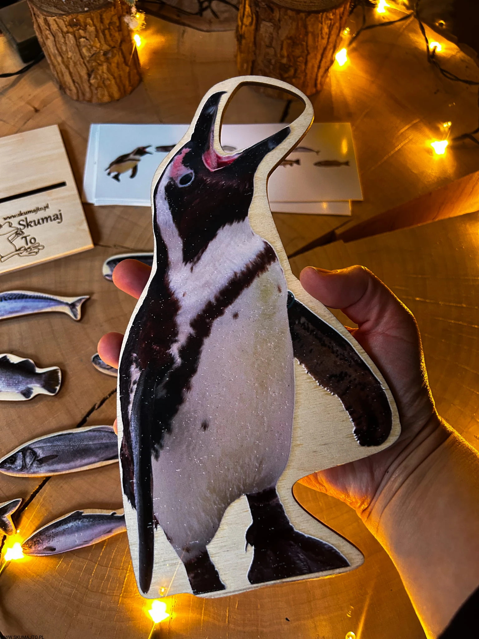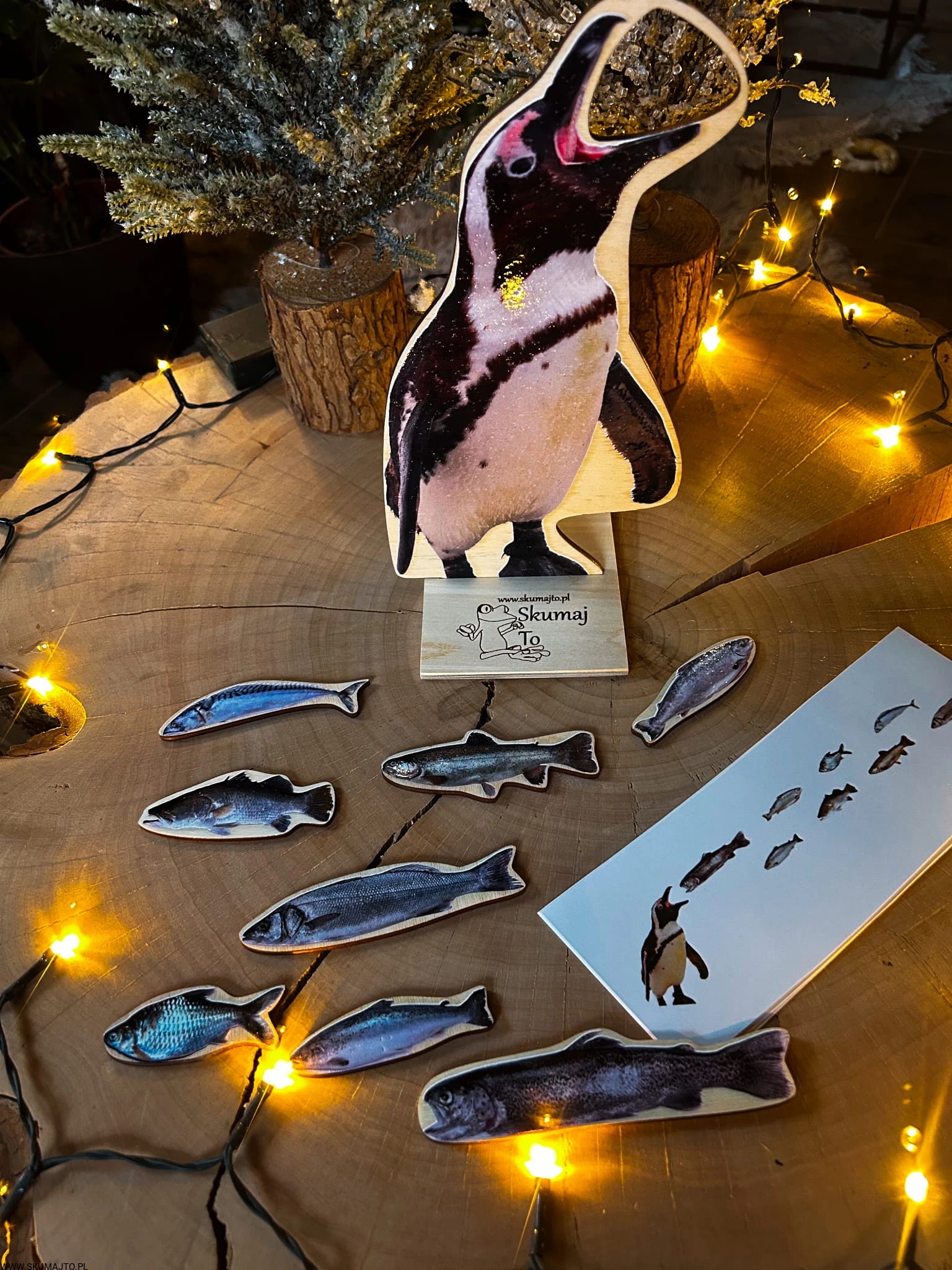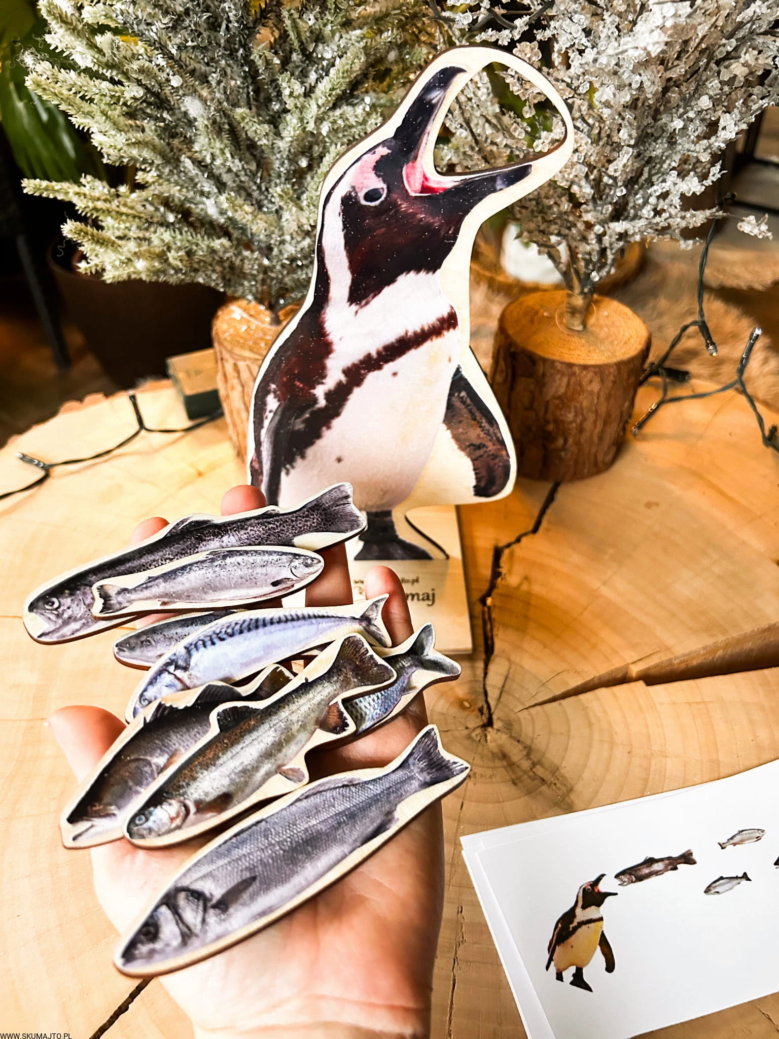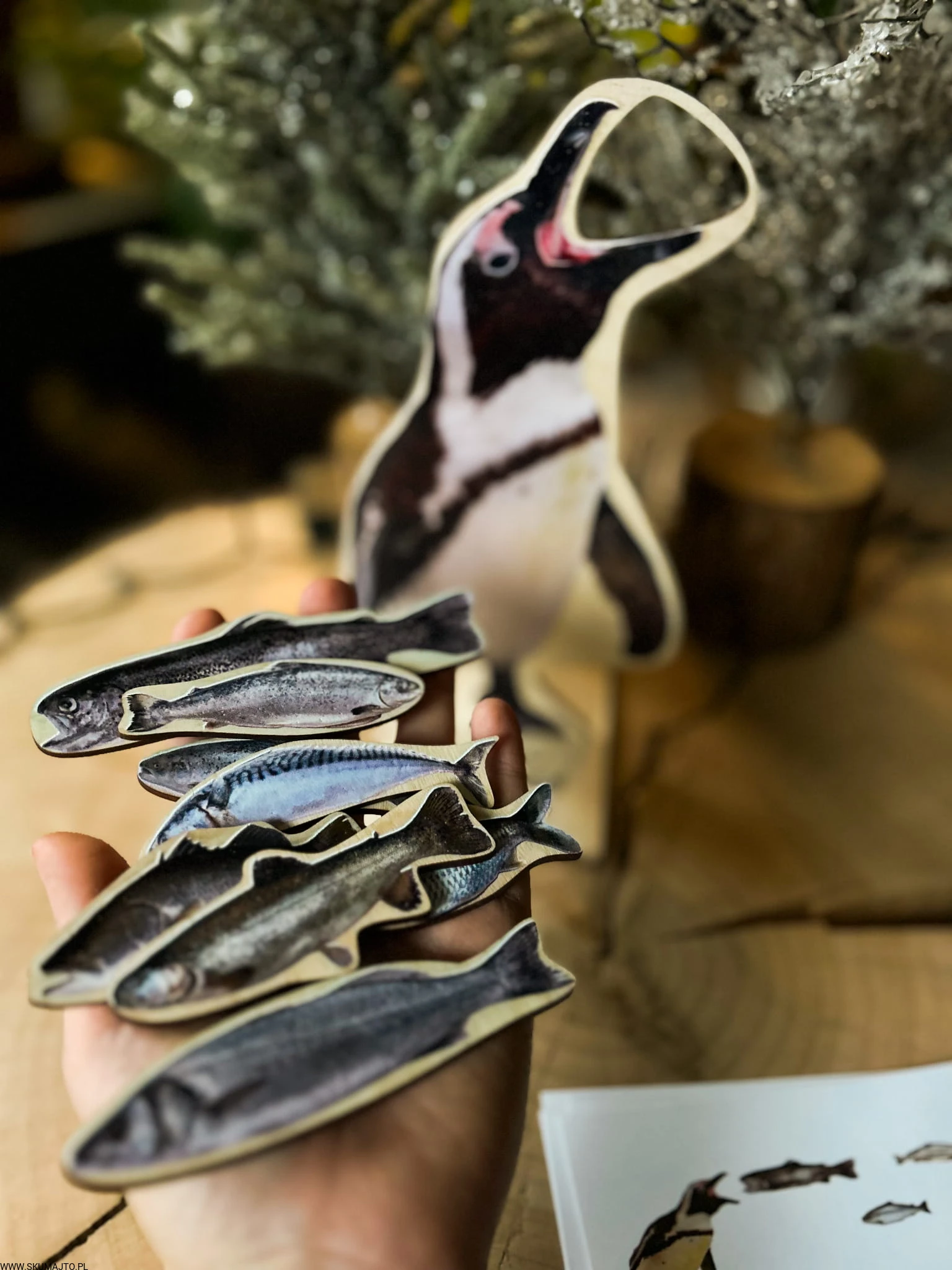 Pingwin o wysokości 25 cm stoi dumnie na swojej podstawce, czekając, aż ktoś poda mu smaczny posiłek. A co jedzą pingwiny? RYBY! Zestaw zawiera aż 8 realistycznych drewnianych rybek o długości ok. 5 cm, które dziecko musi umieścić w buzi pingwina. Ale to nie wszystko – dołączone karty odwzorowywania stawiają przed dzieckiem wyzwania, bo ryby trzeba podać w odpowiedniej kolejności.