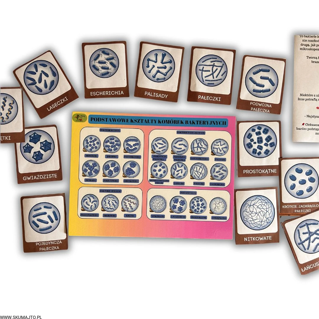 Większość dzieci (a nawet dorosłych!) zna bakterie tylko z rysunków w książkach lub bajkach, gdzie wszystkie wyglądają podobnie. A przecież w świecie mikroorganizmów kryje się fascynująca różnorodność kształtów i form, którą można odkrywać… nie tylko pod mikroskopem. Ta układanka to sposób, by przenieść lekcję biologii w zupełnie nowy wymiar – z nauki abstrakcyjnej w naukę, którą można… dotknąć, przesuwać i układać.