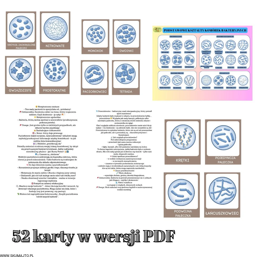 karty trójdzielne Montessori z podpisami każdego rodzaju bakterii i ich nazwami,