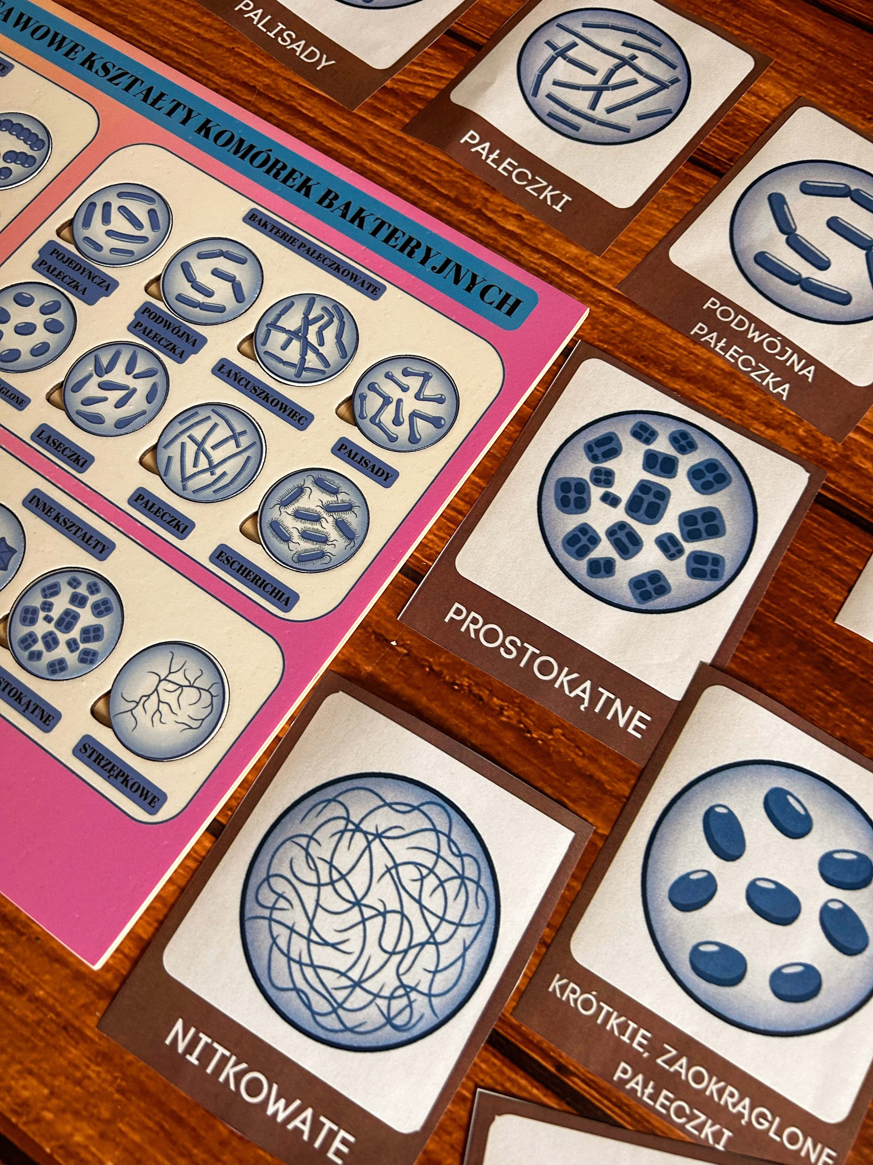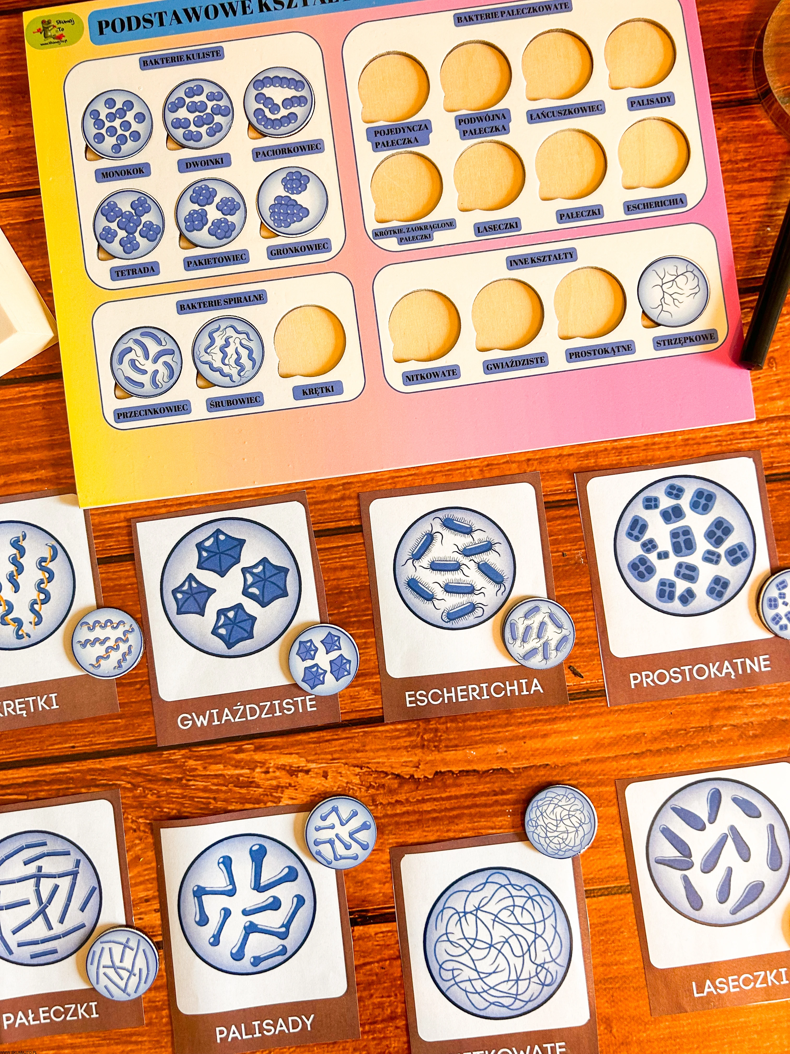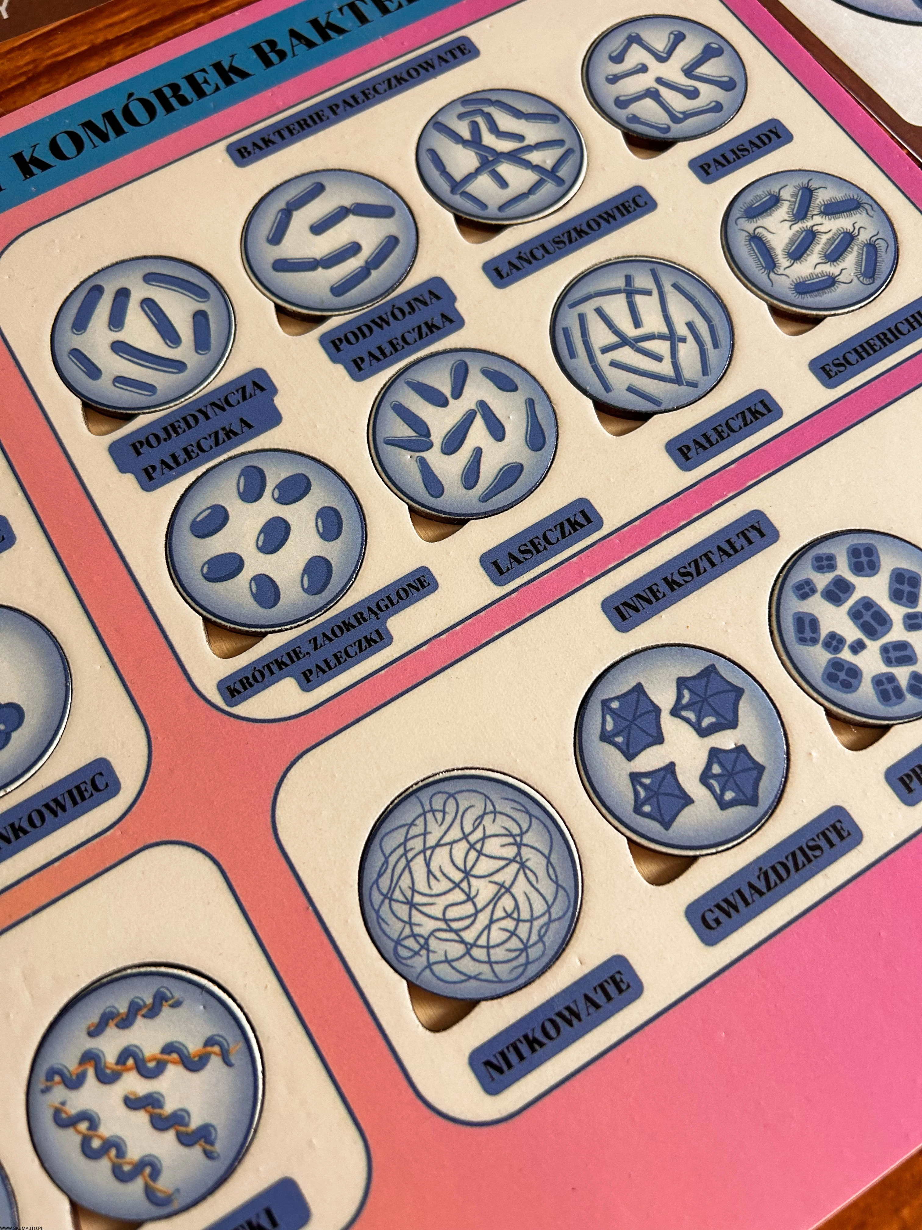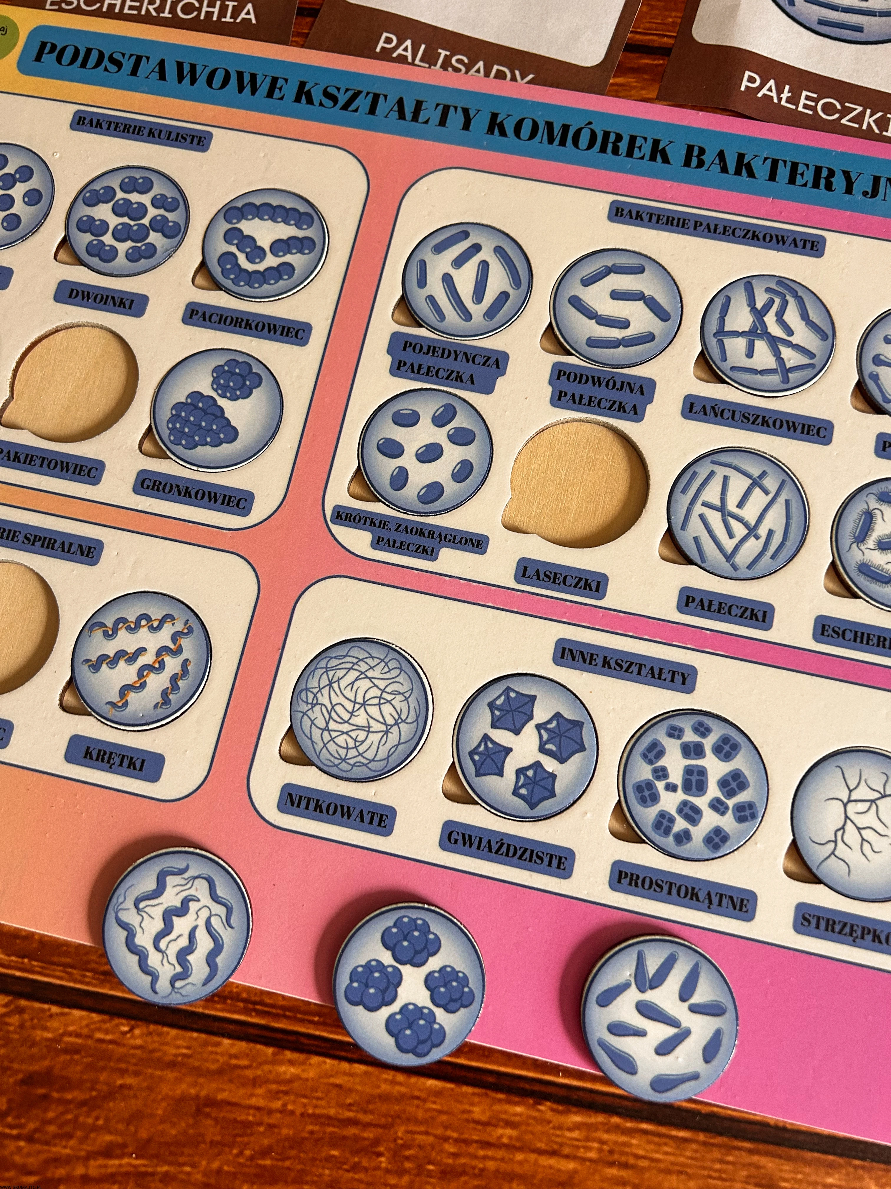 układanka bakterie, puzzle edukacyjne bakterie, pomoc Montessori biologia, kształty bakterii, edukacyjne puzzle dla dzieci, nauka biologii Montessori, podstawowe kształty komórek bakteryjnych, pomoce edukacyjne mikrobiologia, plansza edukacyjna bakterie, zabawka edukacyjna biologia.