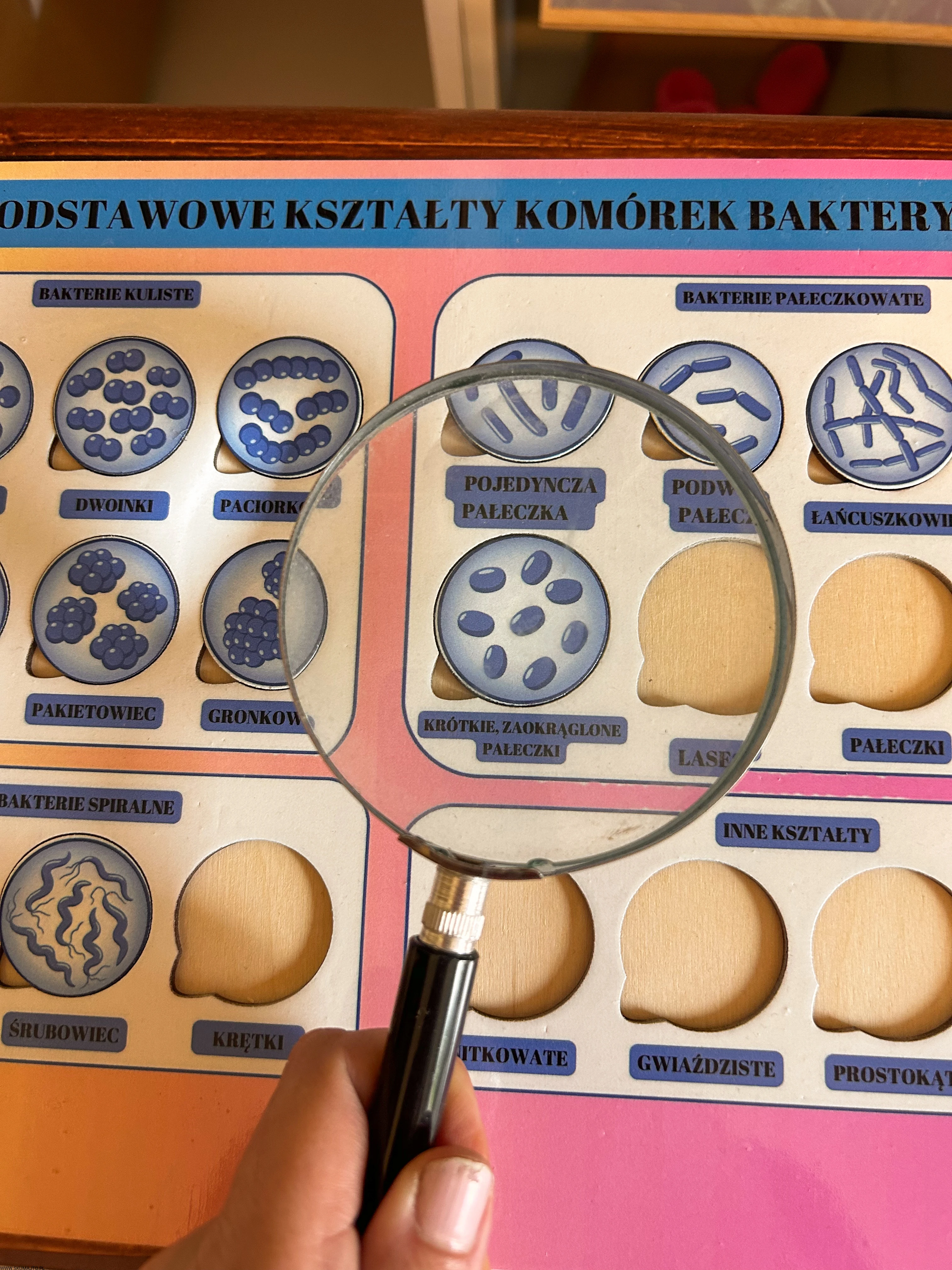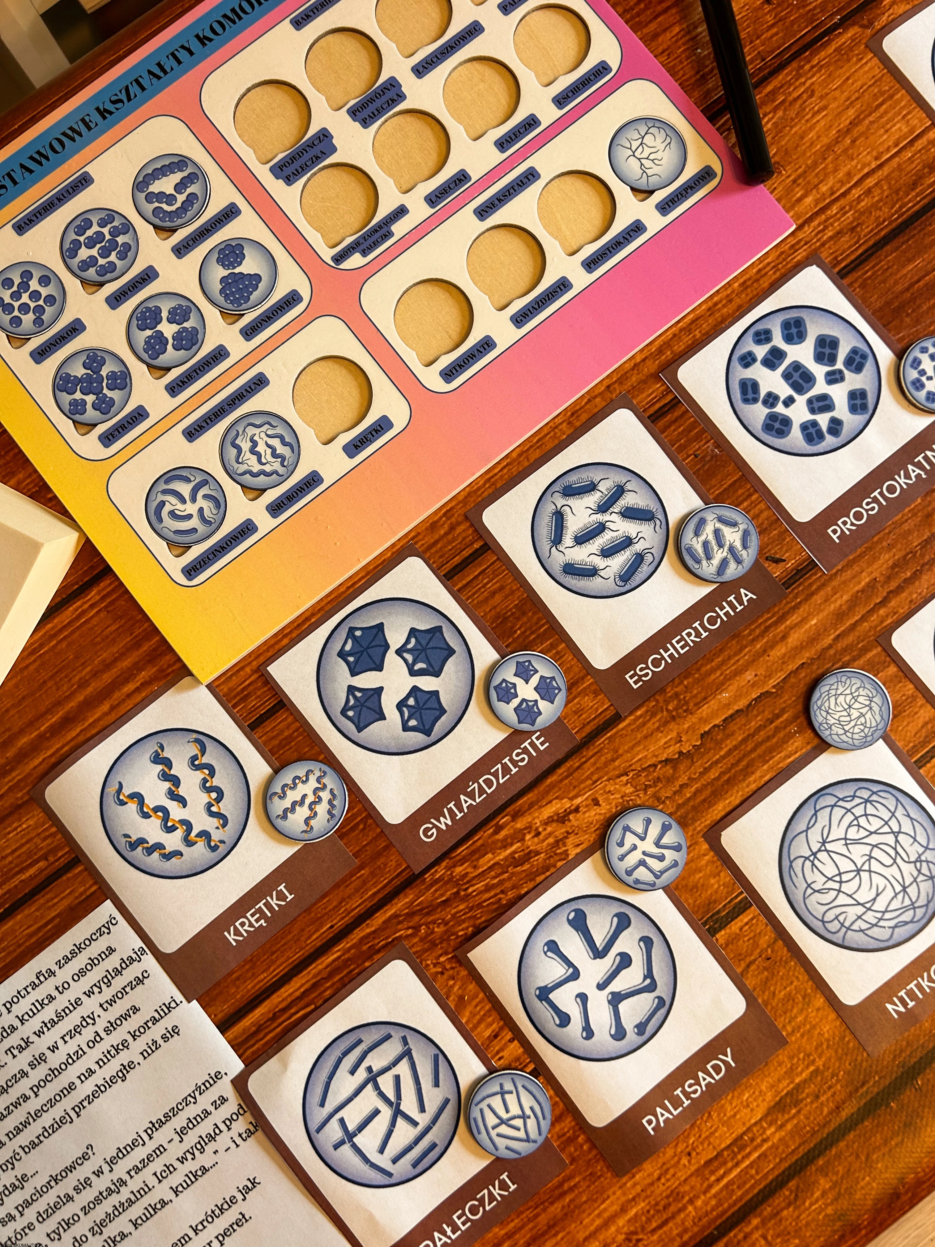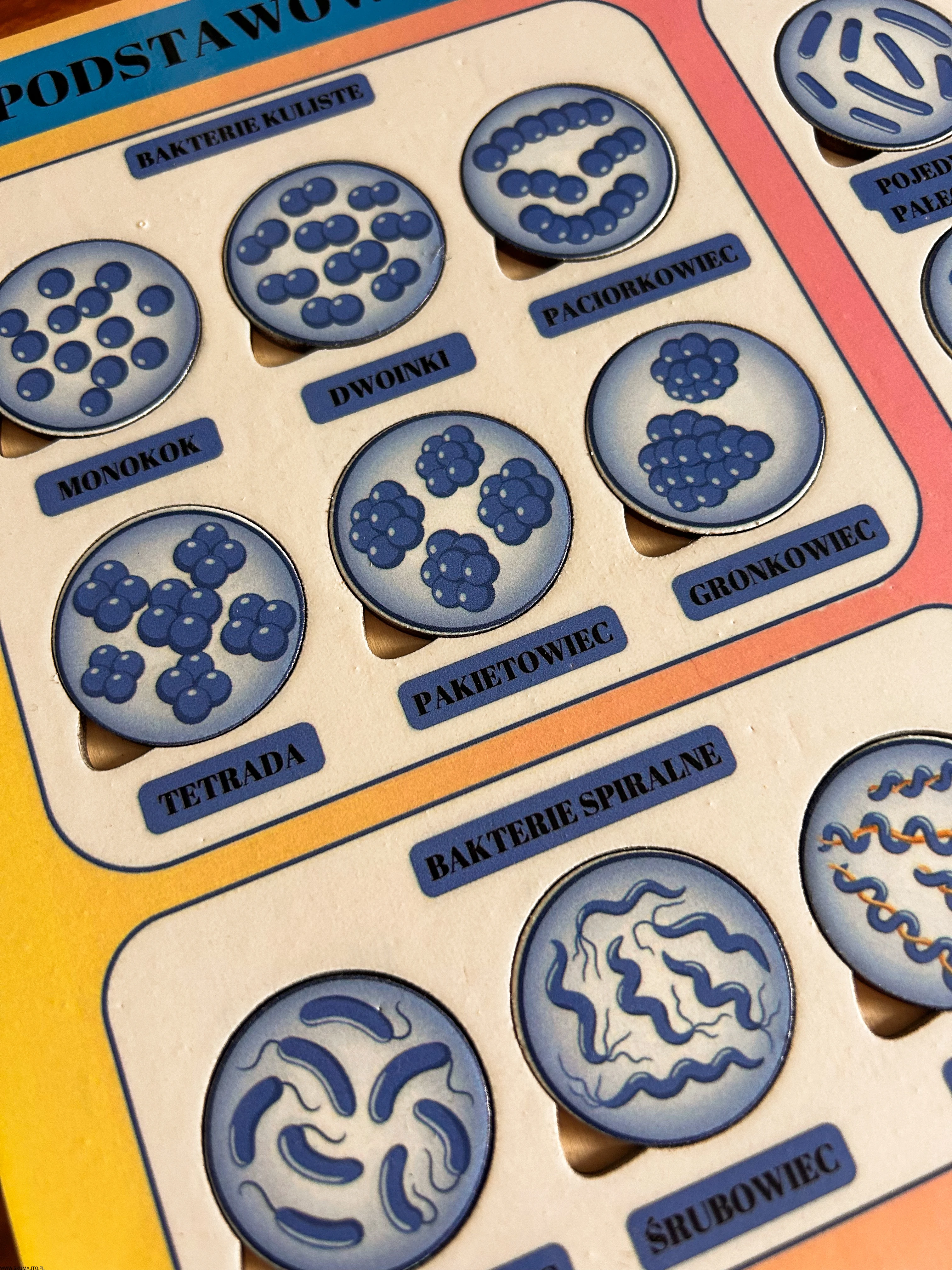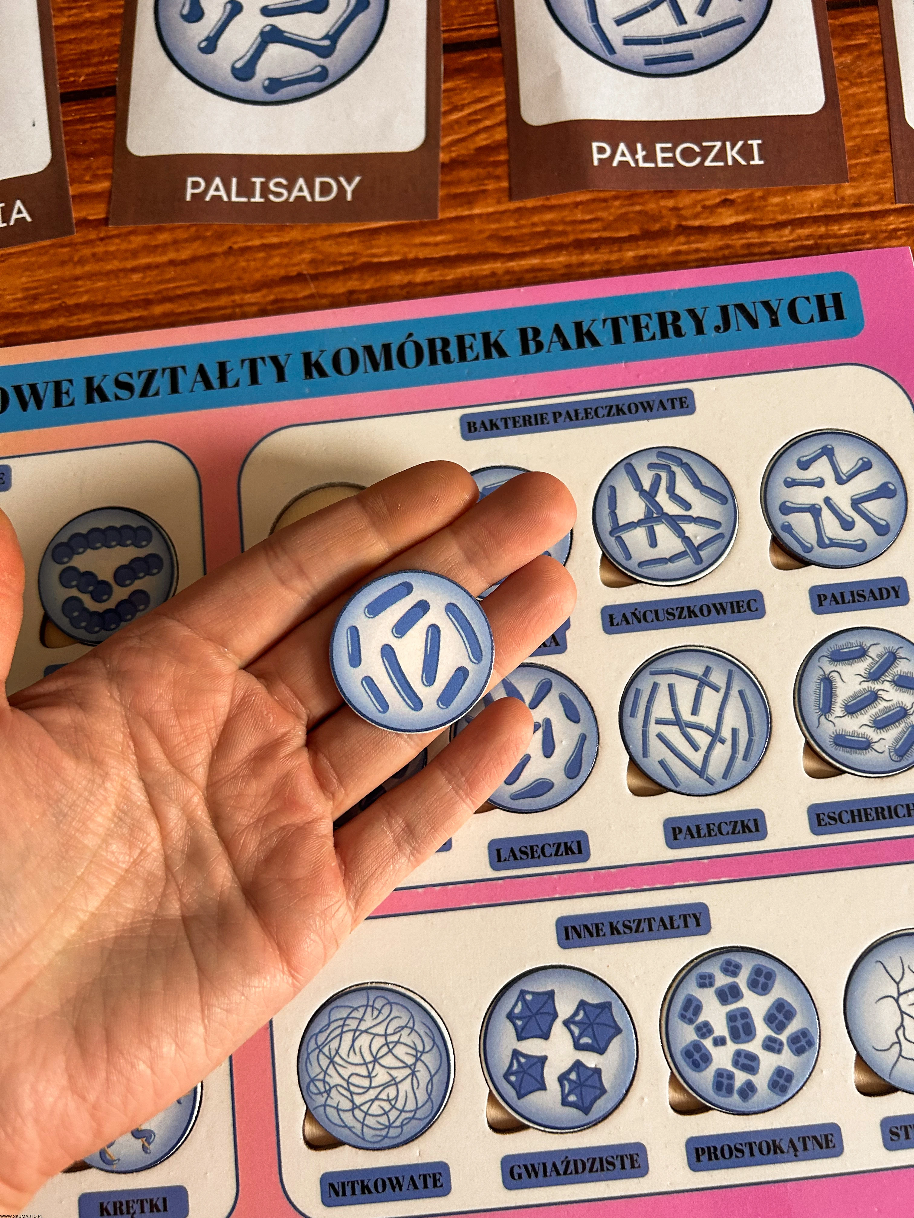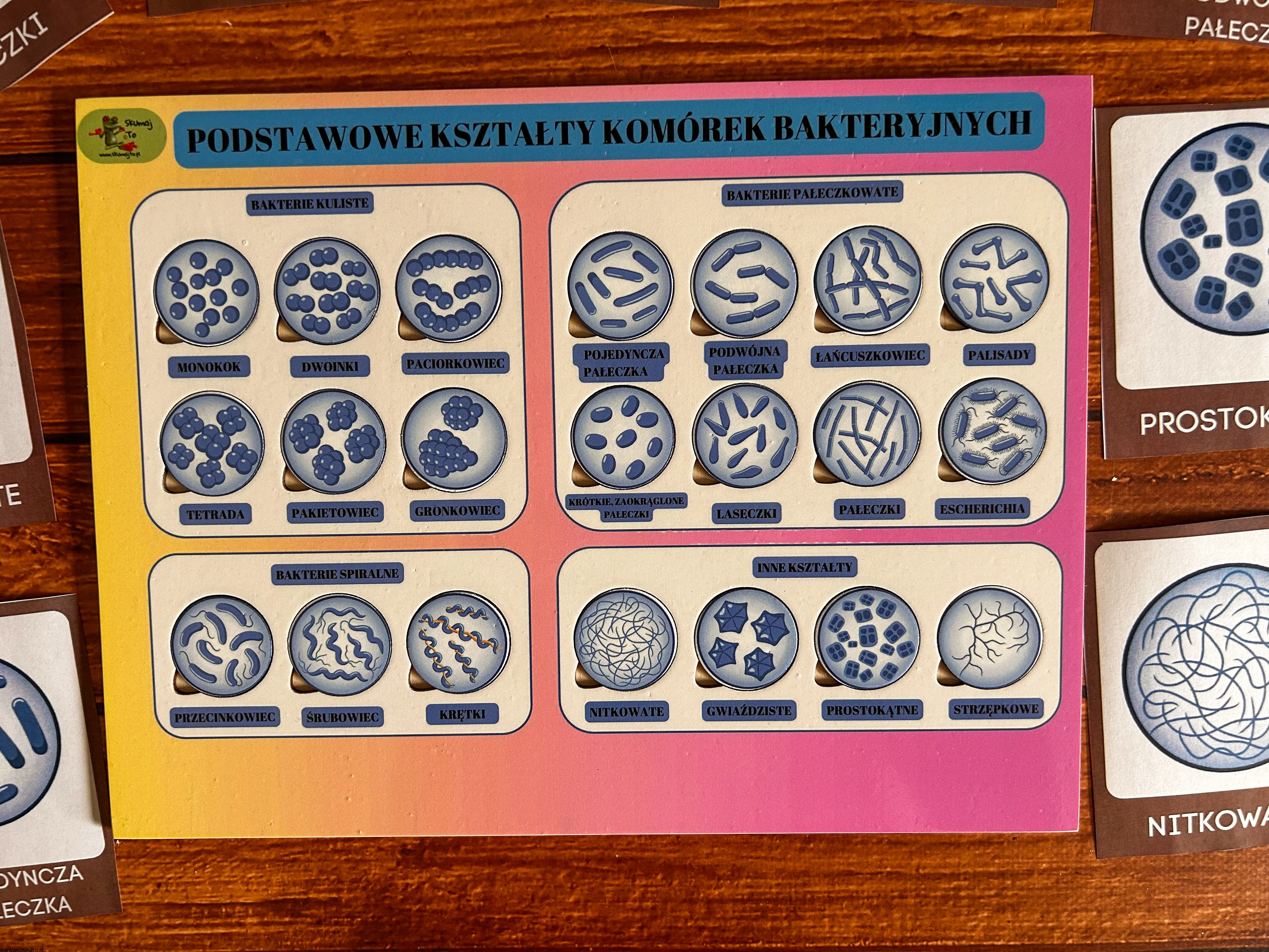 układanka bakterie, puzzle edukacyjne bakterie, pomoc Montessori biologia, kształty bakterii, edukacyjne puzzle dla dzieci, nauka biologii Montessori, podstawowe kształty komórek bakteryjnych, pomoce edukacyjne mikrobiologia, plansza edukacyjna bakterie, zabawka edukacyjna biologia.