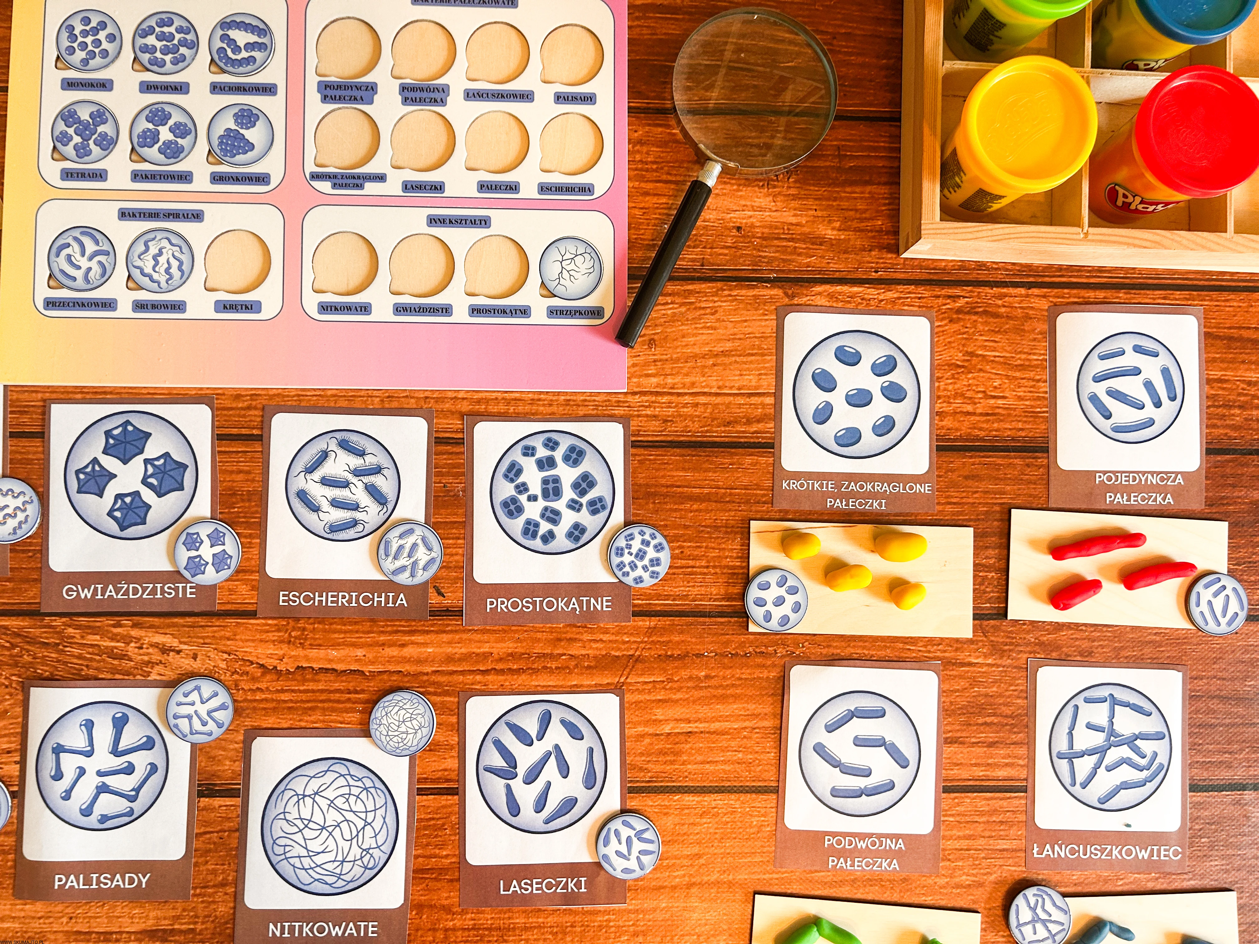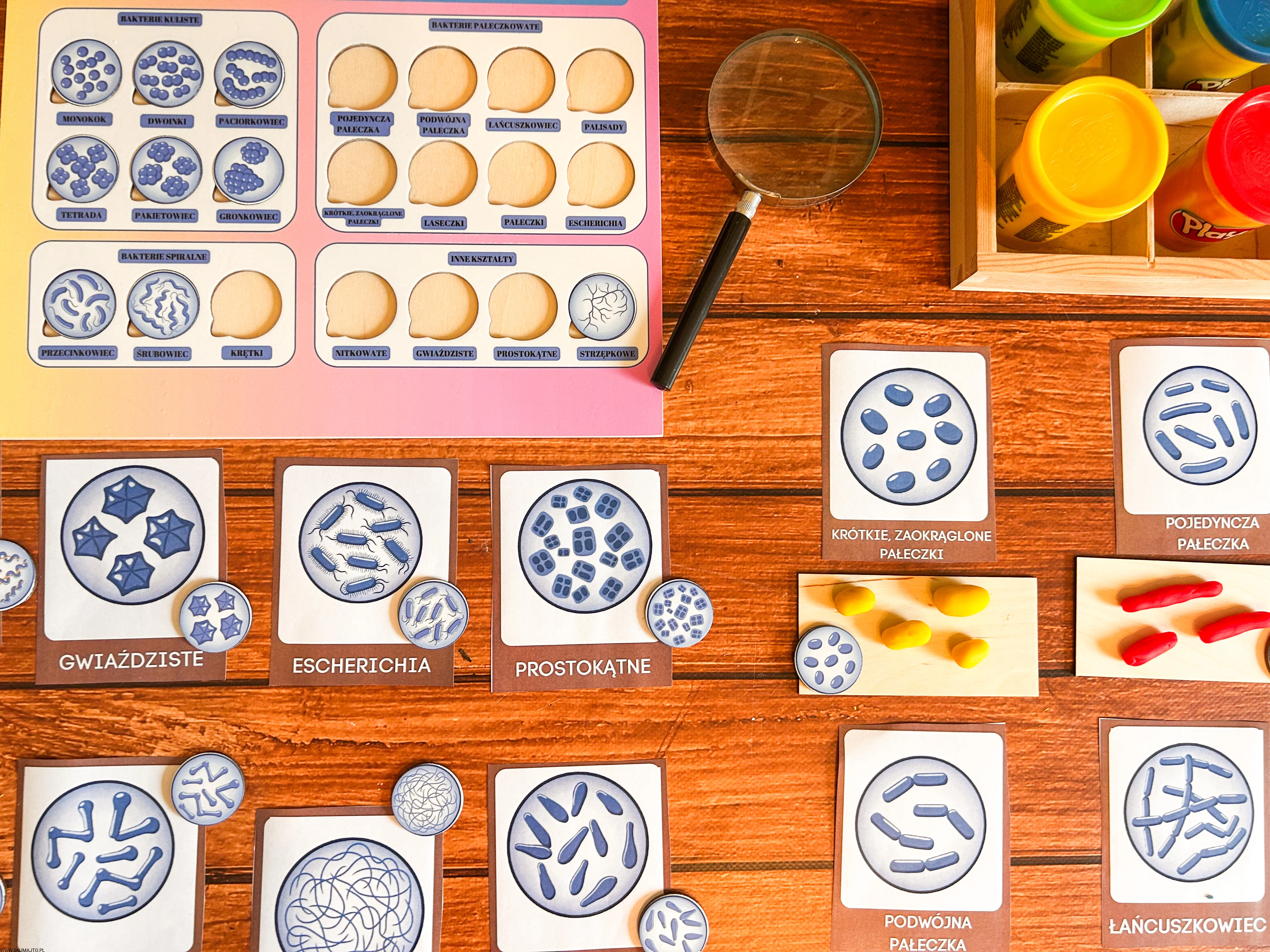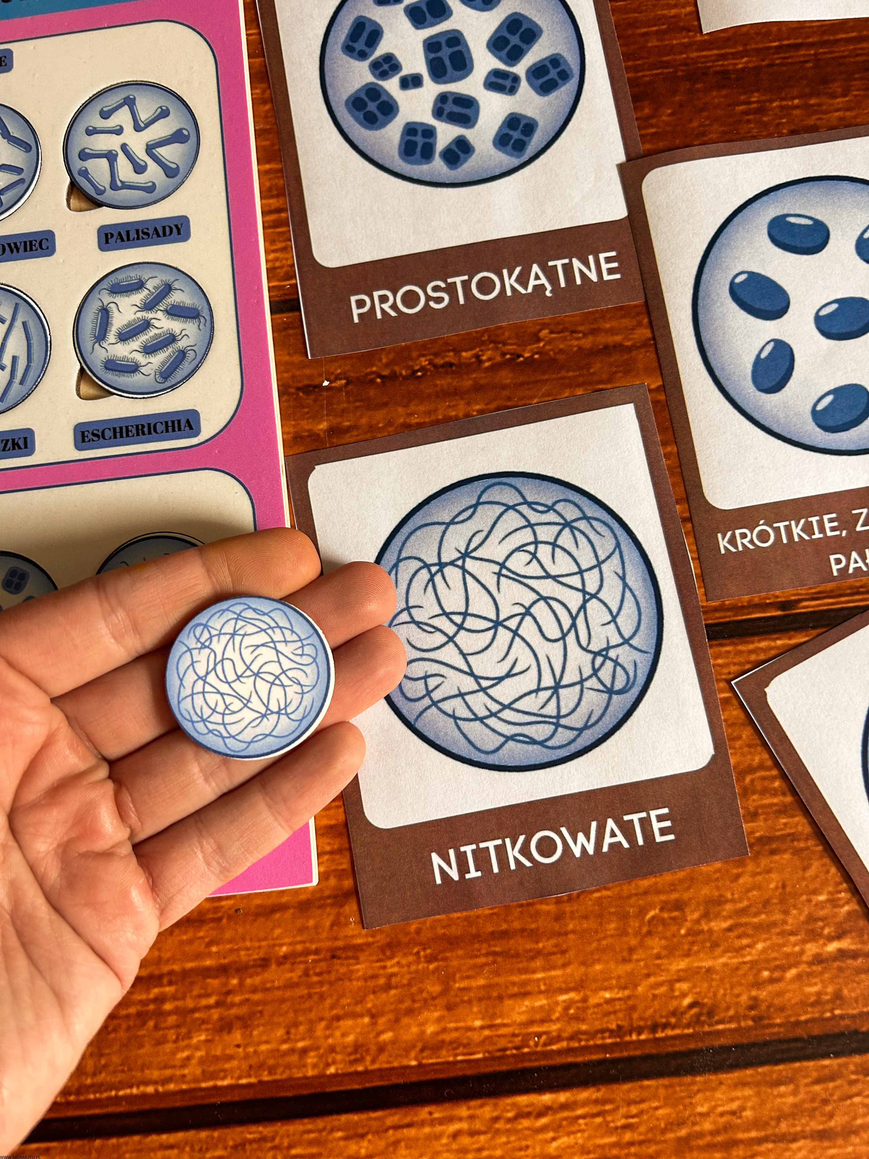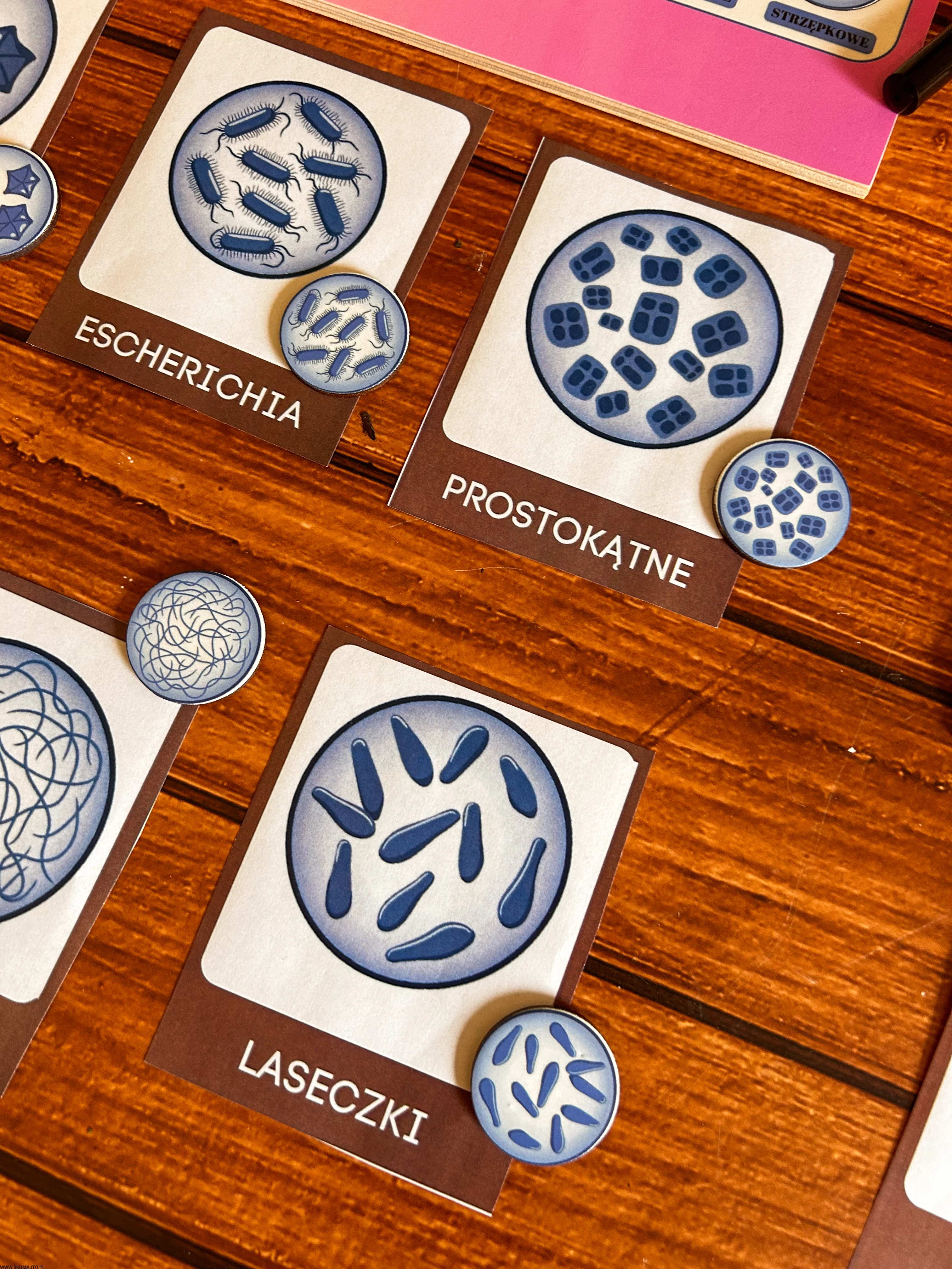 układanka bakterie, puzzle edukacyjne bakterie, pomoc Montessori biologia, kształty bakterii, edukacyjne puzzle dla dzieci, nauka biologii Montessori, podstawowe kształty komórek bakteryjnych, pomoce edukacyjne mikrobiologia, plansza edukacyjna bakterie, zabawka edukacyjna biologia.