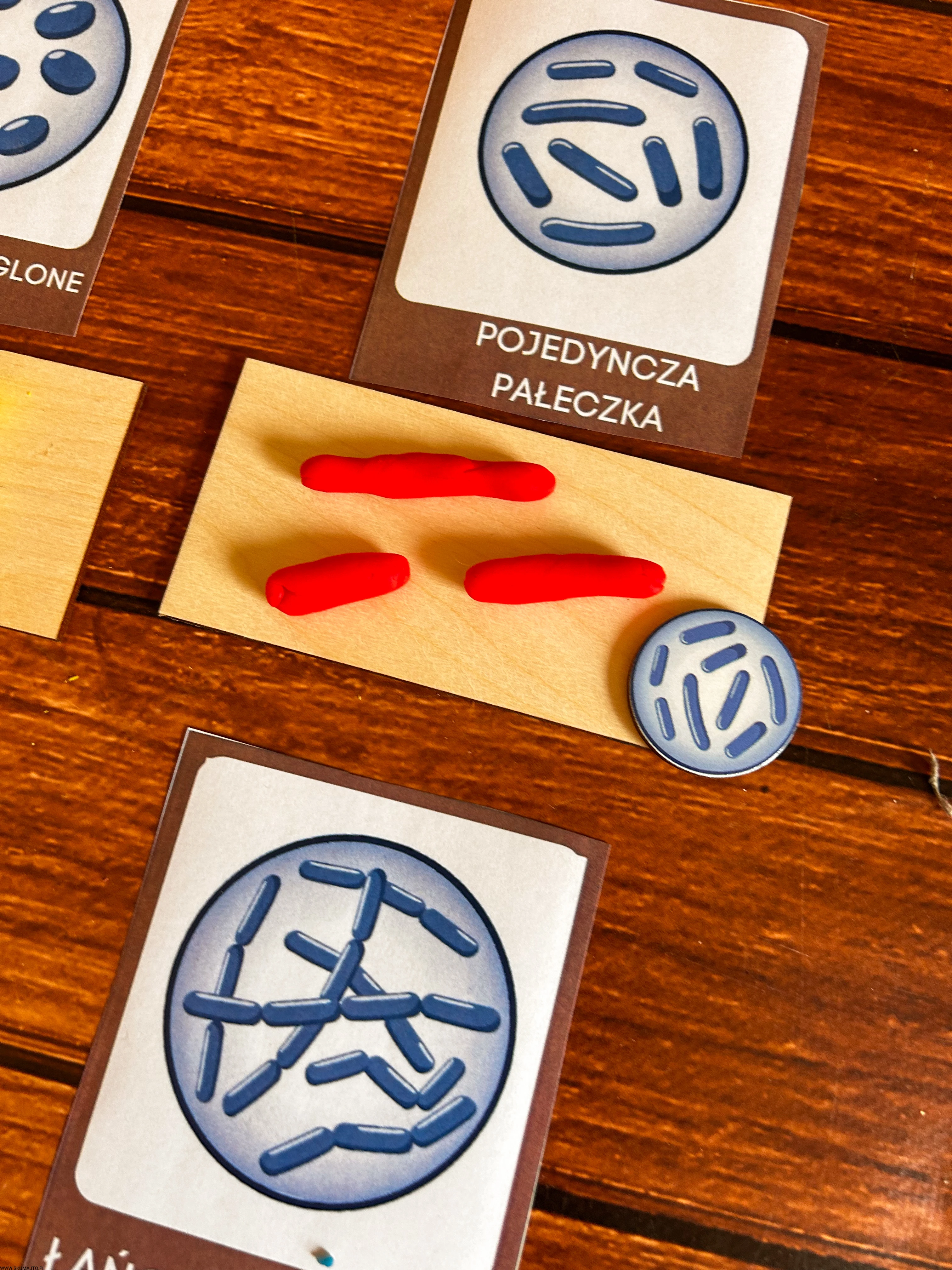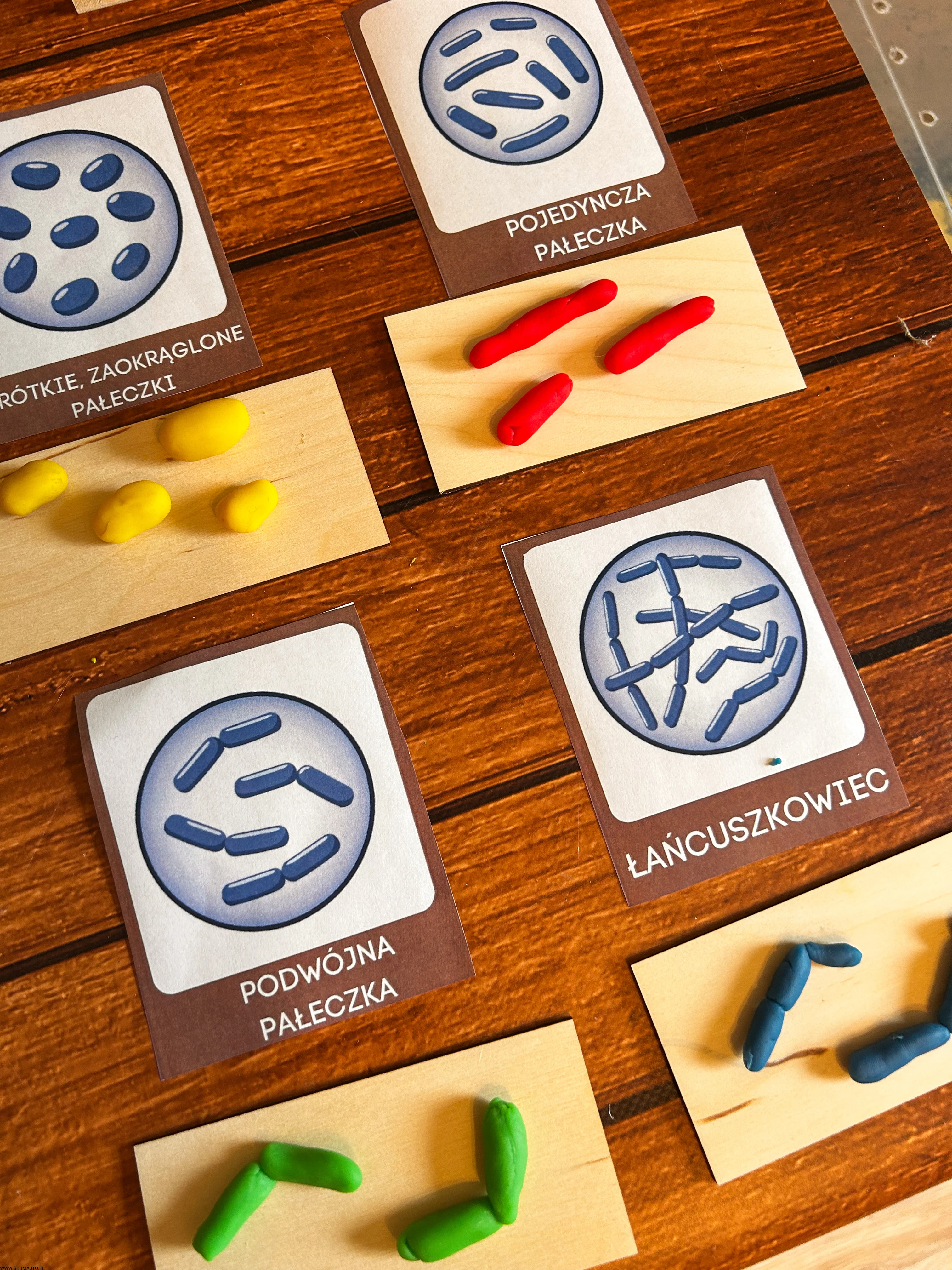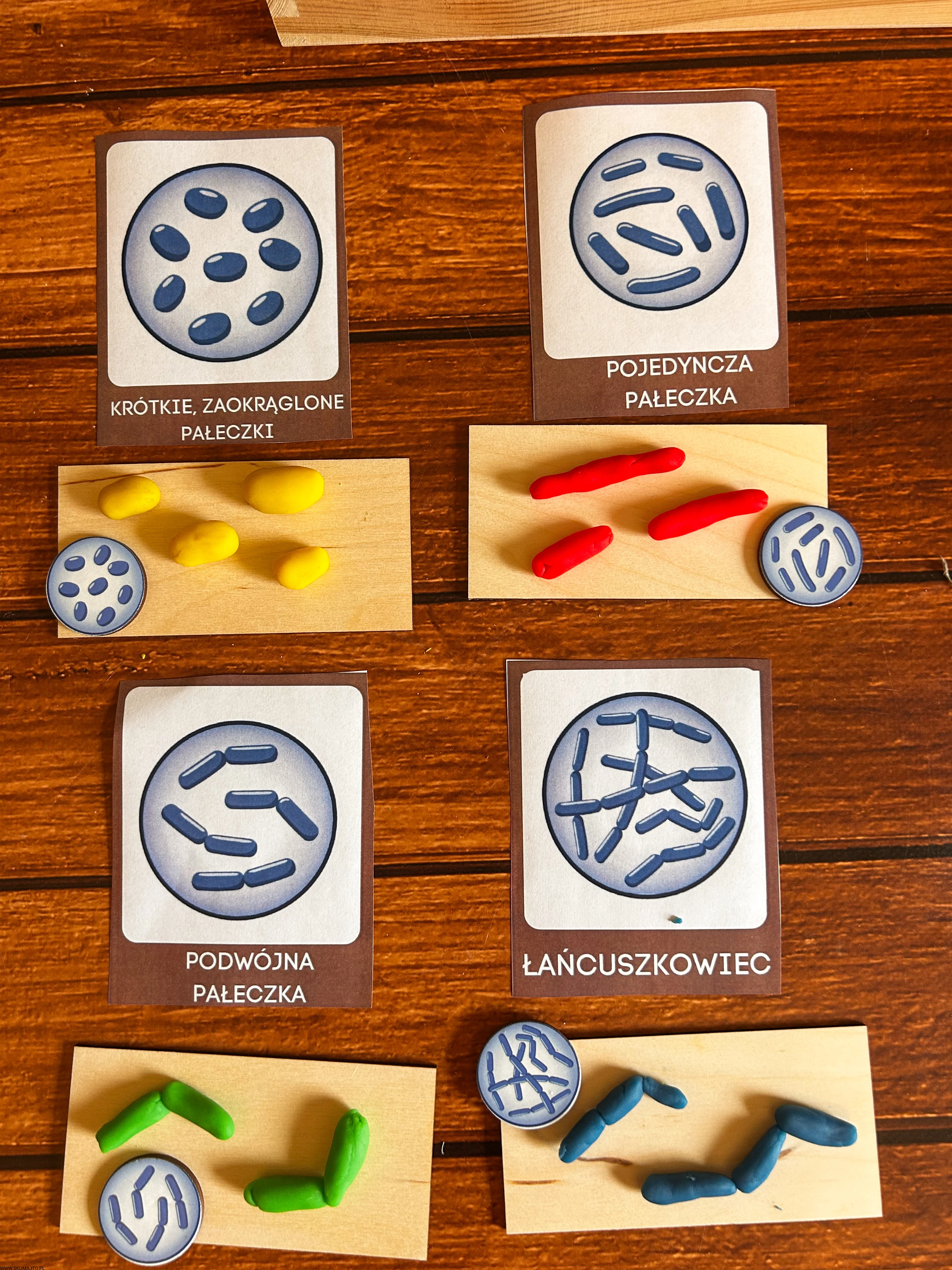 Podstawowe kształty komórek bakteryjnych, drewniana układanka, komórka bakterii, kształty bakterii